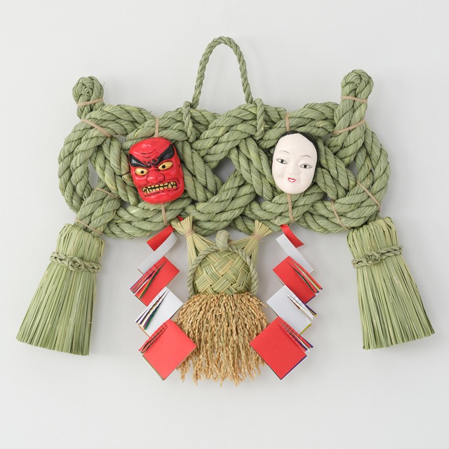 □ 商品説明 商品名:わらの壁掛け(わらのかべかけ) サイズ:縦58cm×横70cm ※色合いやサイズには個体差がございます。 ------------ 家内安全や力強い繋がり、仕事の成功などの願いが込められた力強く美しい横綱結びに、高千穂神話の力持ちの神様である手力雄命(タヂカラオノミコト)と、芸能の神様である天鈿女命(アマノウズメノミコト)の面、祝亀、五色の御幣を彩った縁起物のお飾りです。 彩られているお面に登場しているお二方は、天照大神(アマテラスオオミカミ)が岩戸へお隠れになったという天岩戸の神話が残る高千穂と縁の深い神様です。 天孫降臨の地、お米作りが始まった場所と言われている土地で育った青藁を使い作られたわら細工を、縁の深い神様と一緒に。 たくぼさんの土地に根付いた仕事と共に、神話の里である高千穂郷の空気感をお届けできましたら幸いです。 □ 作り手紹介 テクラ|Story|わら細工たくぼ https://tekura.net/warazaiku-takubo/ □ 取扱い方法、経年変化について テクラ|How to care|わら細工たくぼ https://tekura.net/care-warazaiku/ □ ご発送に際してのお願い ご注文を頂きましてからご発送まで数日(1~6日)お時間を頂きます。また、繁忙期(11月〜12月)には1週間から10日ほどかかる場合がございます。お手元までお時間を頂きますが宜しくお願い申し上げます。