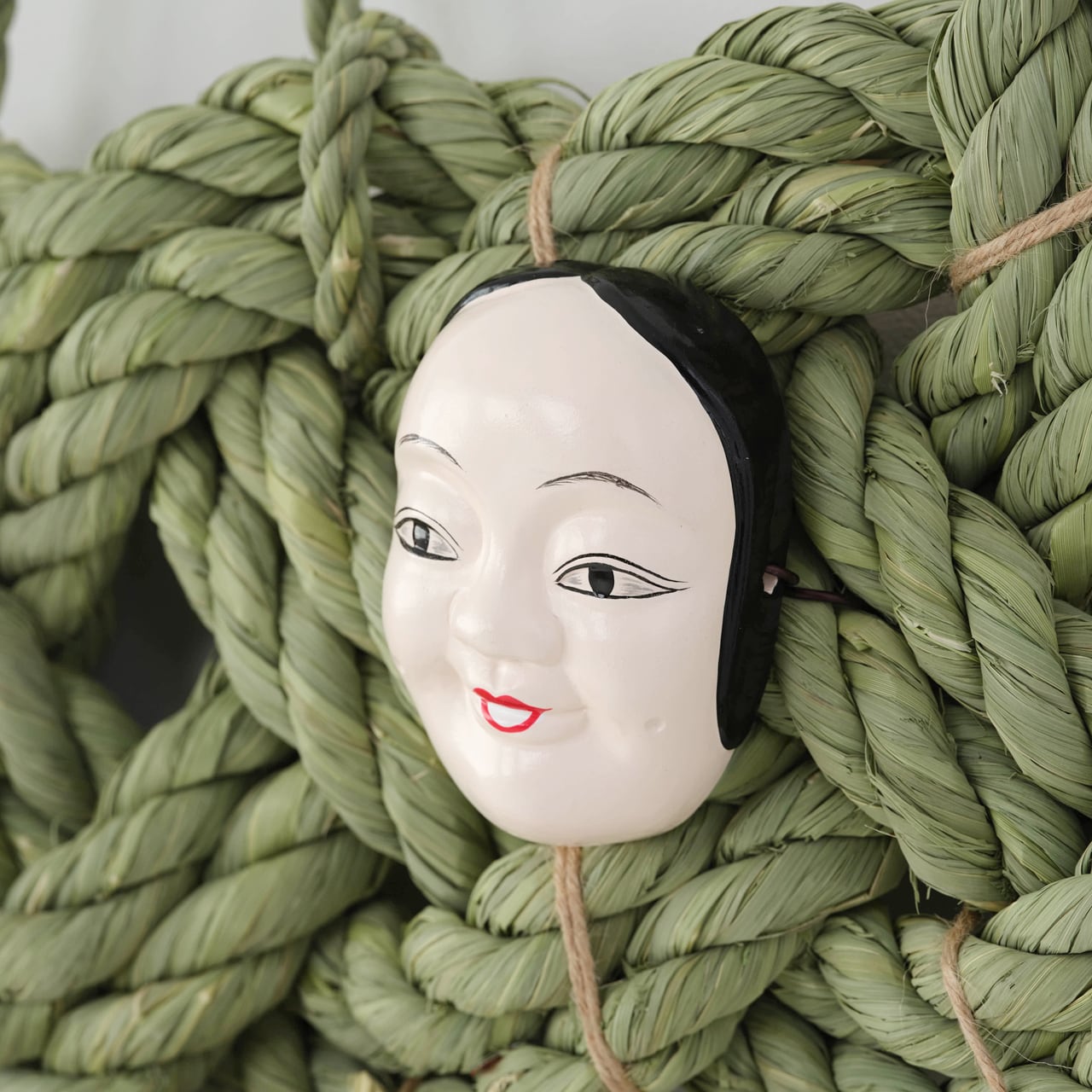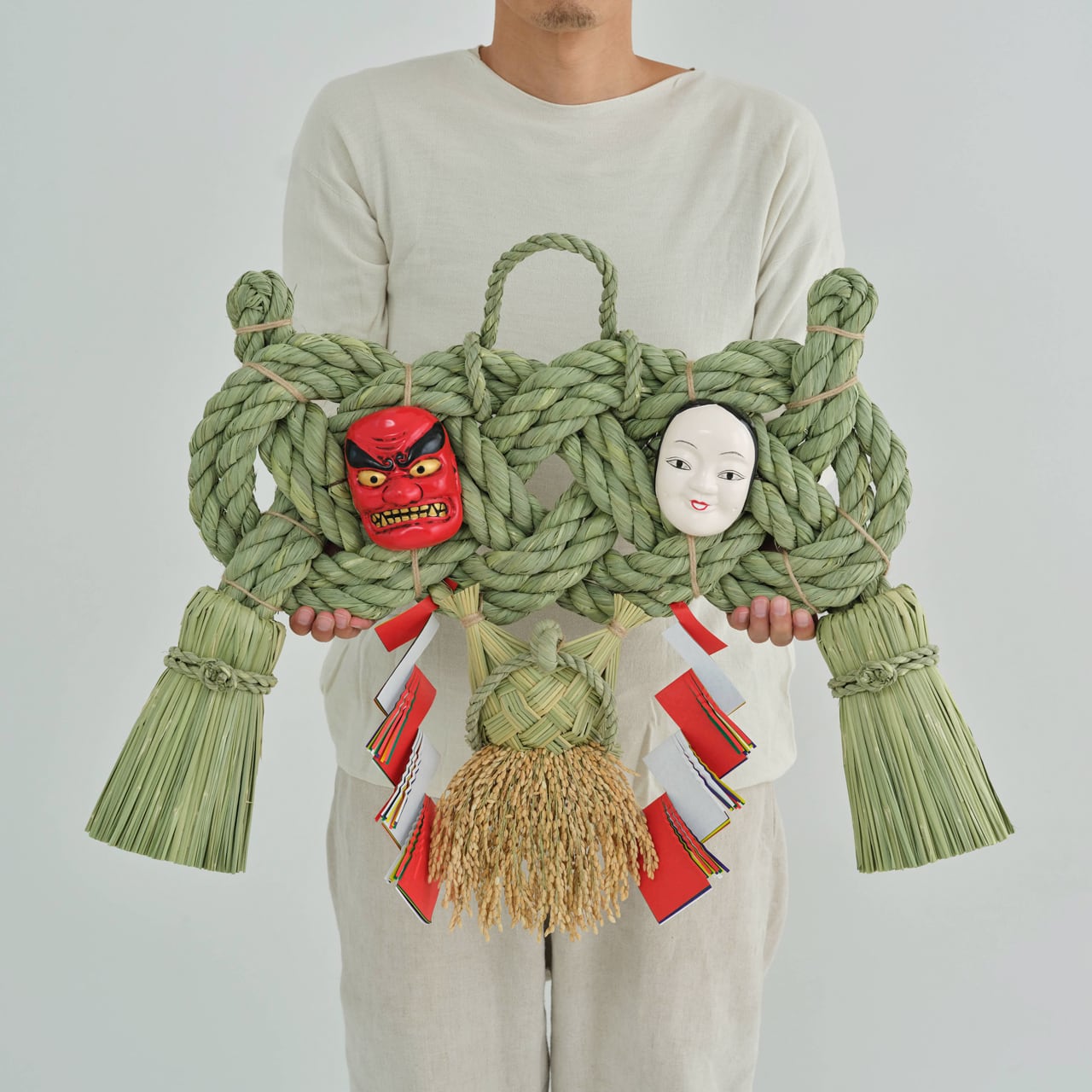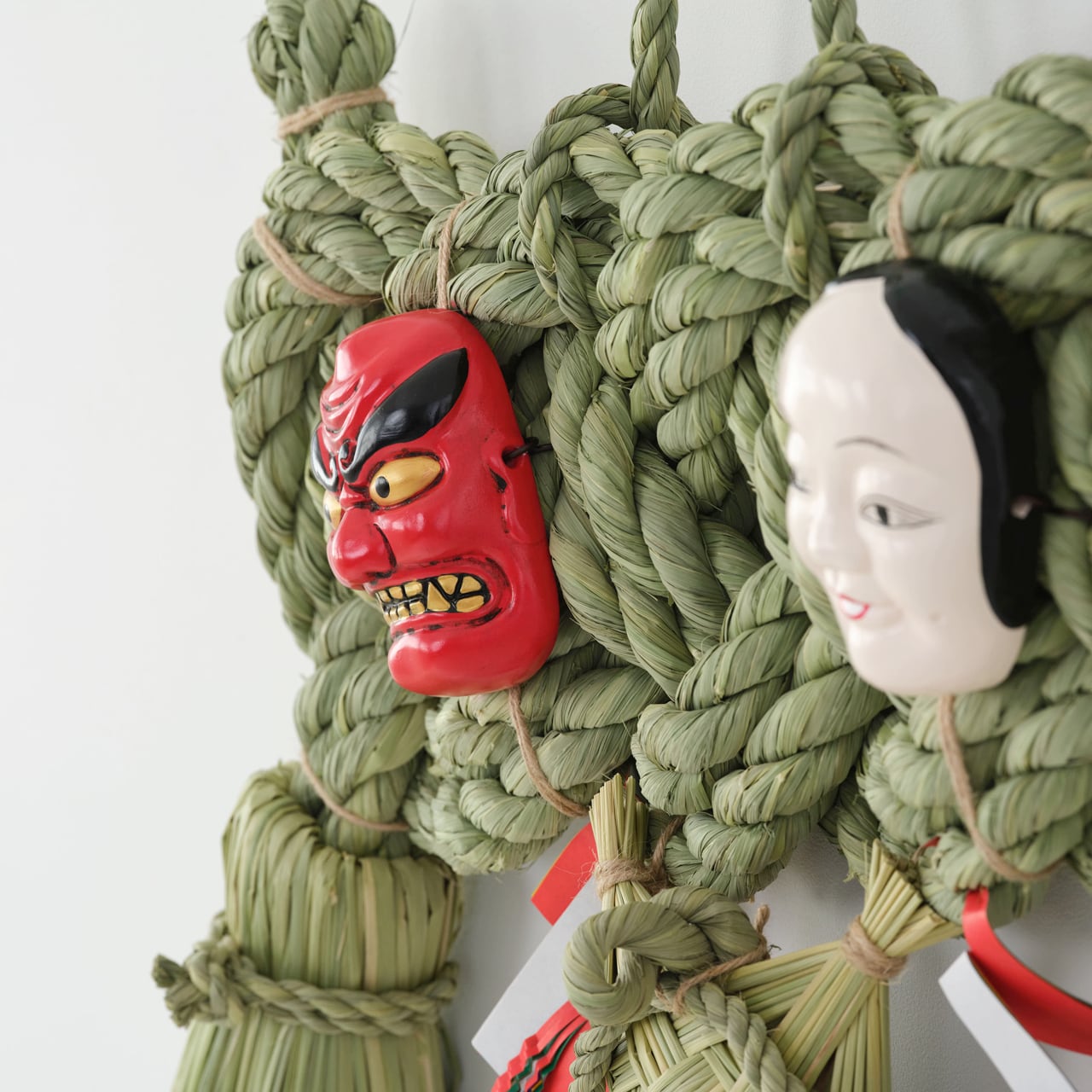 家内安全や力強い繋がり、仕事の成功などの願いが込められた力強く美しい横綱結びに、高千穂神話の力持ちの神様である手力雄命(タヂカラオノミコト)と、芸能の神様である天鈿女命(アマノウズメノミコト)の面、祝亀、五色の御幣を彩った縁起物のお飾りです。