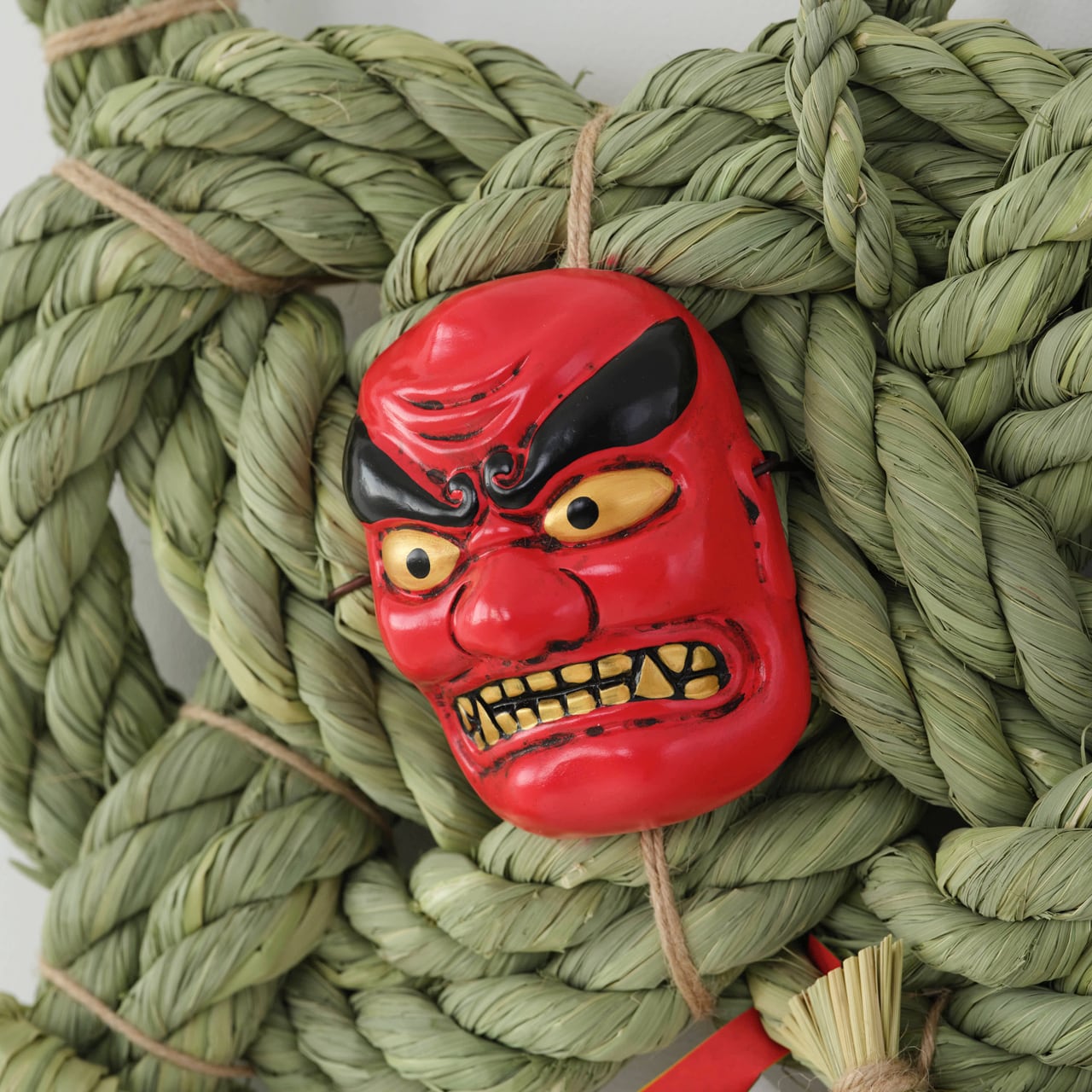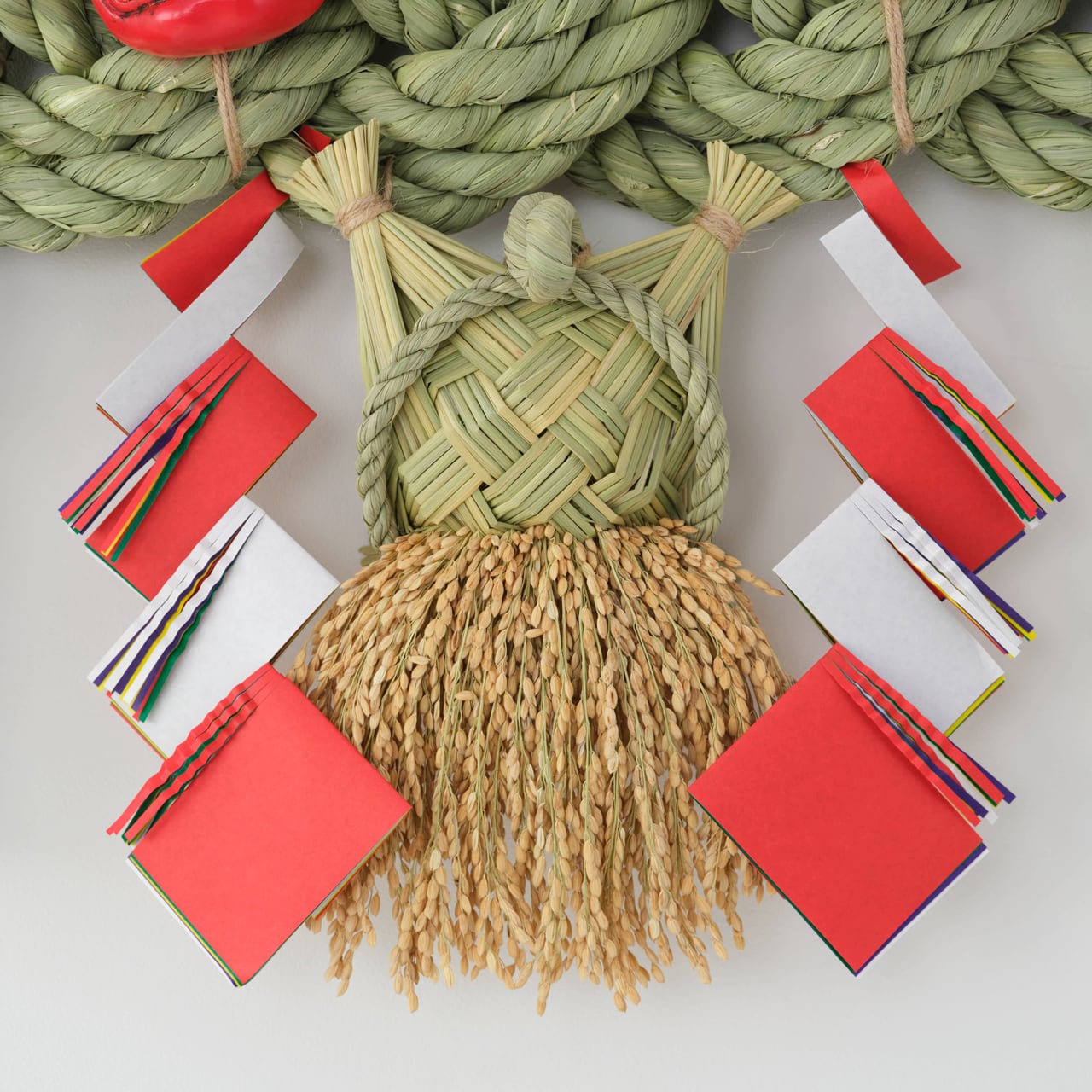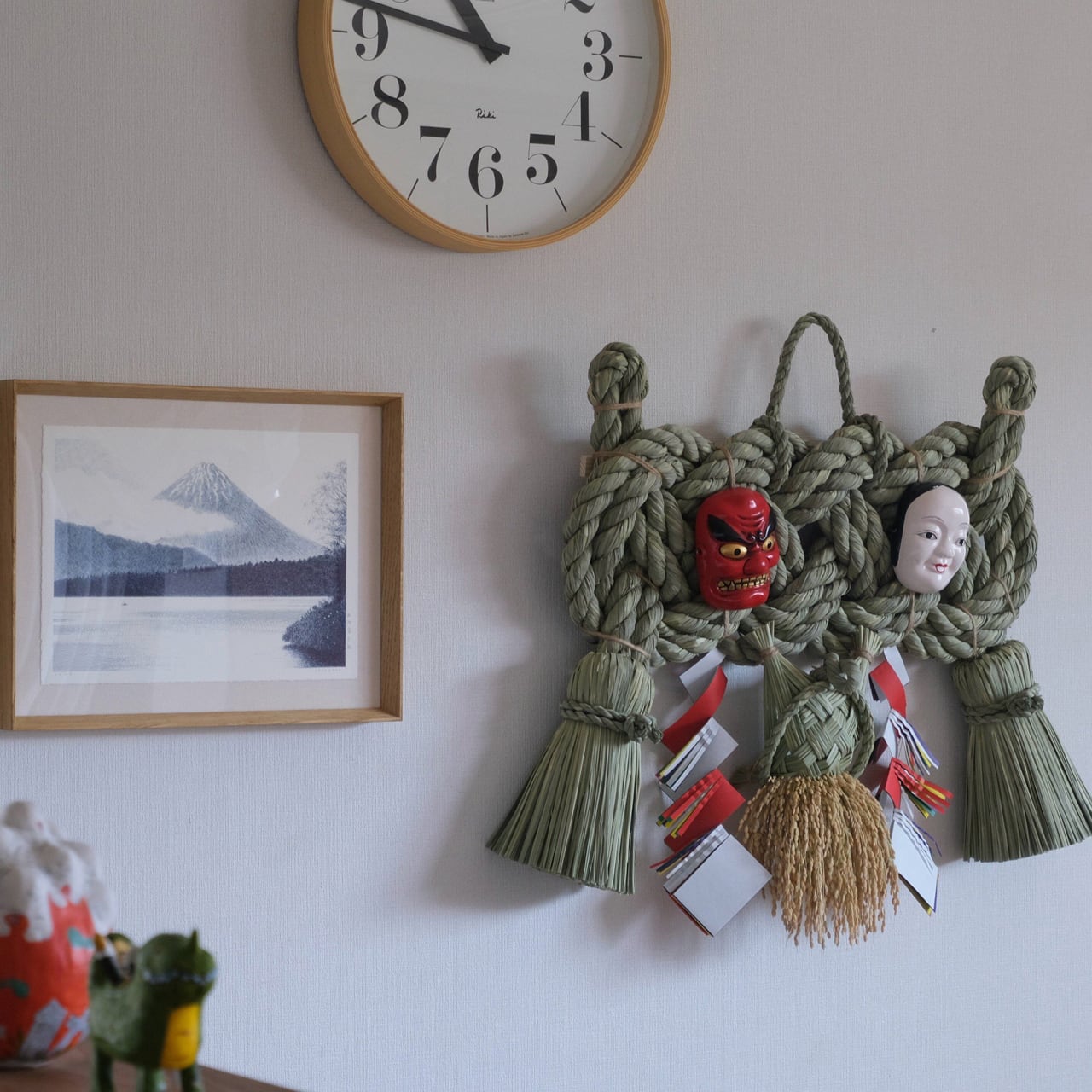 家内安全や力強い繋がり、仕事の成功などの願いが込められた力強く美しい横綱結びに、高千穂神話の力持ちの神様である手力雄命(タヂカラオノミコト)と、芸能の神様である天鈿女命(アマノウズメノミコト)の面、祝亀、五色の御幣を彩った縁起物のお飾りです。