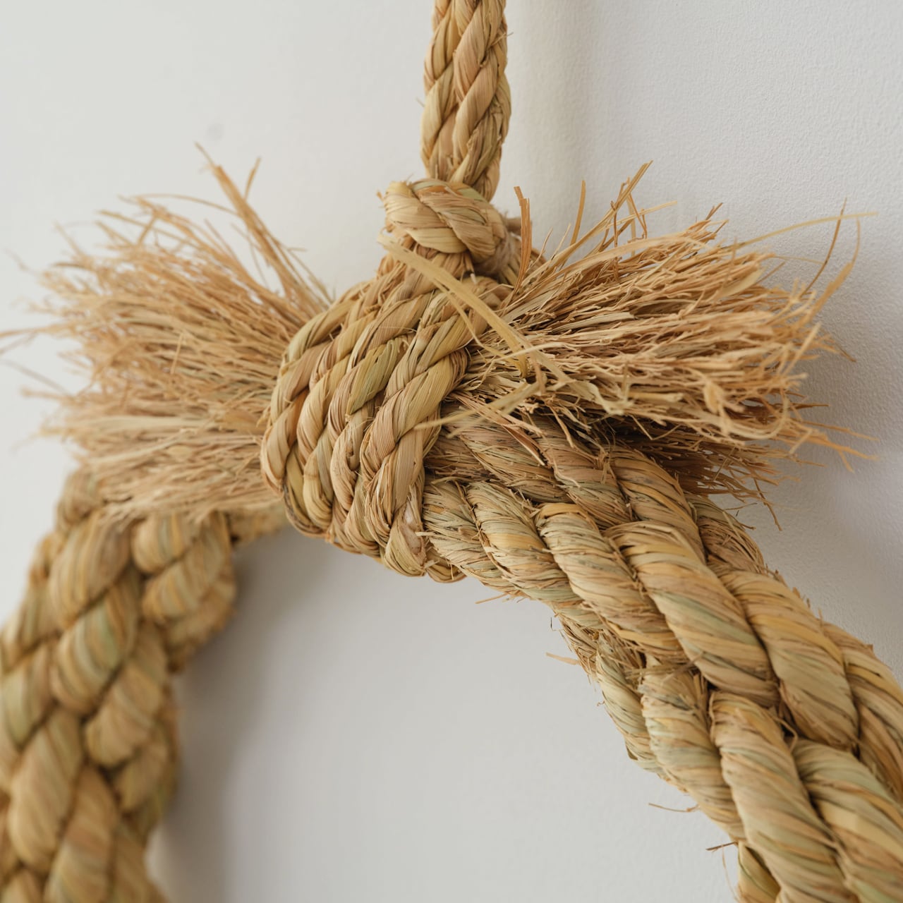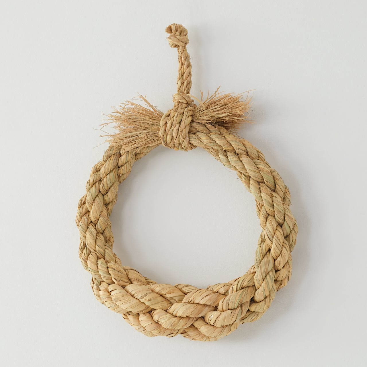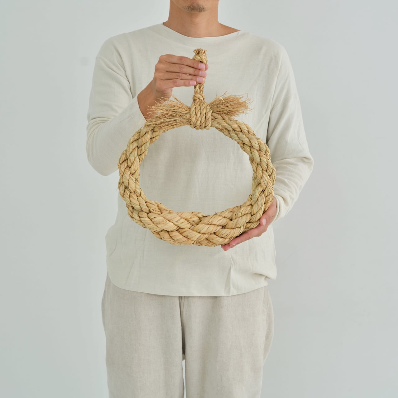 七五三縄(しめなわ)を作る際に使われる左綯いの縄三本を更に左綯いで綯い上げ、まあるく形作られた宝珠は、稲藁と縄の生き生きとした力強さと柔らかさを感じて頂ける一品です。