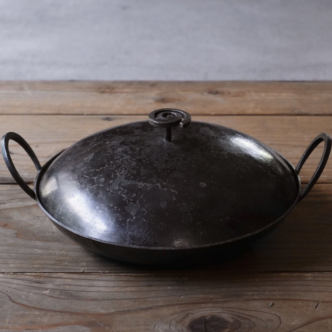 クルクルっとしたデザインや叩いた鉄の表情が愛らしい蓋のつまみ。実は置いた時に自立するようにとの想いから生まれた形です。蓋が付いていると蒸すようなお料理にも活躍しますね。アサリの酒蒸しなどにも良さそうです。