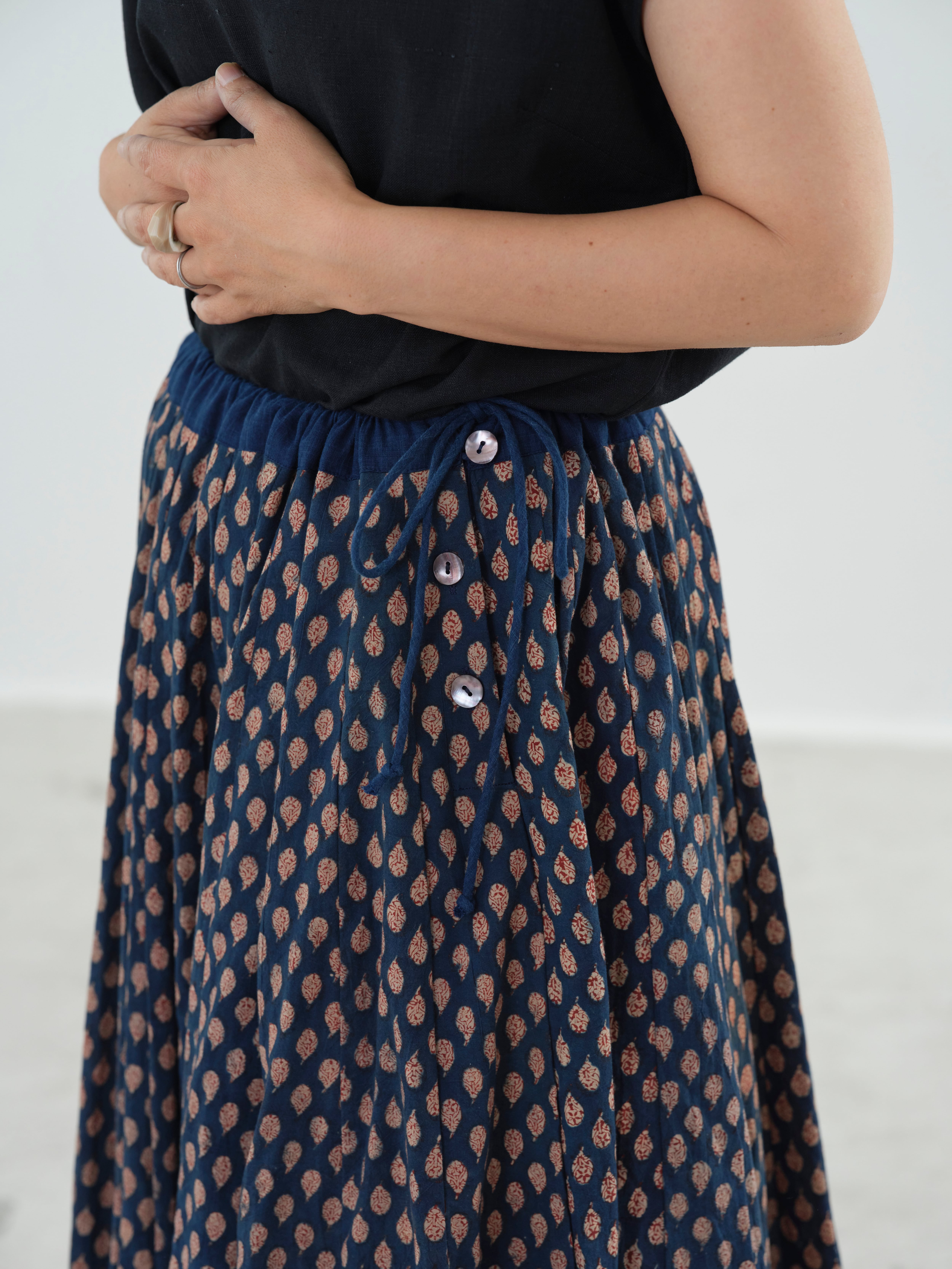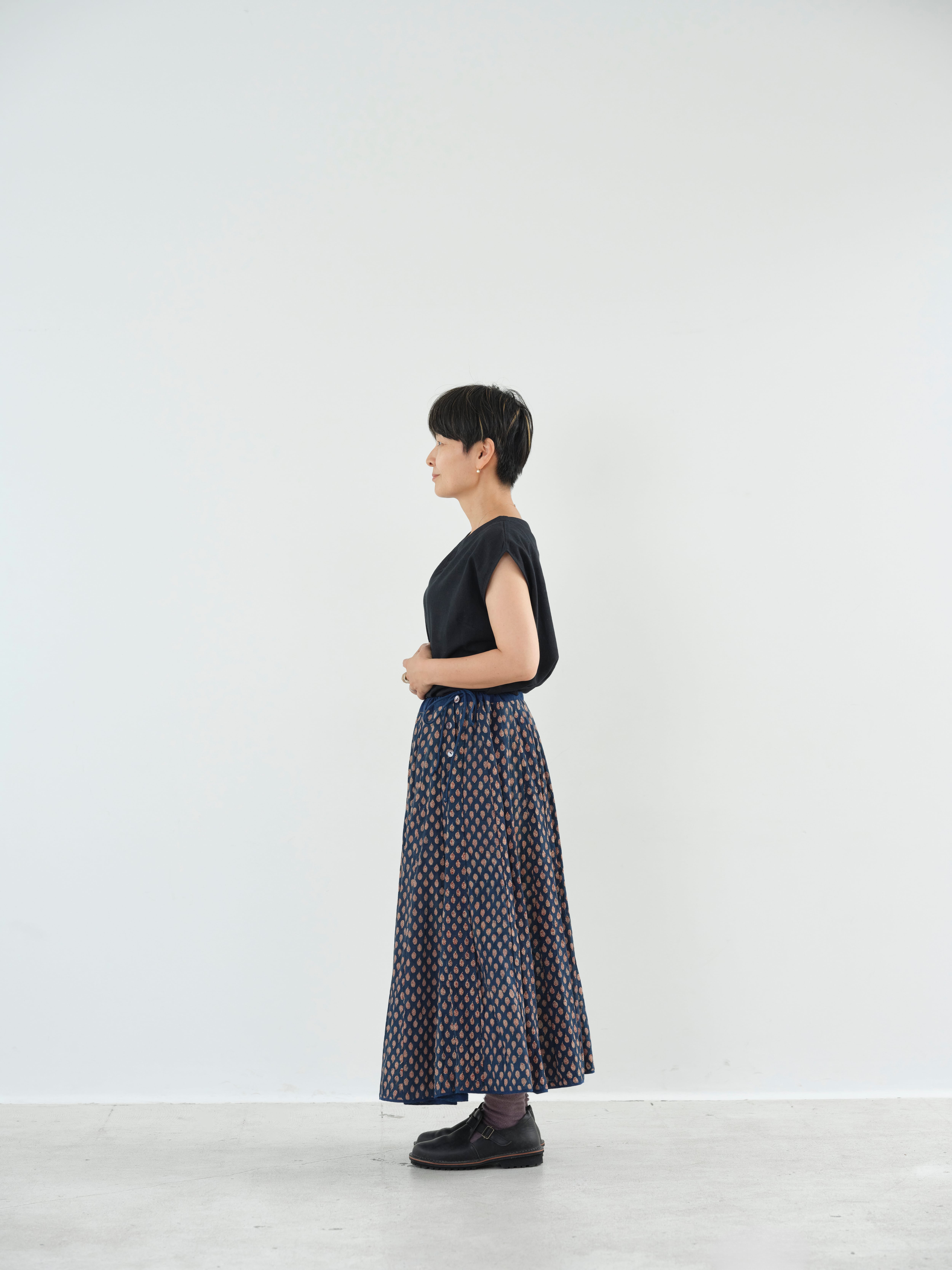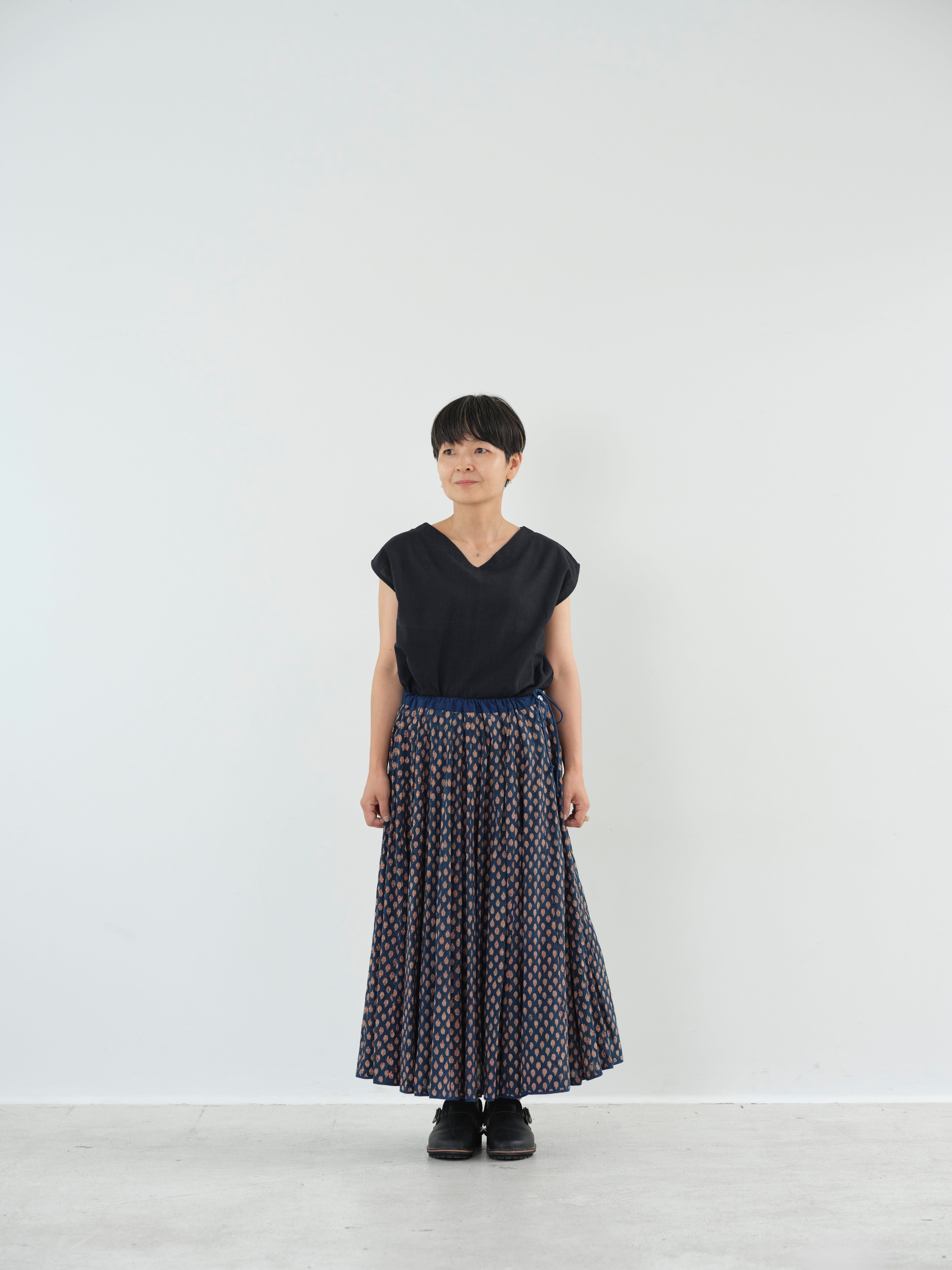 インドラジャスタン地方での伝統的な民族衣装からうまれた形。通常丈が90㎝のものですが、テクラオリジナルの80㎝丈で作っていただきました。