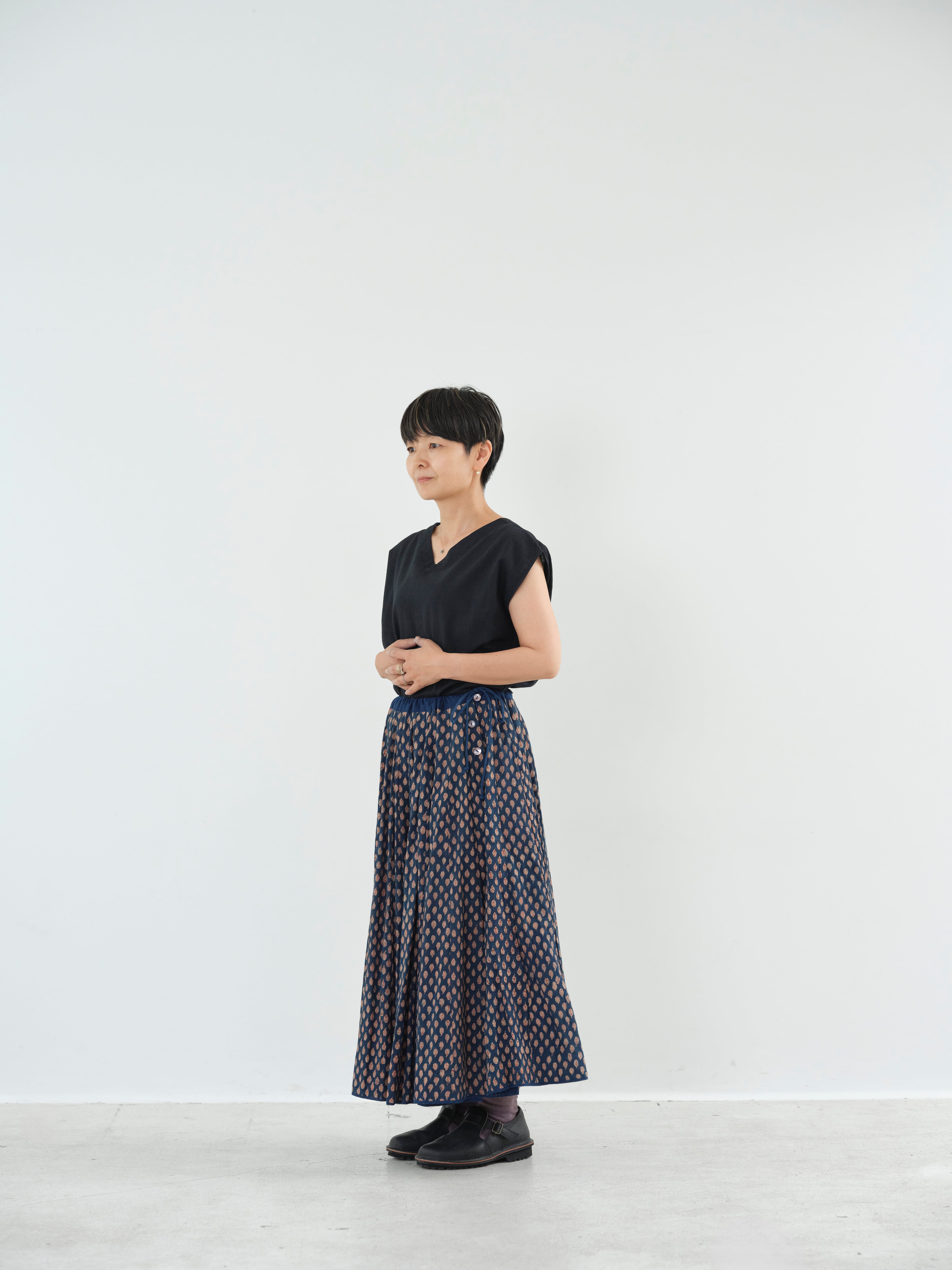 ふんだんに使った布と、西の大地で生き抜く人々を感じる意志ある雰囲気、シルエットも素敵です。インナーを調整していろんな時期に楽しんできていただける素敵なスカートです。