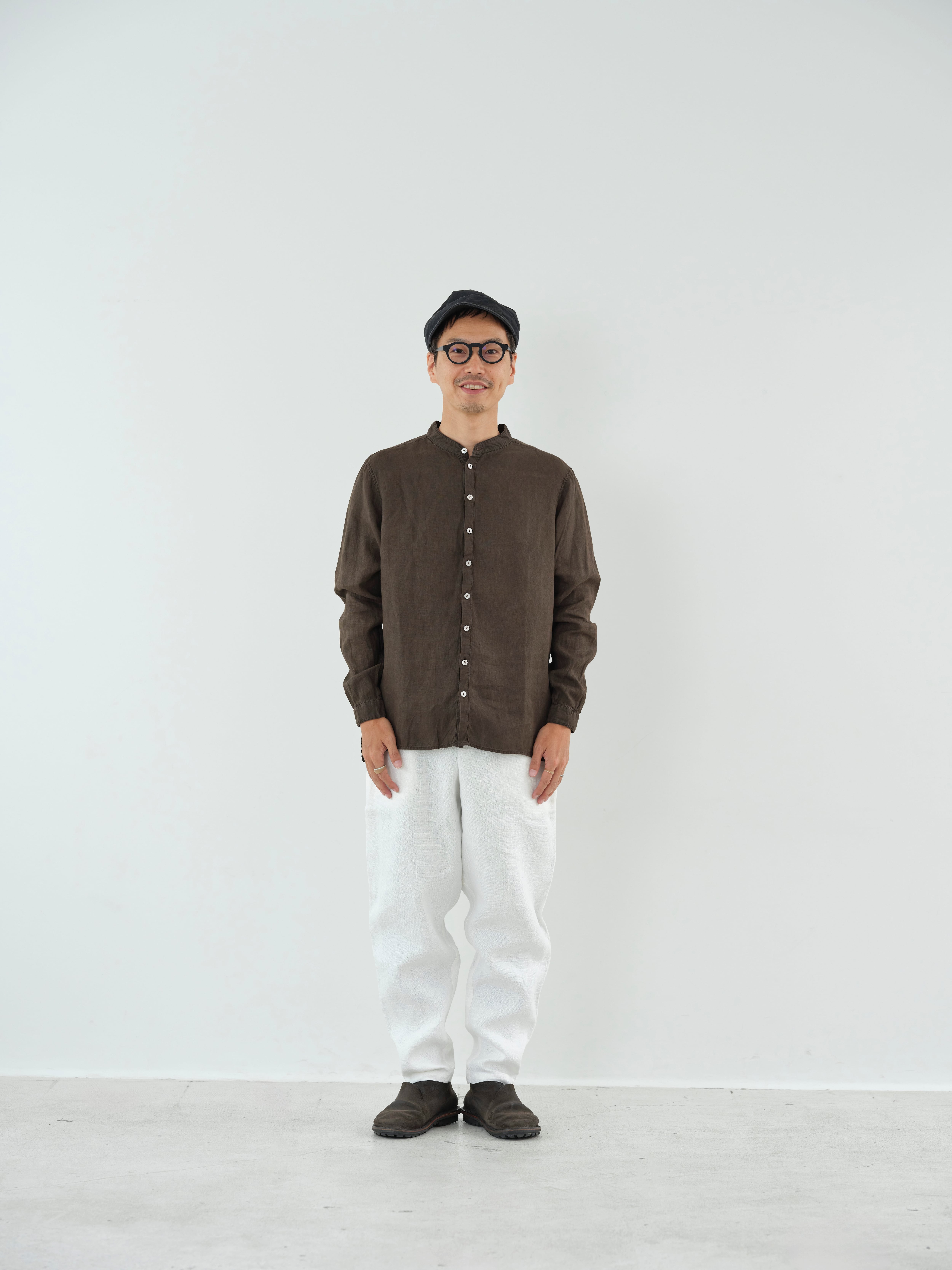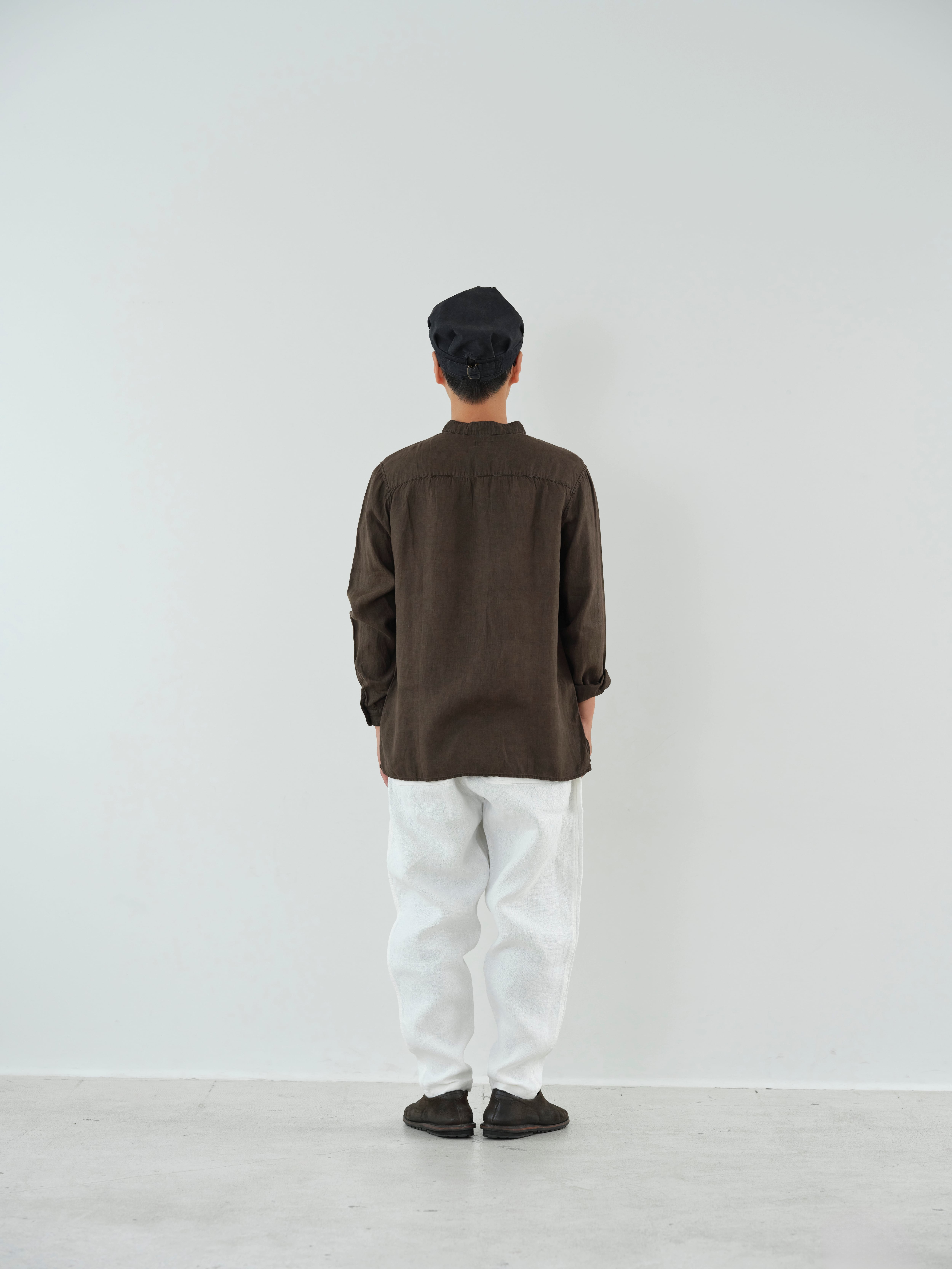 大麻100%の糸を経糸、緯糸に使用しています。大麻は強靭な繊維ですが、経年変化で肌に徐々に馴染んでゆき、麻から綿のような質感の変化が楽しめます。大麻の特性であるひんやりとした触感は洗濯を繰り返しても継続し、真夏でも快適に着用が可能です。大麻布の歴史については近世麻布研究所所長 吉田真一郎氏の記事に、大麻・苧麻・亜麻の違いはボーケンさんの記事に詳しいので参照ください。 シャツは現代の民族服を構成する洋服としての提案になります。構成は洋服のルールに則りながら、極力デザインを削ぎ落とし、機能性に基づいたパターンメイクとしています。具体的には袖山をいせ込み、袖底を高めに設定することで腕周りの運動量を、背中のヨークにタックやギャザーではなく、いせを入れることで背中の運動量を確保しています。定番のSH-81よりも若干ゆとりを持たせたシルエットです。ボタンには薄い白蝶貝を用いて全て手縫いで付けています。