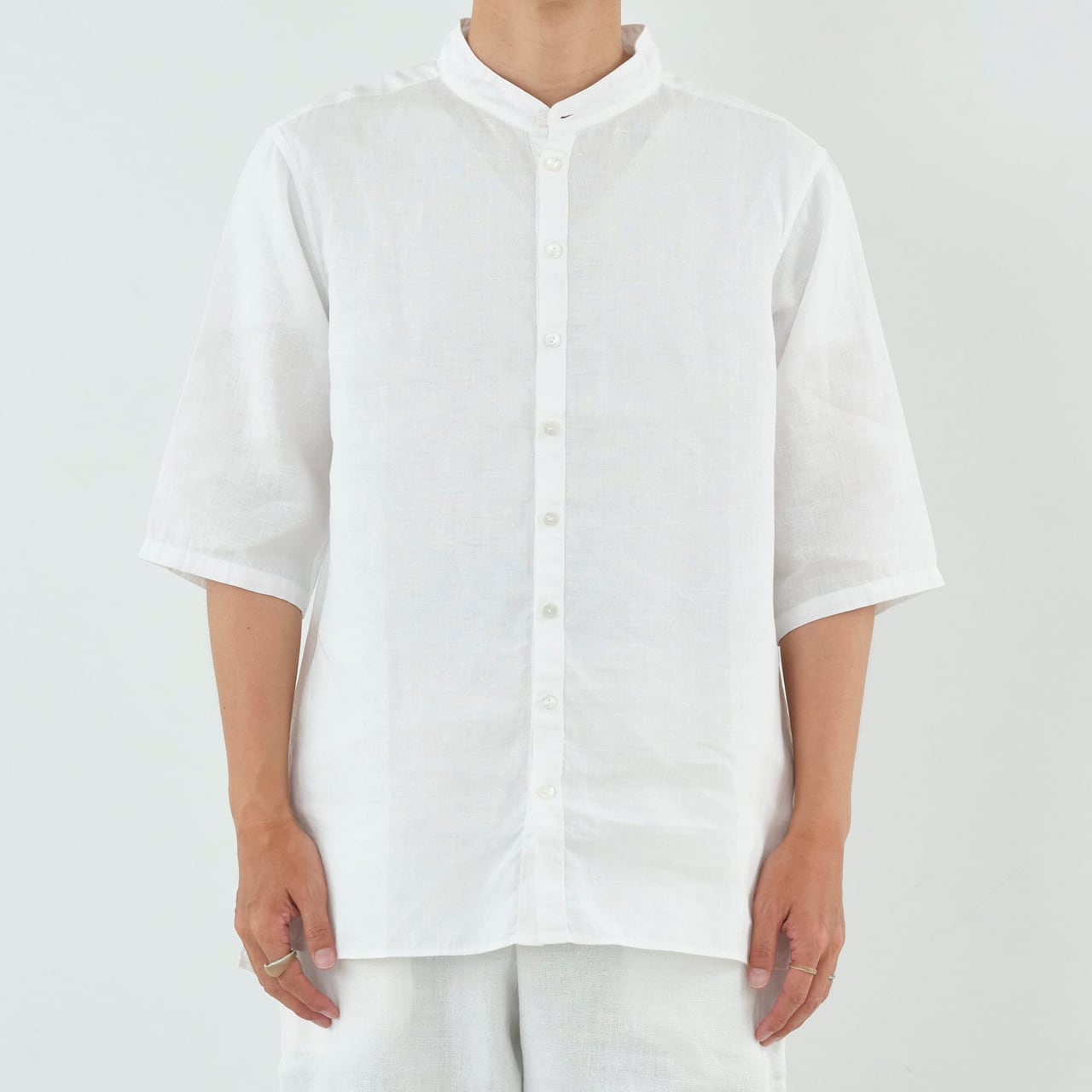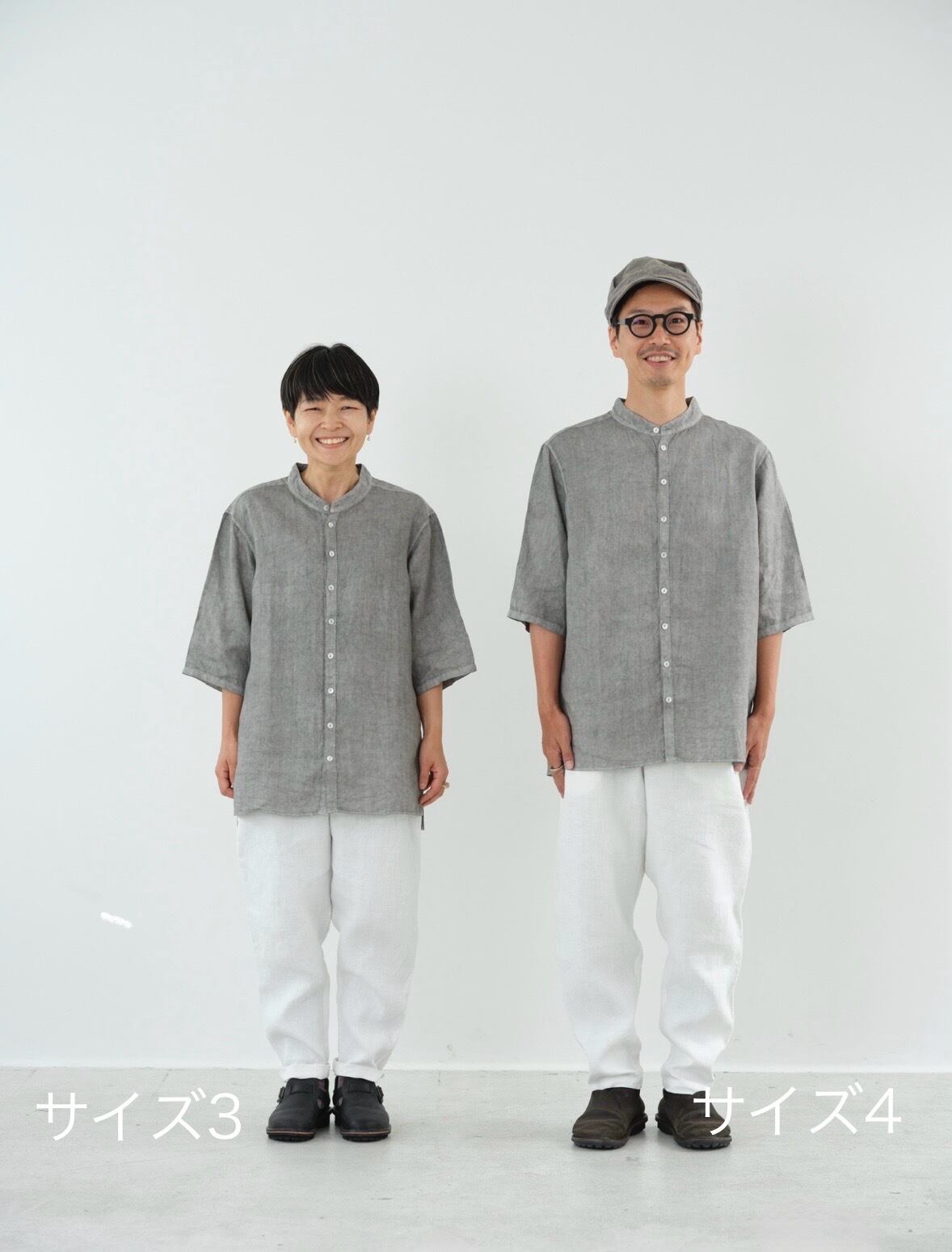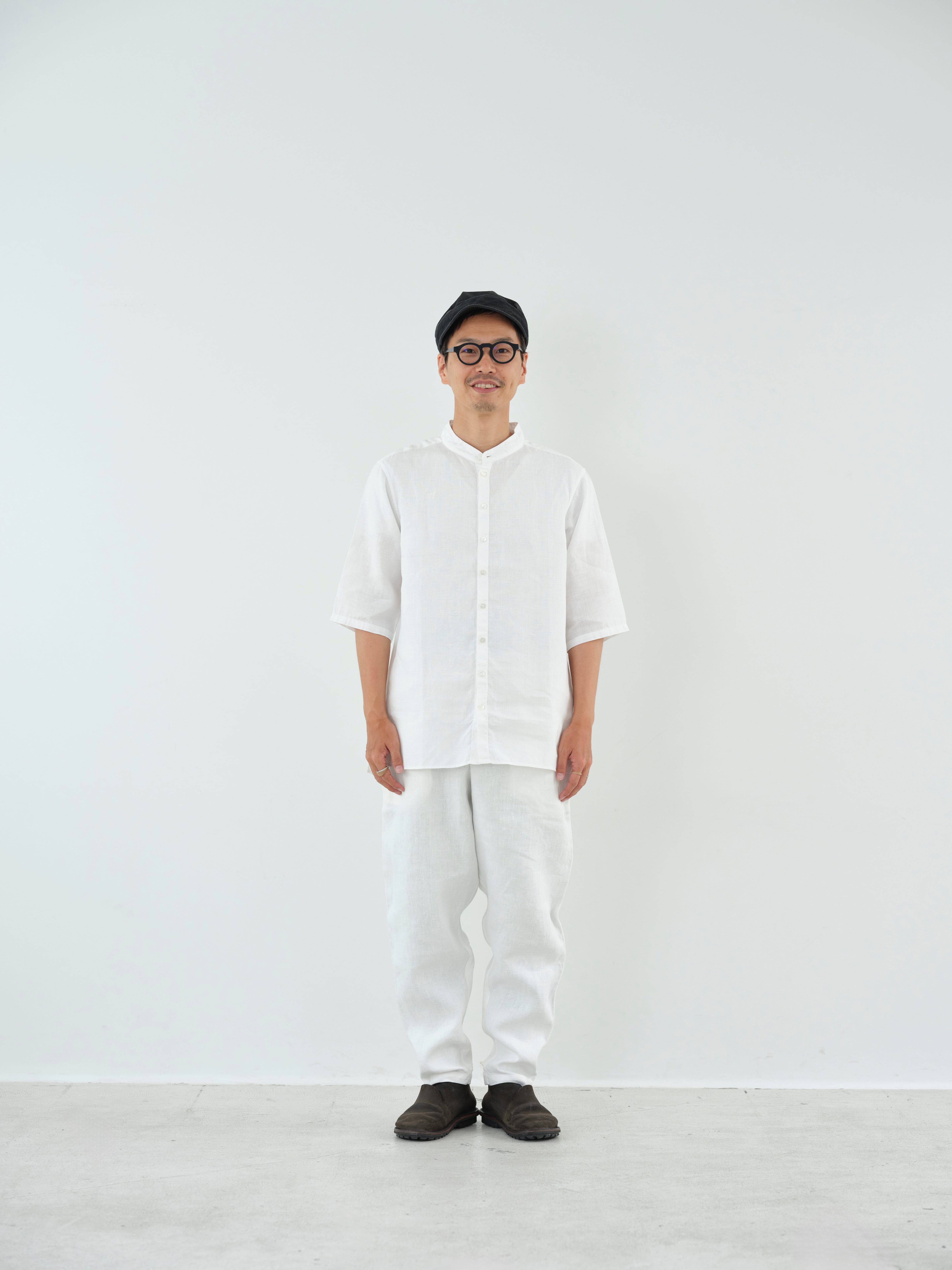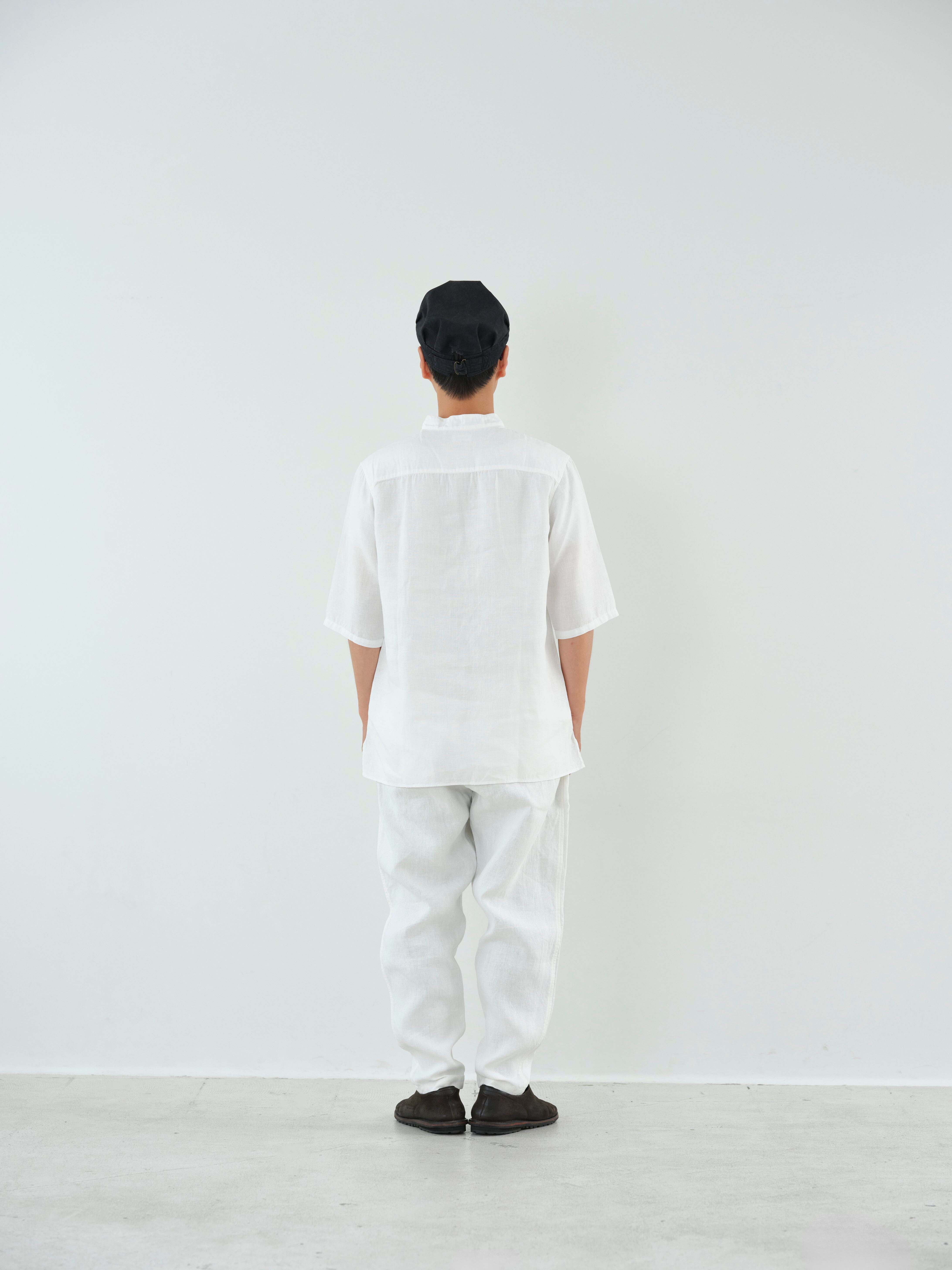 大麻100%の糸を経糸、緯糸に使用しています。大麻は強靭な繊維ですが、経年変化で肌に徐々に馴染んでゆき、麻から綿のような質感の変化が楽しめます。大麻の特性であるひんやりとした触感は洗濯を繰り返しても継続し、真夏でも快適に着用が可能です。大麻布の歴史については近世麻布研究所所長 吉田真一郎氏の記事に、大麻・苧麻・亜麻の違いはボーケンさんの記事に詳しいので参照ください。 シャツは現代の民族服を構成する洋服としての提案になります。構成は洋服のルールに則りながら、極力デザインを削ぎ落とし、機能性に基づいたパターンメイクとしています。具体的には袖山をいせ込み、袖底を高めに設定することで腕周りの運動量を、背中のヨークにタックやギャザーではなく、いせを入れることで背中の運動量を確保しています。定番のSH-81よりも若干ゆとりを持たせたシルエットです。ボタンには薄い白蝶貝を用いてます。SH-132の4分丈のシャツです。