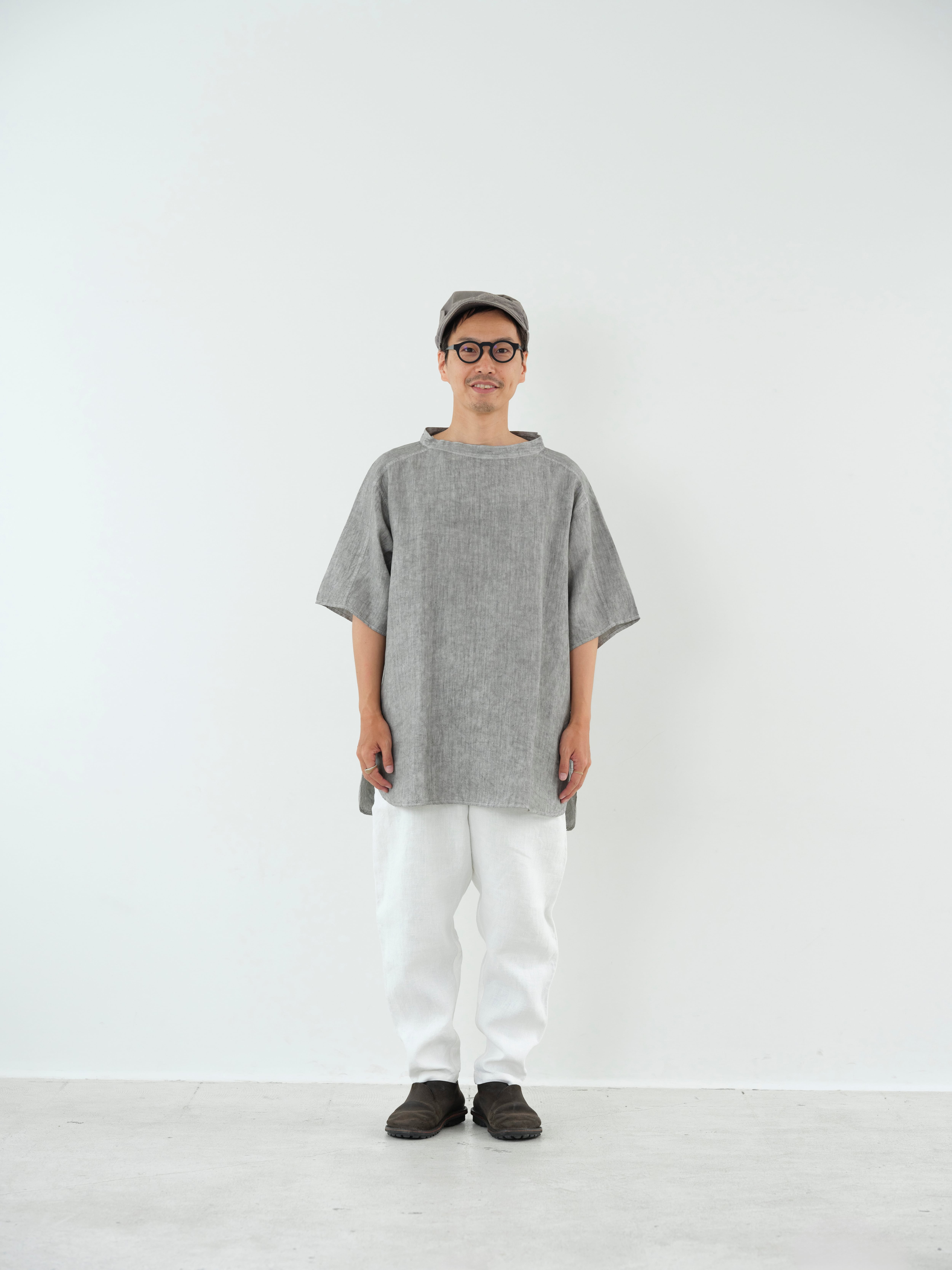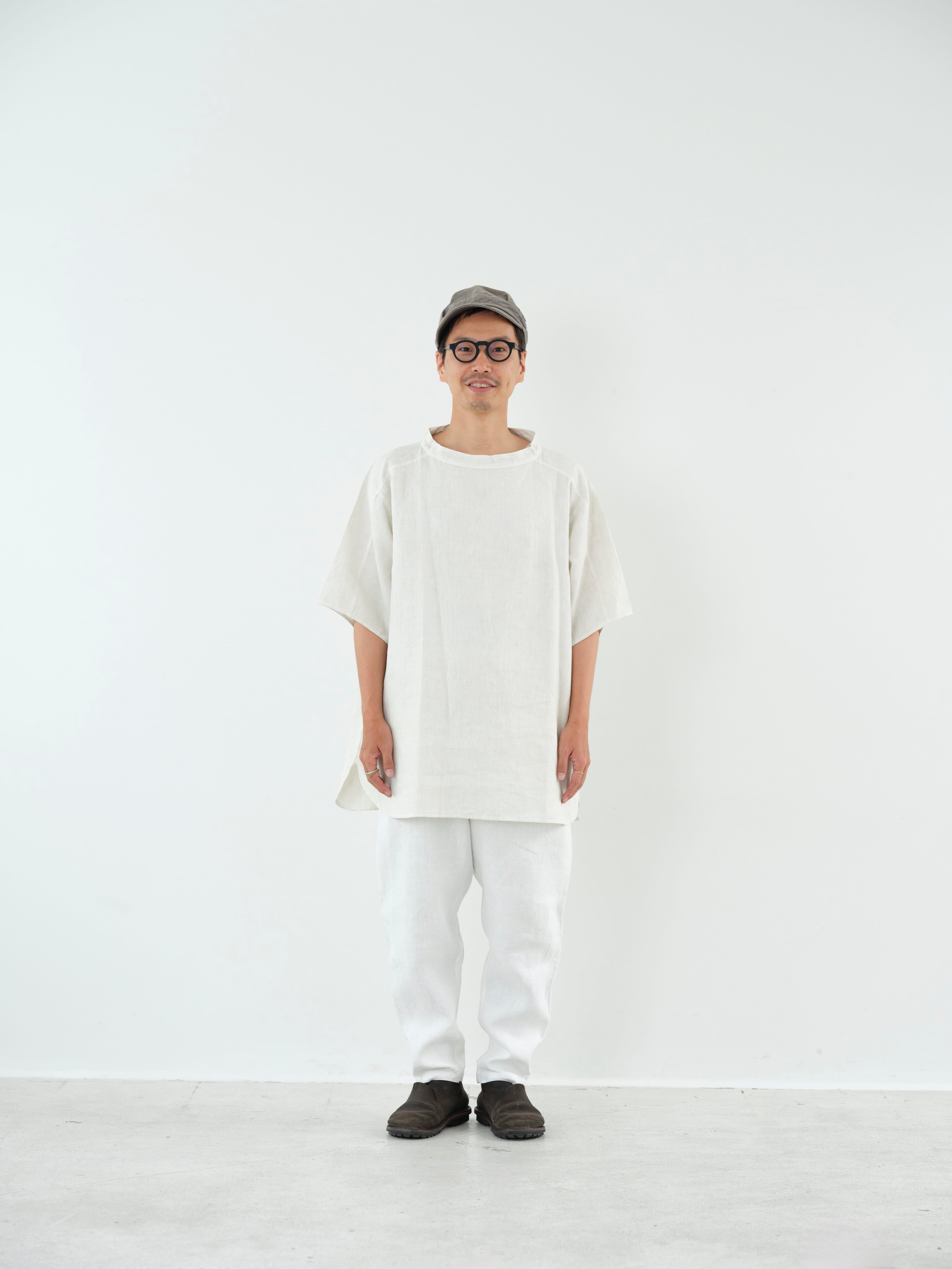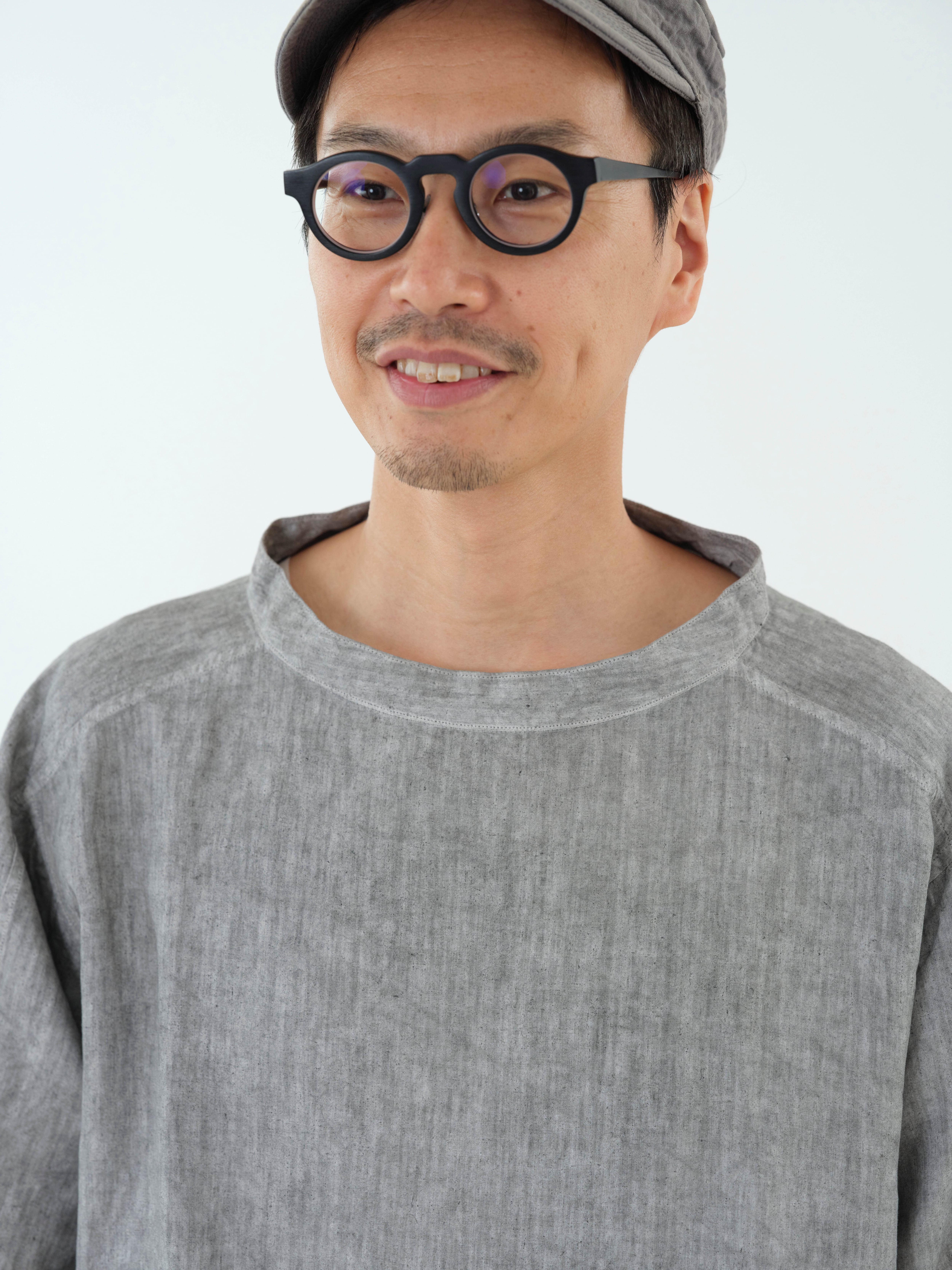 SH-134B大麻プルオーバー 高密度(ベンガラ染)大麻100%の糸を経糸、緯糸に使用しています。通常使用しているの大麻生地よりも細い番手の為、織密度があり、より上質な表情となっています。大麻は強靭な繊維ですが、経年変化で肌に徐々に馴染んでゆき、麻から綿のような質感の変化が楽しめます。大麻の特性であるひんやりとした触感は洗濯を繰り返しても継続し、真夏でも快適に着用が可能です。大麻布の歴史については近世麻布研究所所長 吉田真一郎氏の記事に、大麻・苧麻・亜麻の違いはボーケンさんの記事に詳しいので参照ください。オーバーサイズのプルオーバーで、身体と生地の空間を多くとることで着ていないかのような解放感があります。サイズ2は~180cm位まで対応していて、体型によってはワンピースのようにオーバーサイズで着ることも可能です。スプリットラグランスリーブによって程よい運動量が確保されていて、洗濯を繰り返しても綺麗に立つ衿元がTシャツよりもきちんとした印象を与えています。