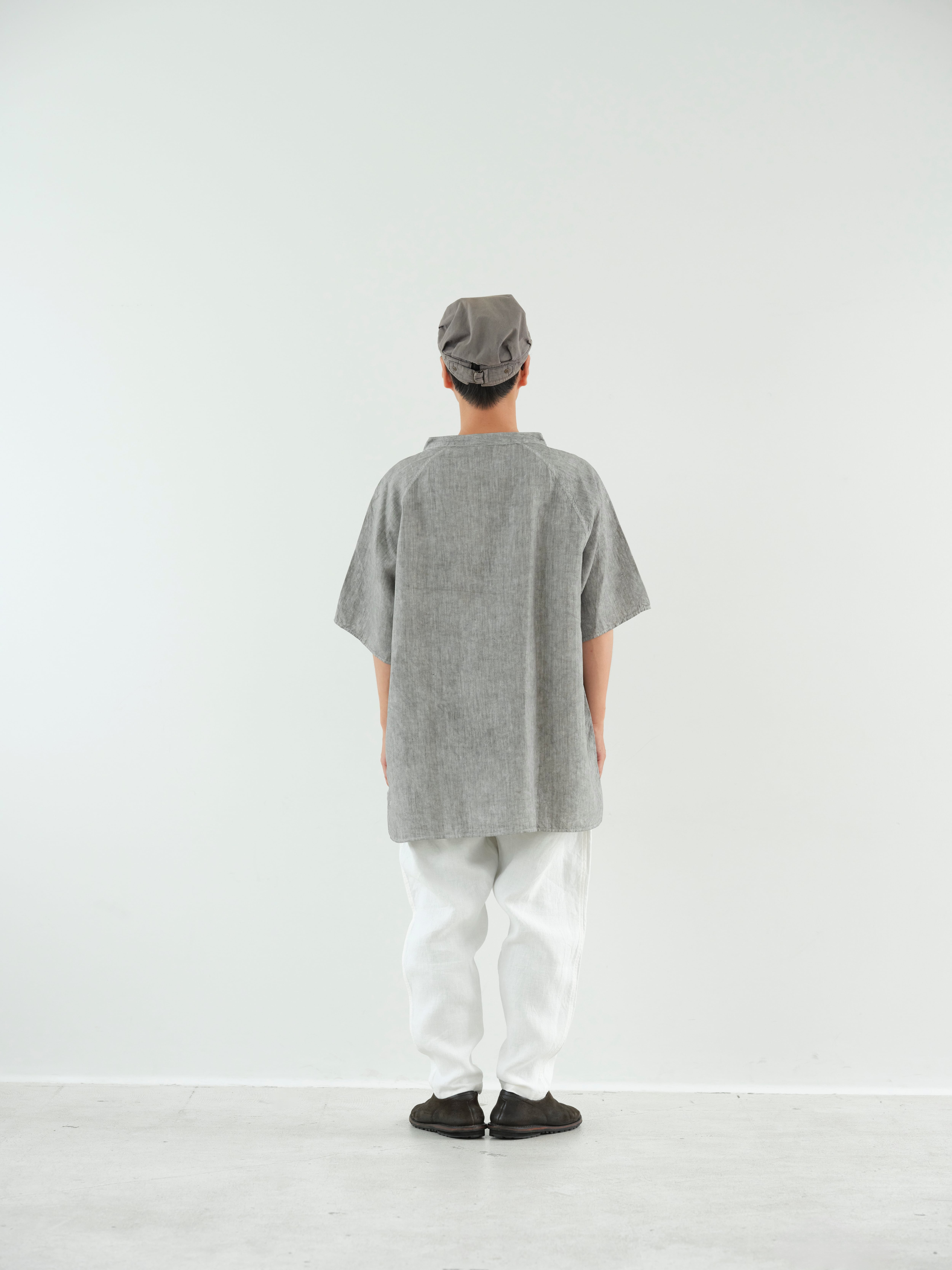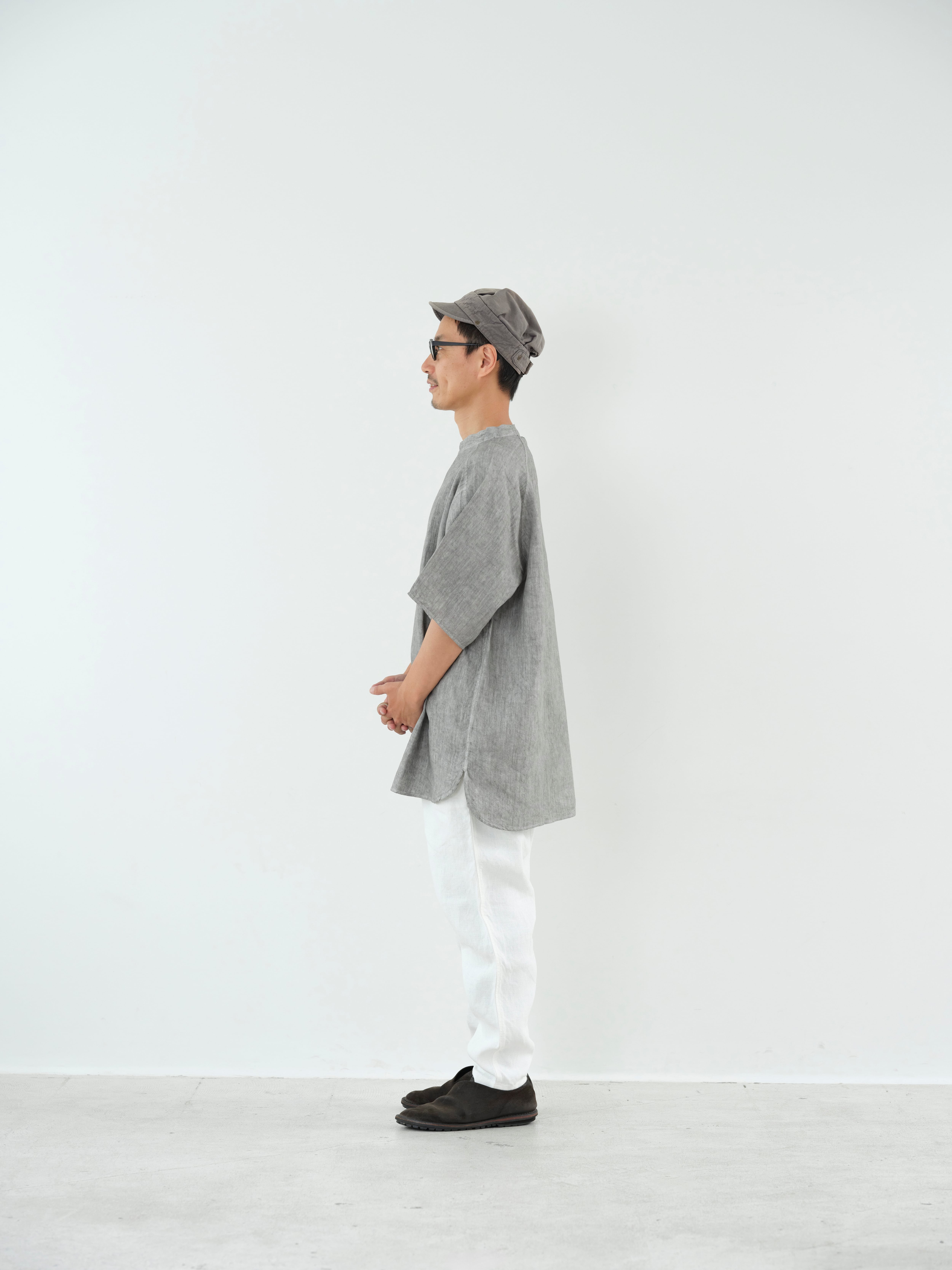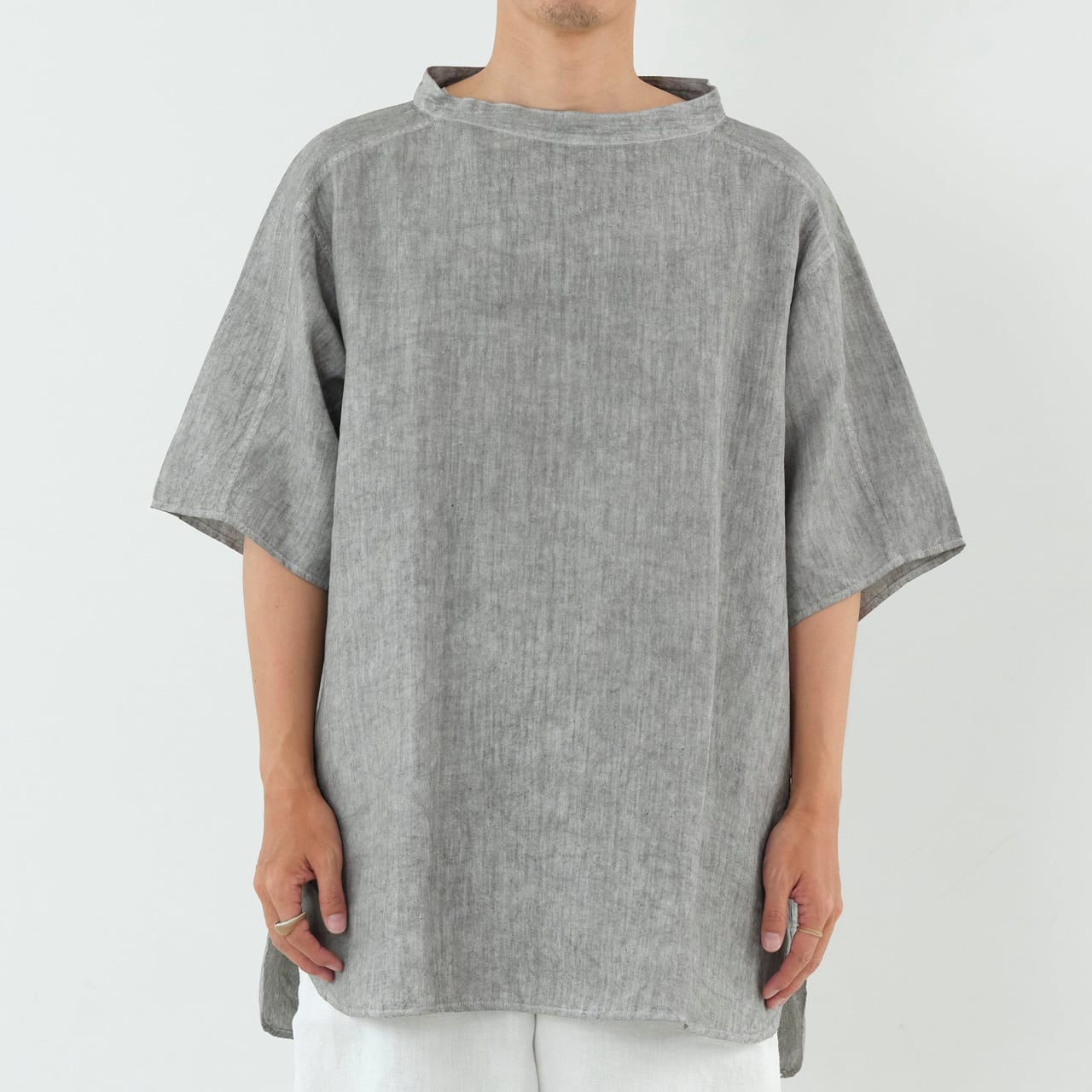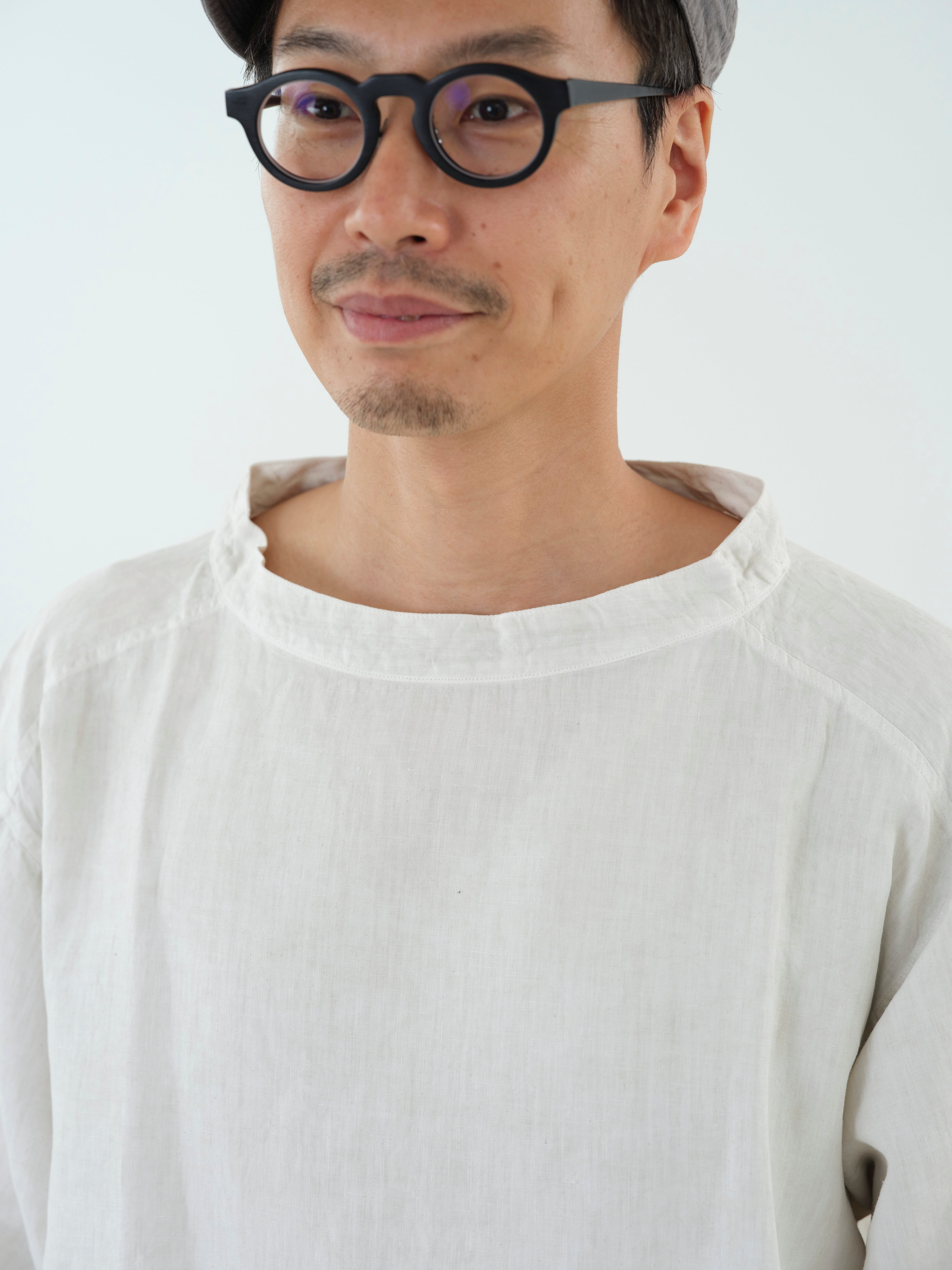 SH-134B大麻プルオーバー 高密度(ベンガラ染)大麻100%の糸を経糸、緯糸に使用しています。通常使用しているの大麻生地よりも細い番手の為、織密度があり、より上質な表情となっています。大麻は強靭な繊維ですが、経年変化で肌に徐々に馴染んでゆき、麻から綿のような質感の変化が楽しめます。大麻の特性であるひんやりとした触感は洗濯を繰り返しても継続し、真夏でも快適に着用が可能です。大麻布の歴史については近世麻布研究所所長 吉田真一郎氏の記事に、大麻・苧麻・亜麻の違いはボーケンさんの記事に詳しいので参照ください。オーバーサイズのプルオーバーで、身体と生地の空間を多くとることで着ていないかのような解放感があります。サイズ2は~180cm位まで対応していて、体型によってはワンピースのようにオーバーサイズで着ることも可能です。スプリットラグランスリーブによって程よい運動量が確保されていて、洗濯を繰り返しても綺麗に立つ衿元がTシャツよりもきちんとした印象を与えています。