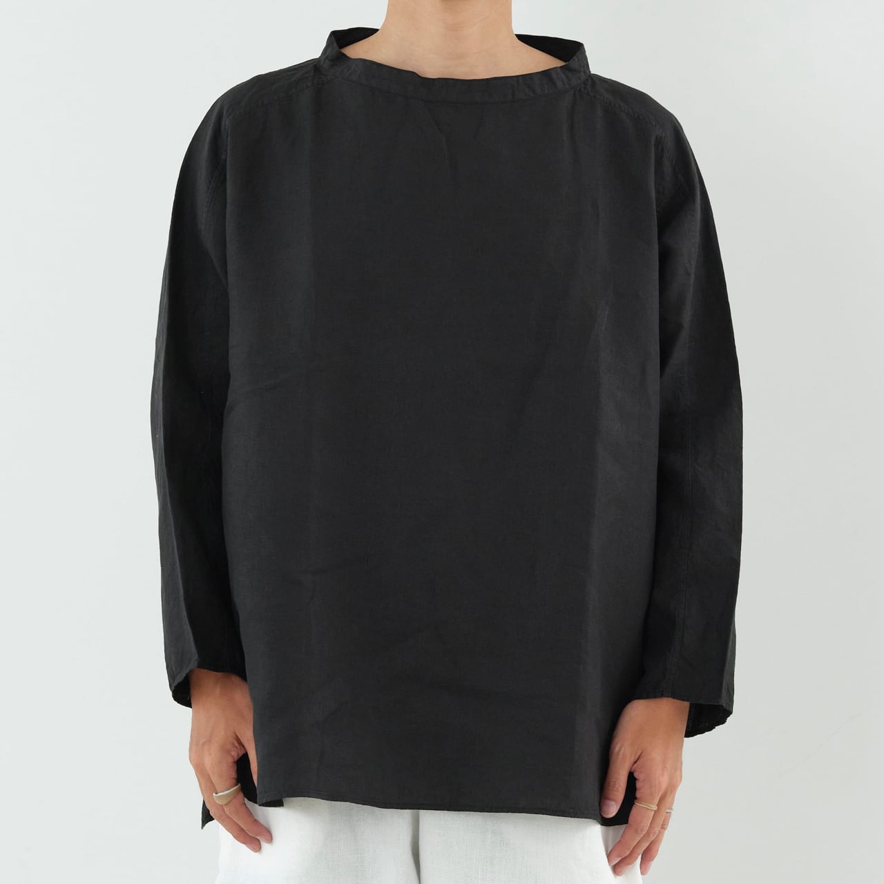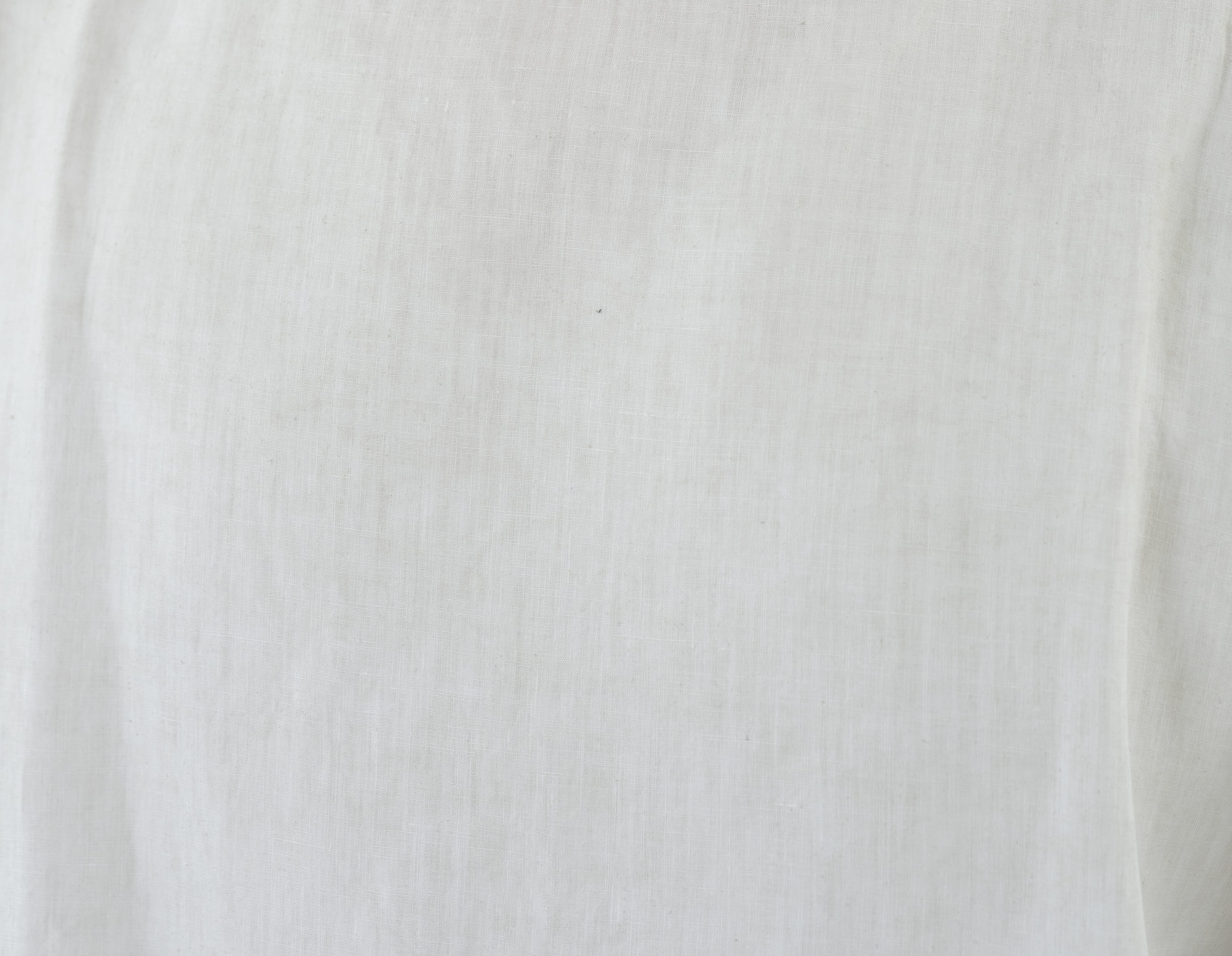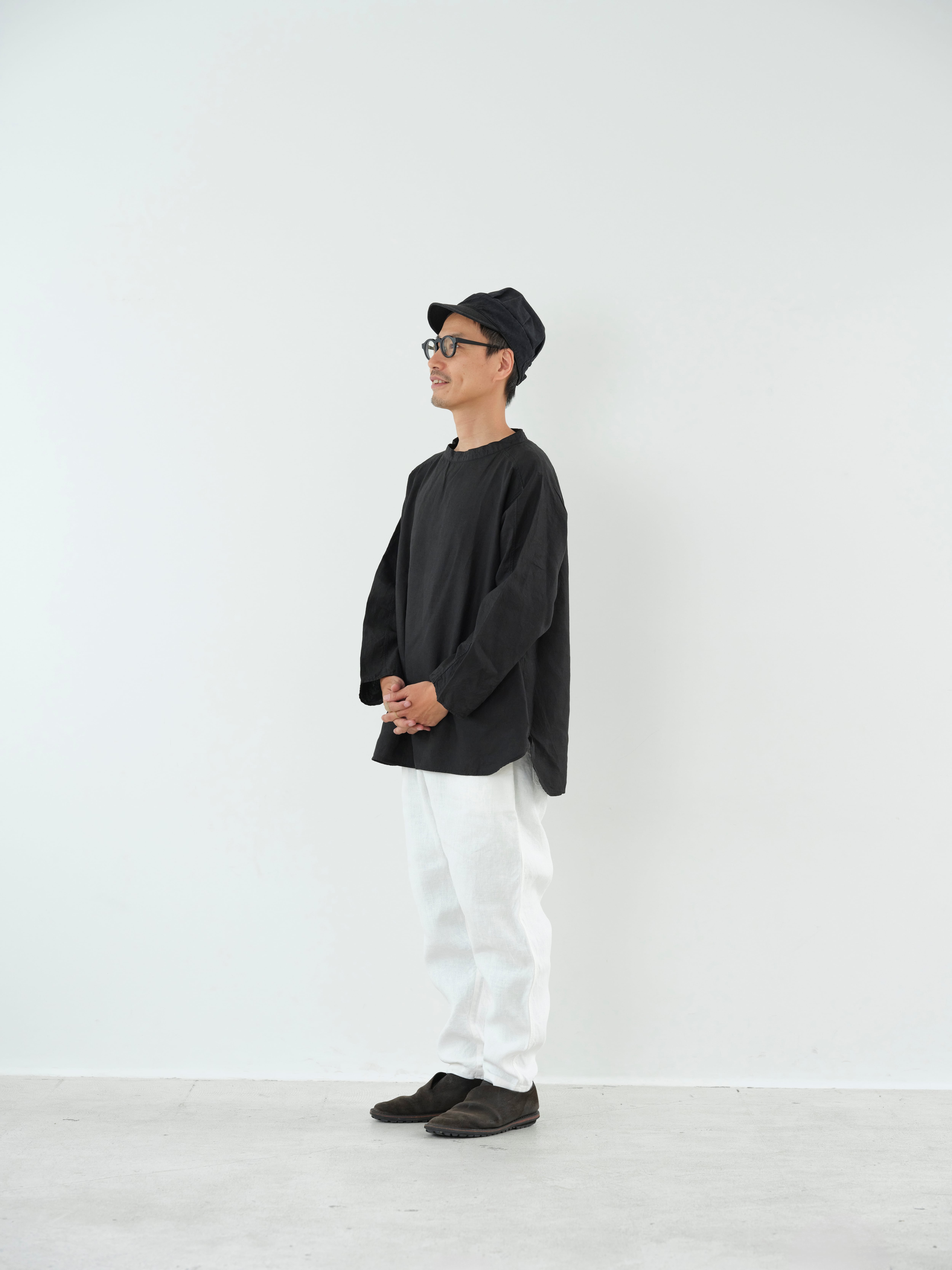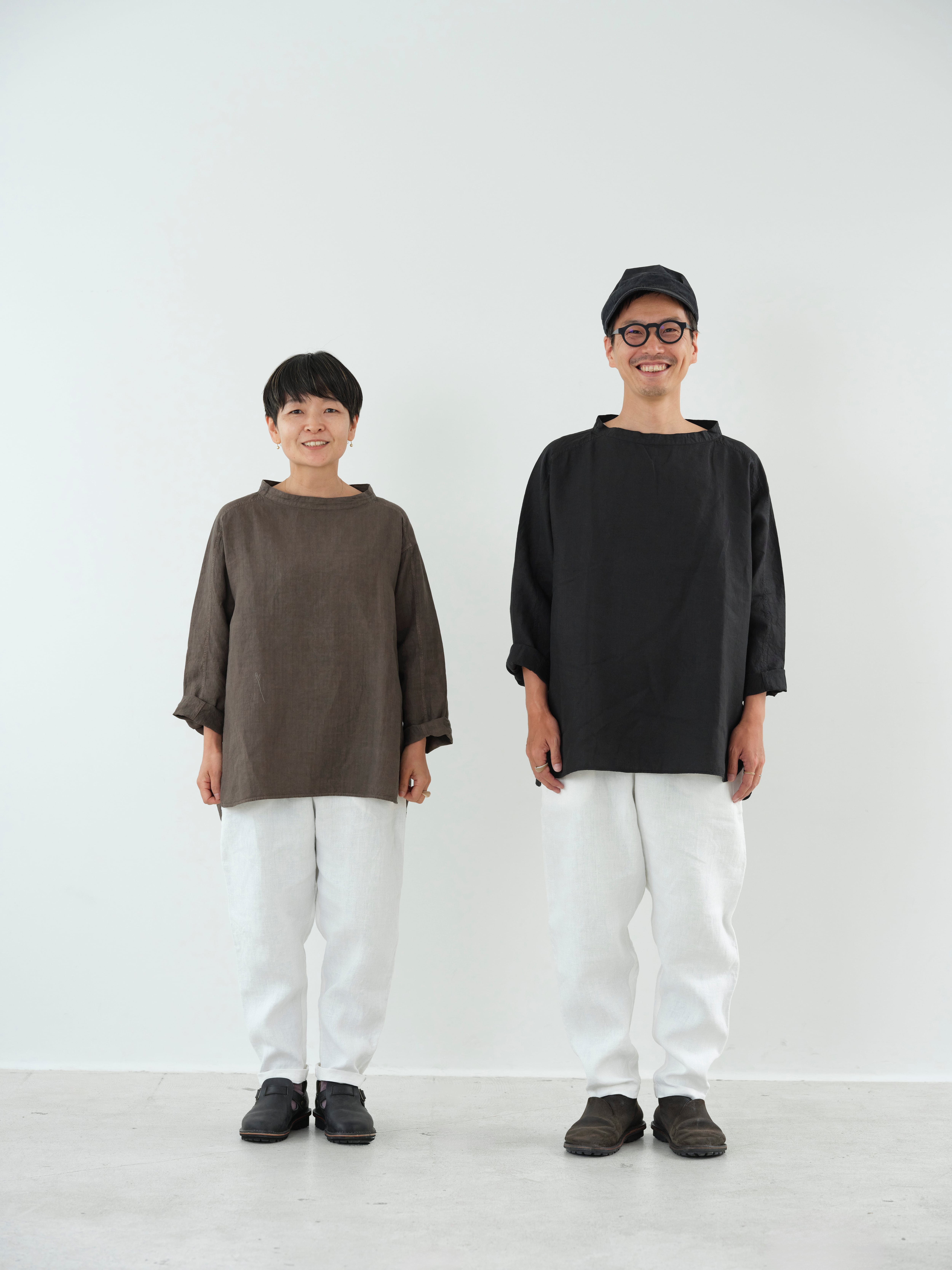 大麻100%の糸を経糸、緯糸に使用しています。通常使用しているの大麻生地よりも細い番手の為、織密度があり、より上質な表情となっています。大麻は強靭な繊維ですが、経年変化で肌に徐々に馴染んでゆき、麻から綿のような質感の変化が楽しめます。大麻の特性であるひんやりとした触感は洗濯を繰り返しても継続し、真夏でも快適に着用が可能です。大麻布の歴史については近世麻布研究所所長 吉田真一郎氏の記事に、大麻・苧麻・亜麻の違いはボーケンさんの記事に詳しいので参照ください。オーバーサイズのプルオーバーで、身体と生地の空間を多くとることで着ていないかのような解放感があります。スプリットラグランスリーブによって程よい運動量が確保されていて、洗濯を繰り返しても綺麗に立つ衿元がTシャツよりもきちんとした印象を与えています。