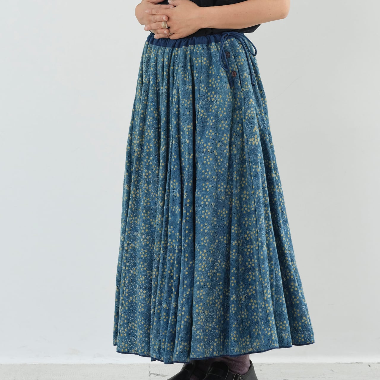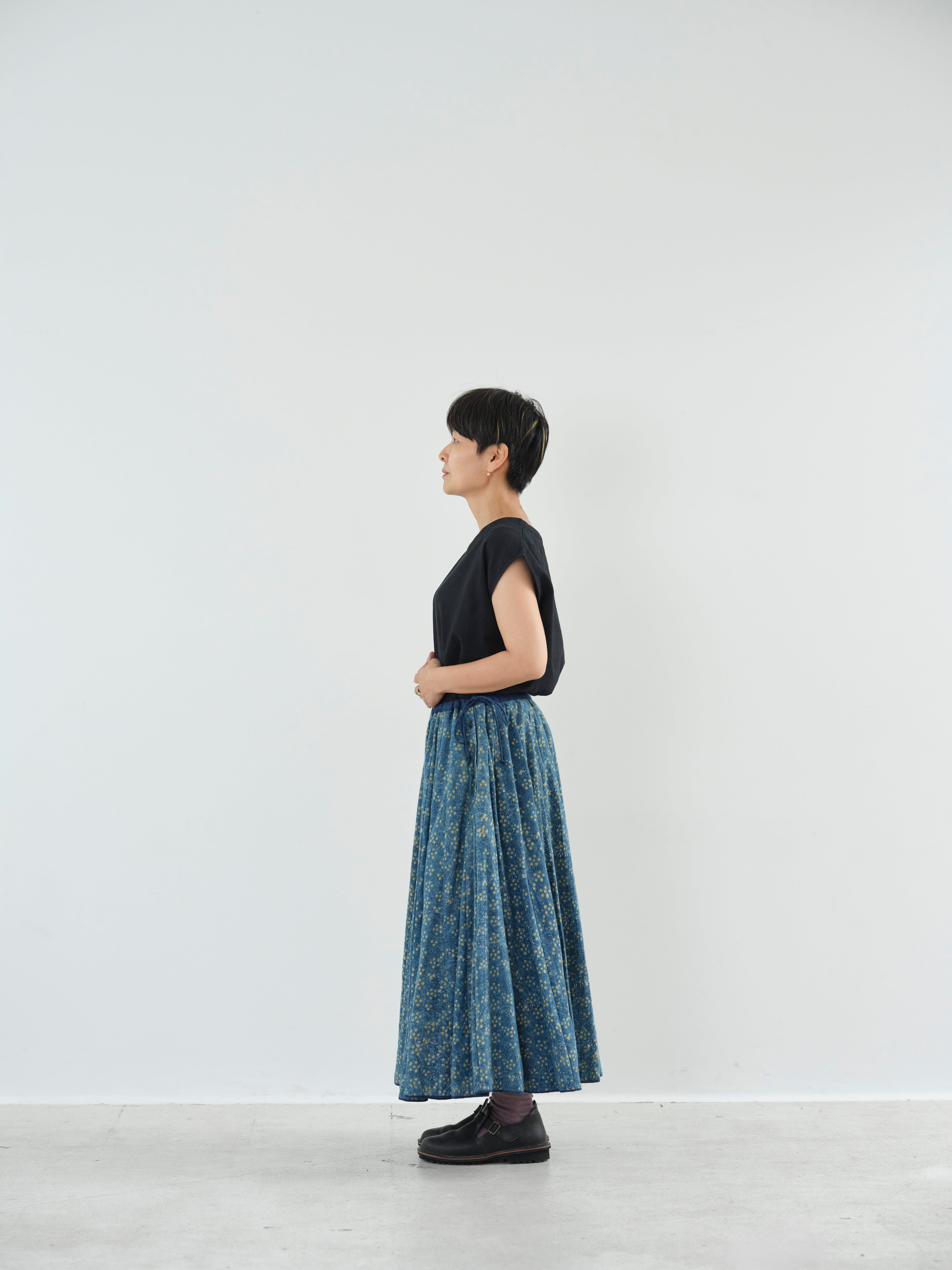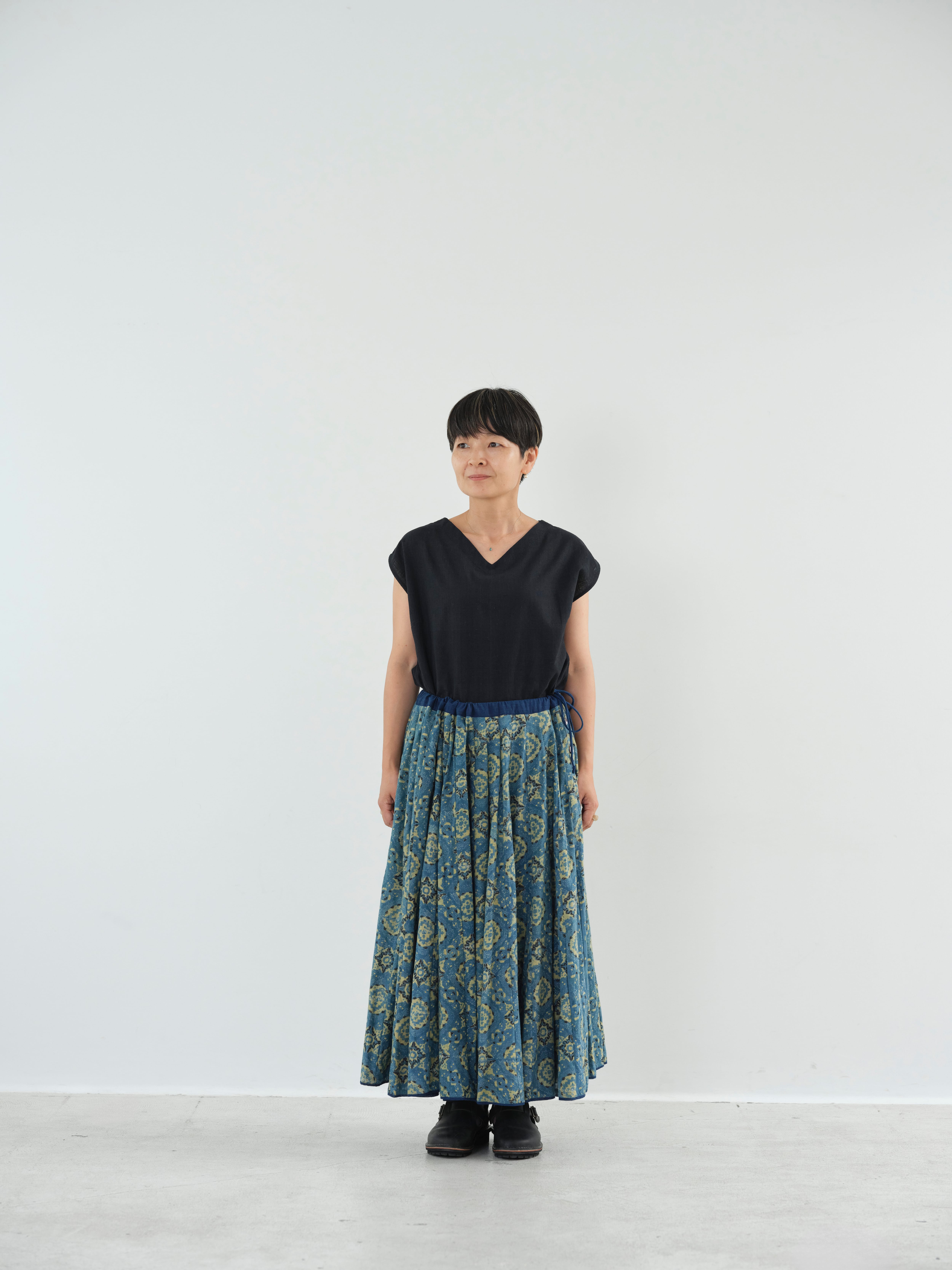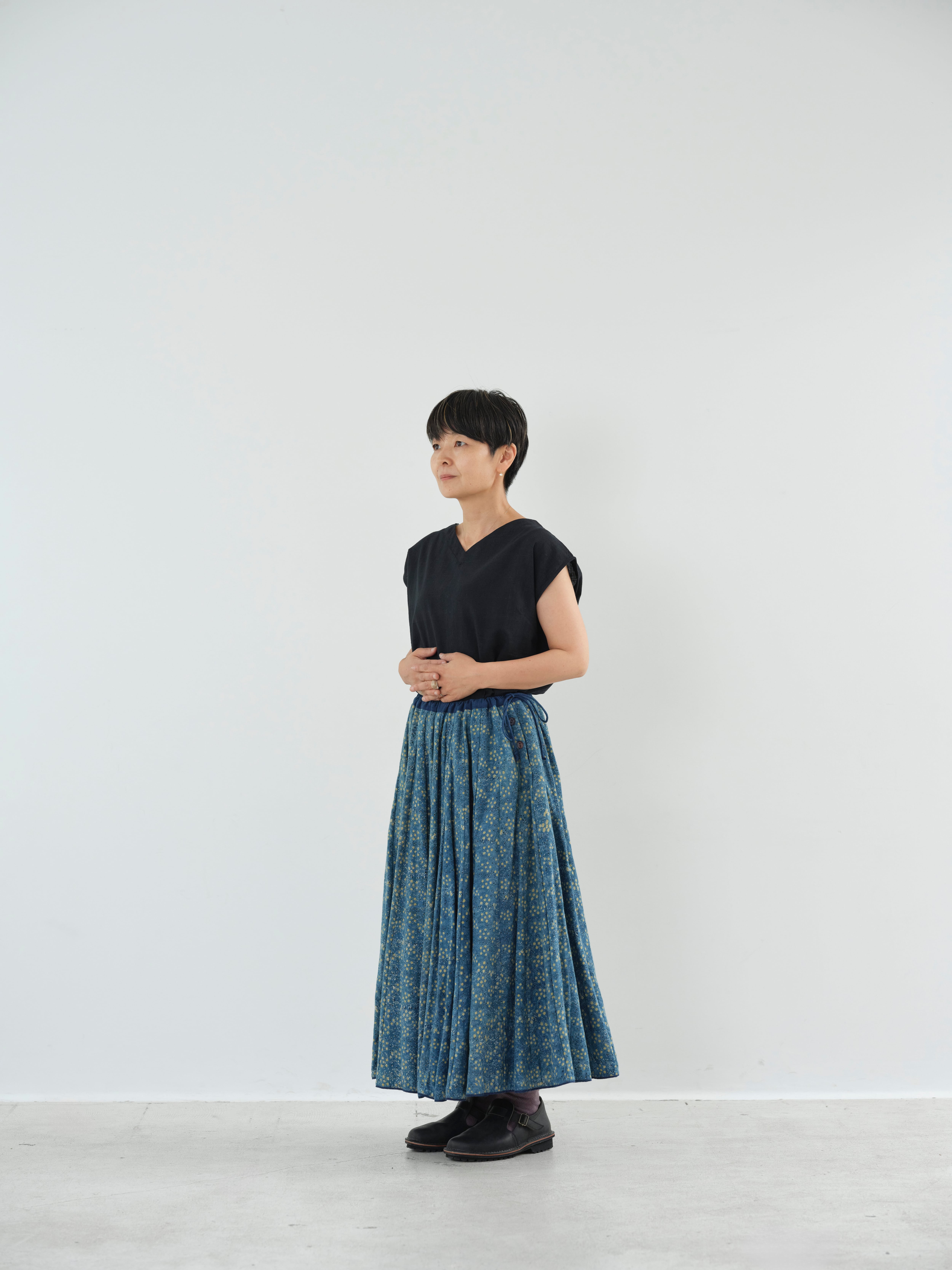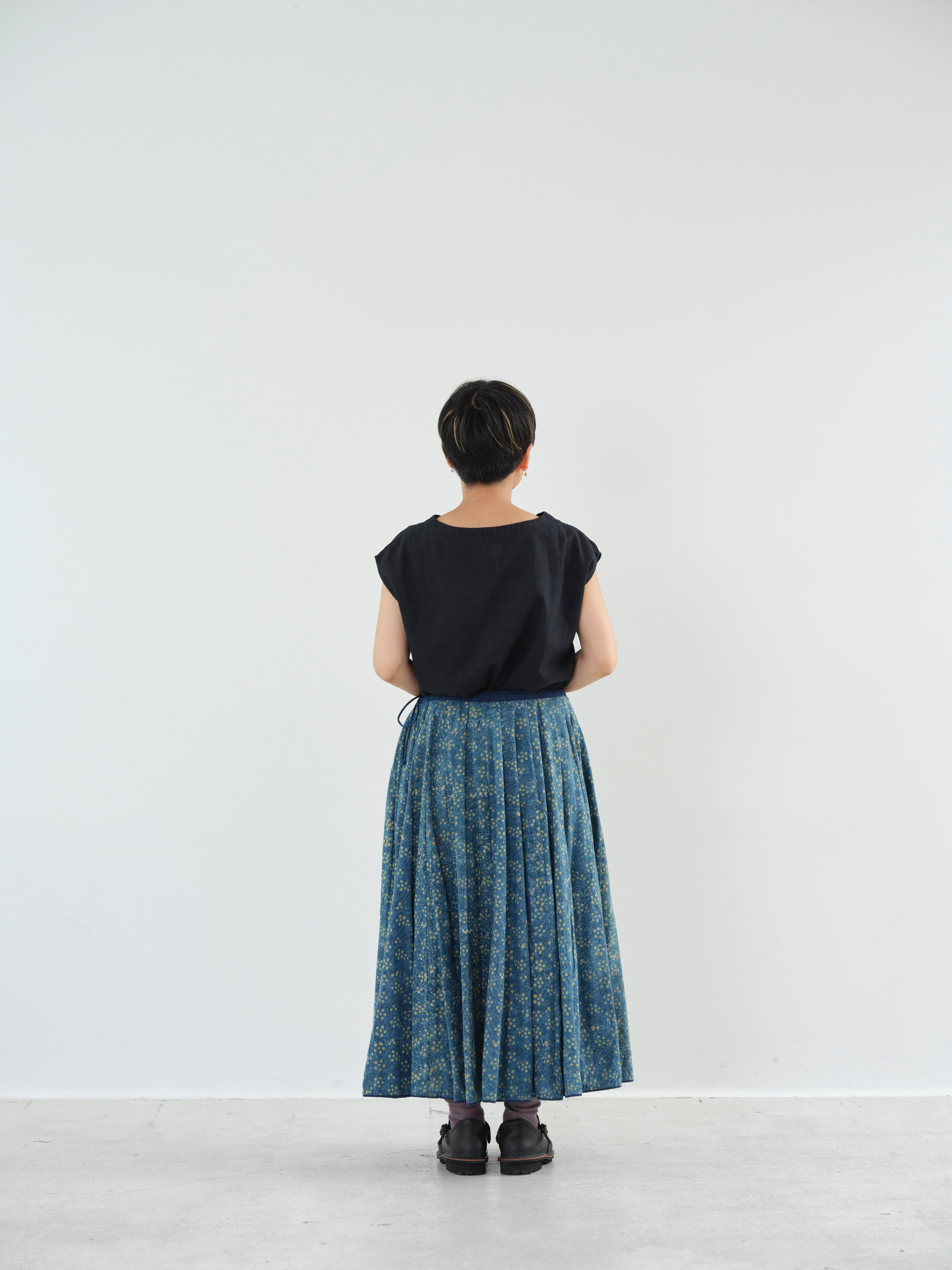 ふんだんに使った布と、西の大地で生き抜く人々を感じる意志ある雰囲気、シルエットも素敵です。インナーを調整していろんな時期に楽しんできていただける素敵なスカートです。