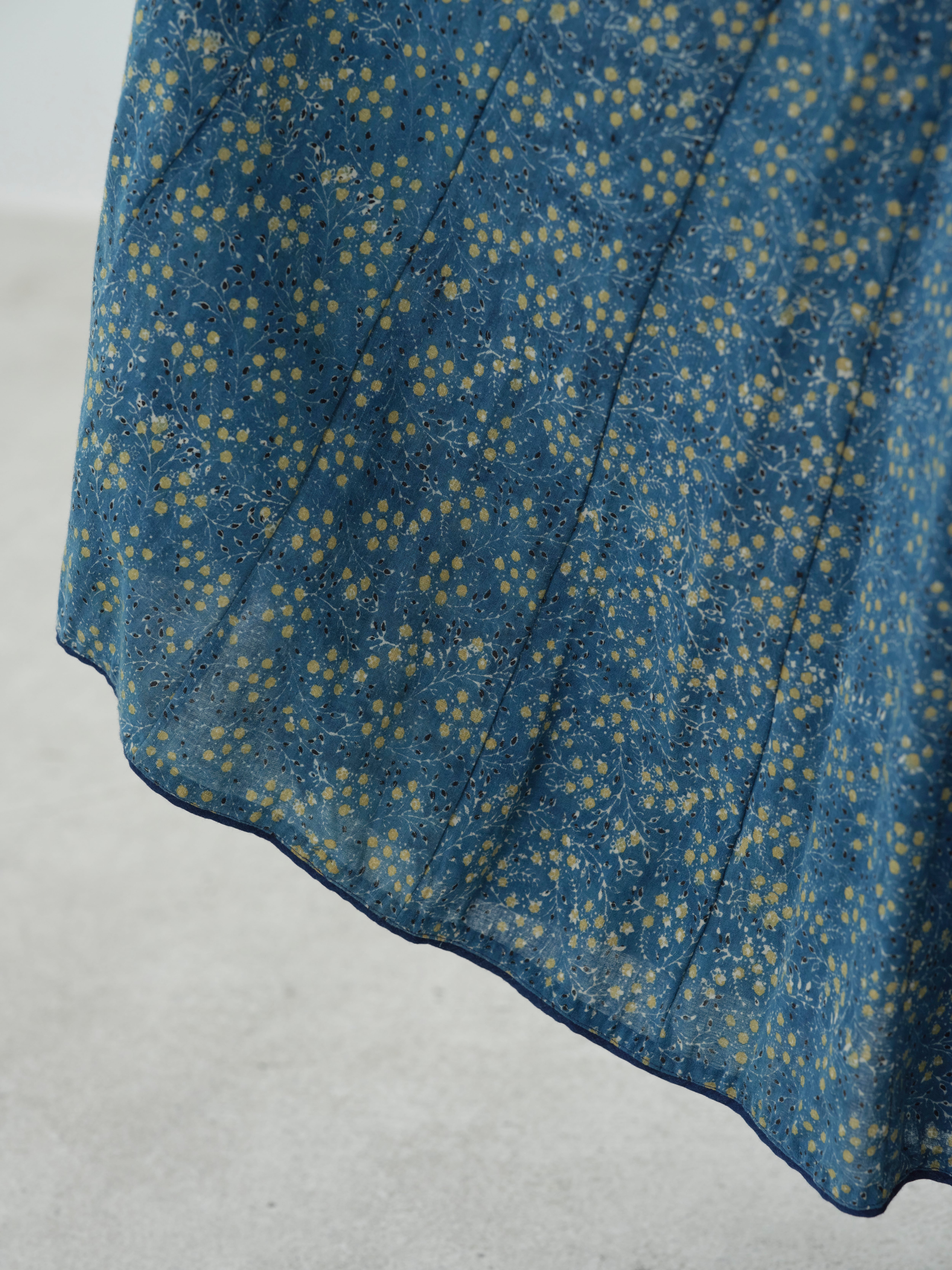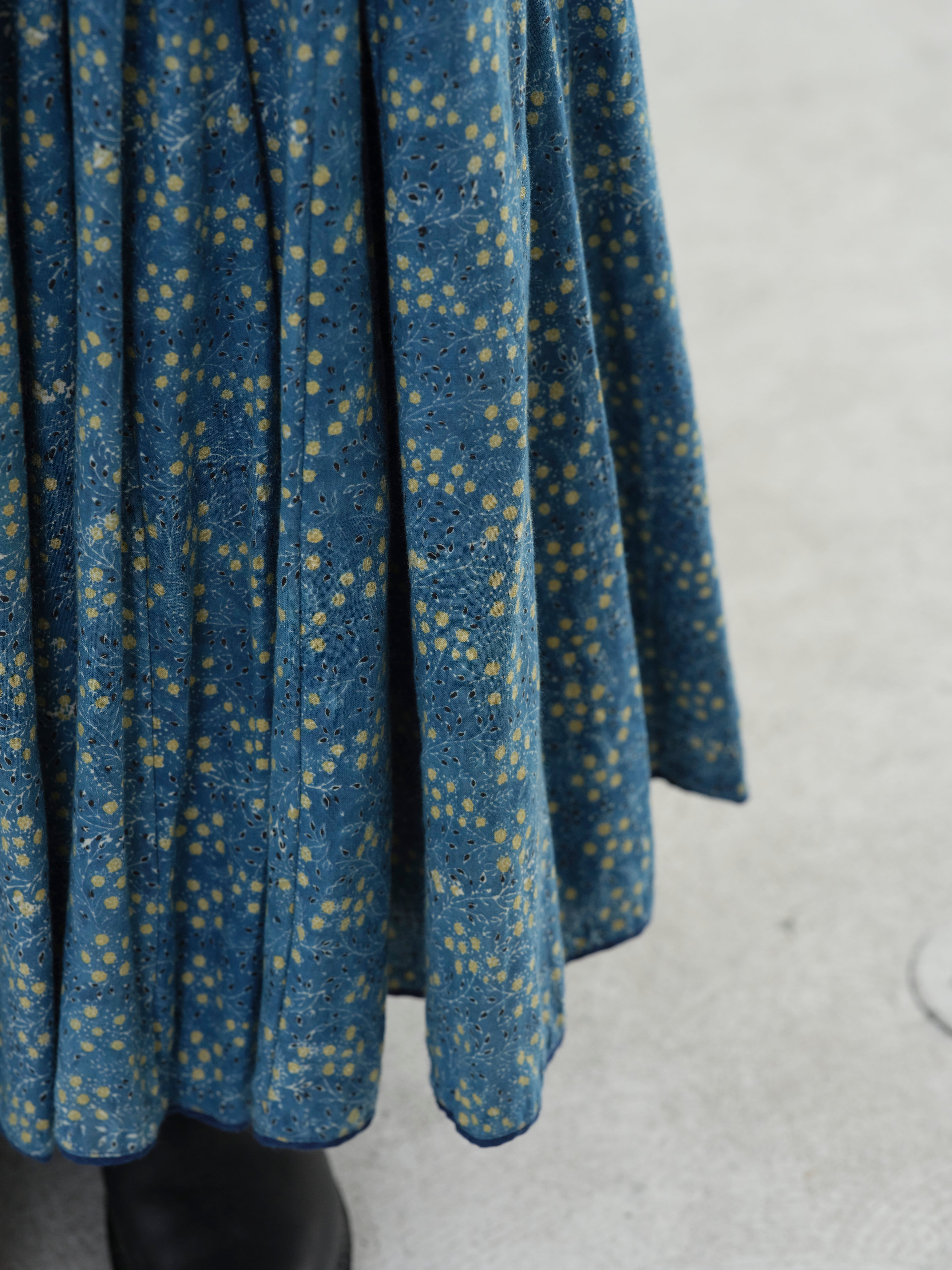 ウエスト部分が紐で搾れるようになっており、裾のパイピング、裏面は手縫いの部分もあり手仕事を感じられる1枚です。