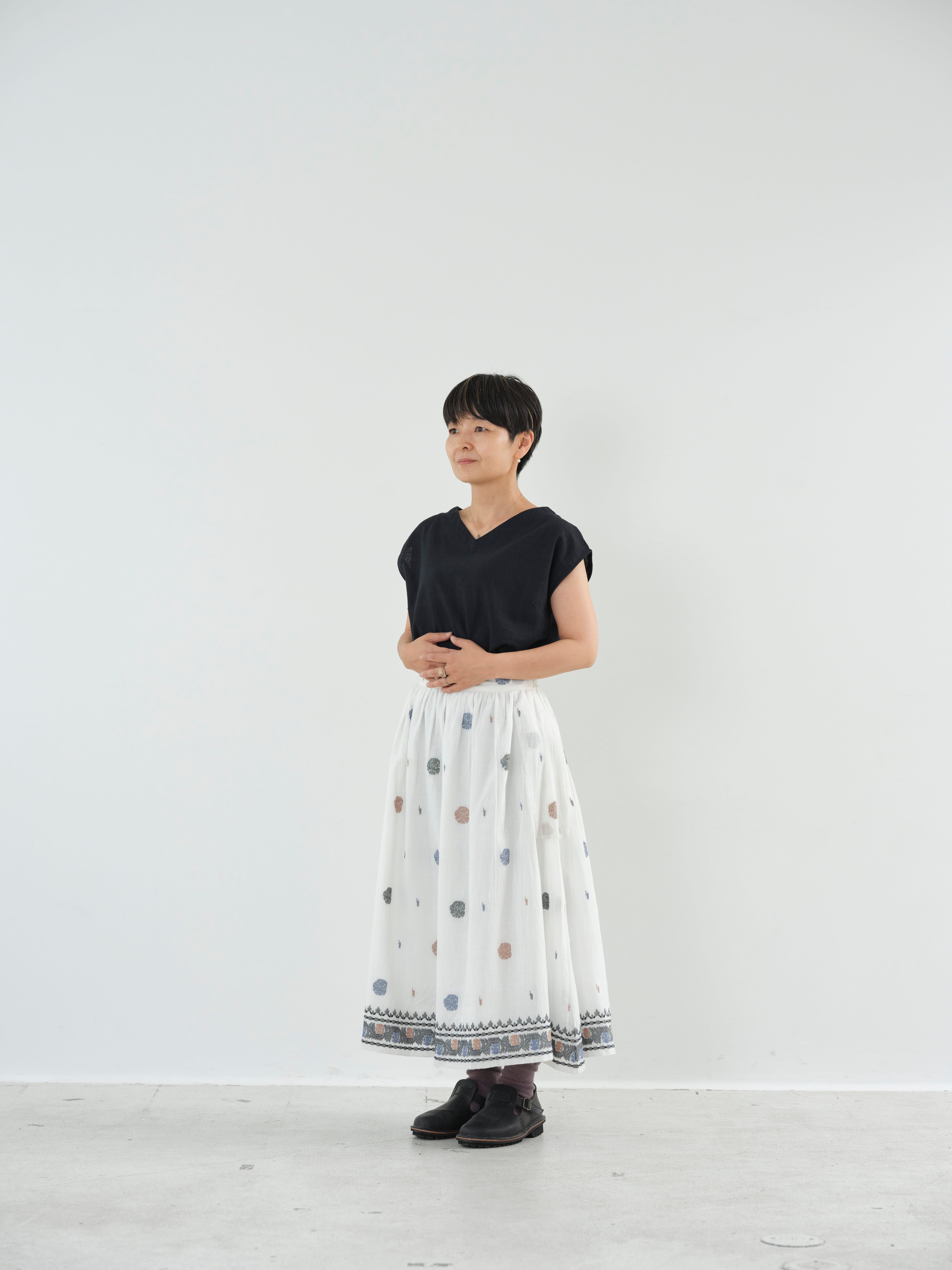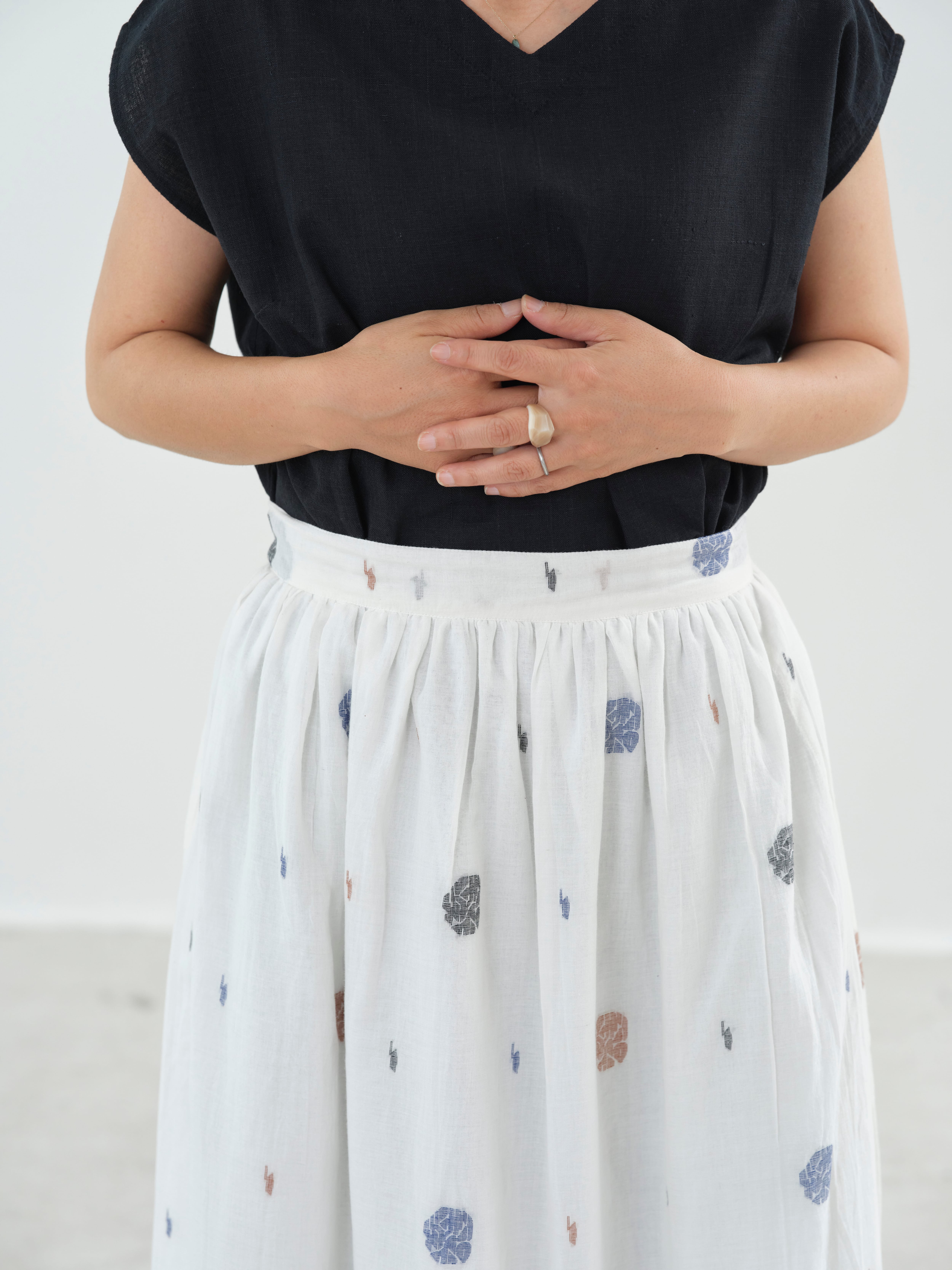 美しいジャムダ織りの生地で作られたスカートです。白地の生地に全体に美しい模様が施されています。尊いインドの手仕事を楽しんでいただける1枚だと思います。