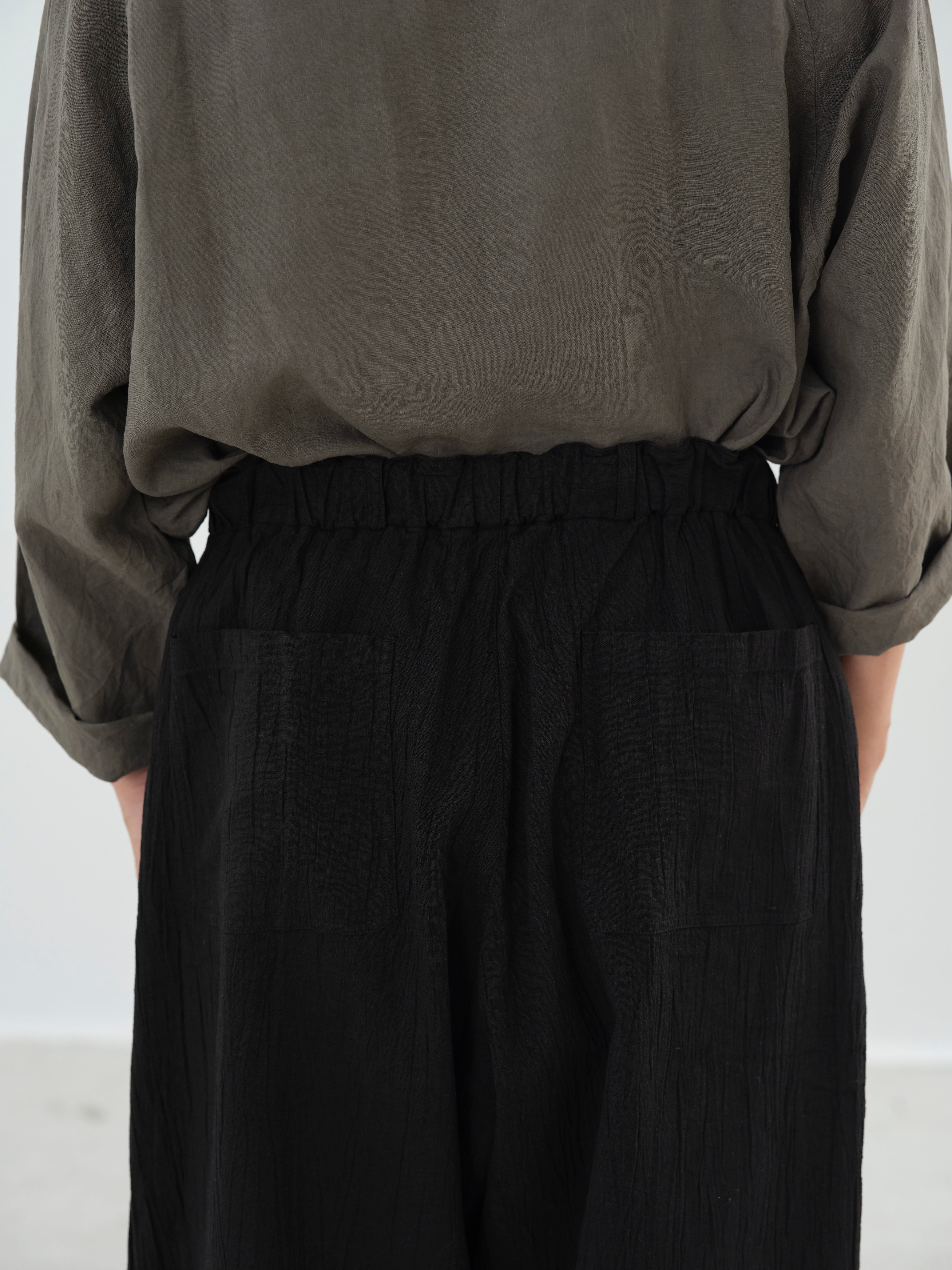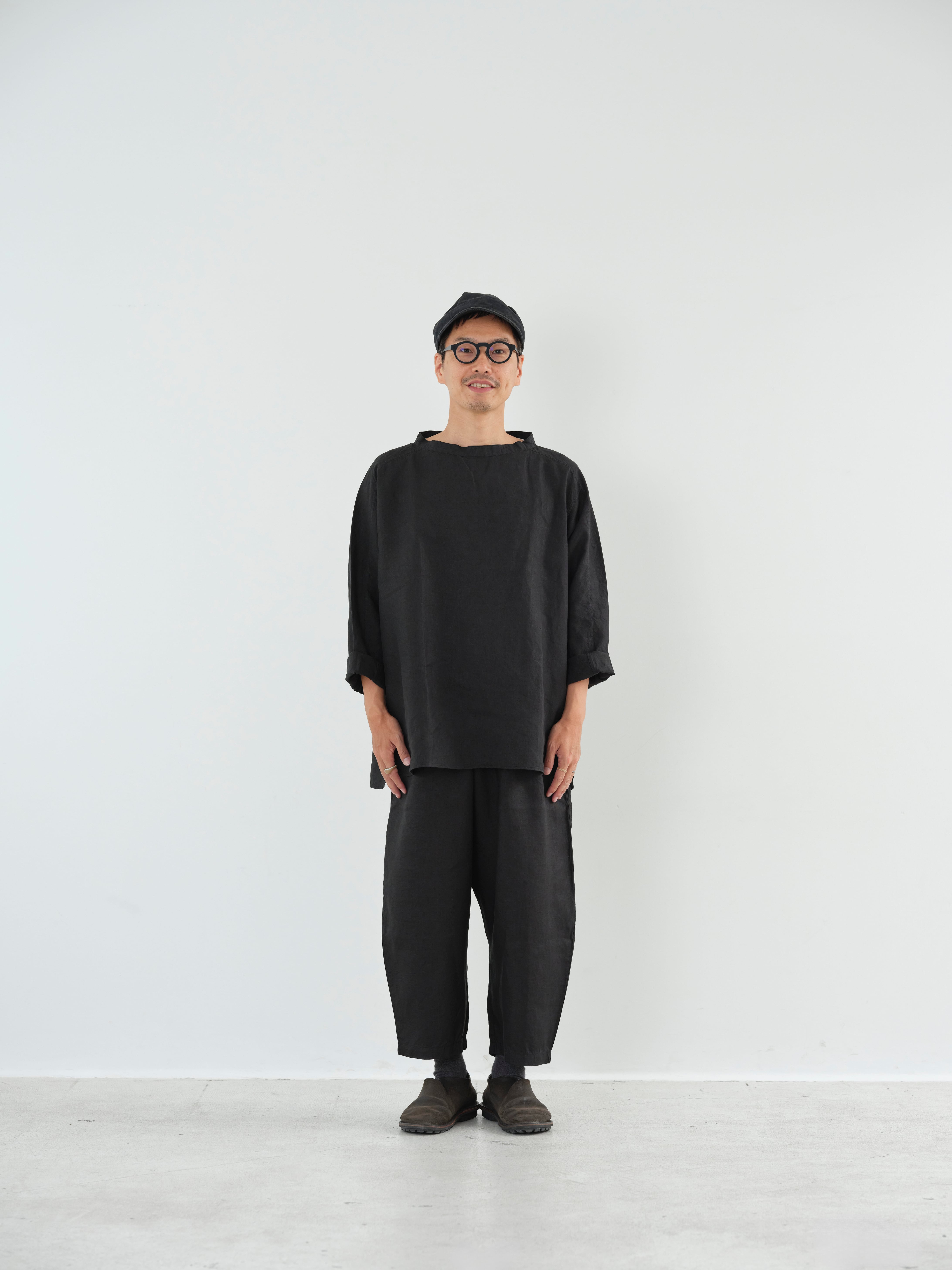 竹は強靭な繊維ですが、そのままだと繊維長が短くて紡績ができない為、綿と混ぜて紡績し、その糸を経緯に使用して平織りにした生地を使用しています。定番で展開している竹の糸に強撚をかけることでシボ感を表現しています。糸には自然の凹凸があり、肌にも密着せず、竹のハリ感が長期間持続する事で特に盛夏でも快適に着ることができます。パターンはもんぺやたっつけを参考にしています。股上は深いものの、運動量を確保しているので動きやすいのが特徴で、膝から裾にかけて入っている急なテーパードは、ロールアップによって調整が可能です。機能性を備えながらもシンプルなデザインの為、体型を問わず好みのサイズ感を選んでいただけます。腰紐には京都・宇治で製紐したオリジナルの紐を、縫製にはロックミシンに至るまですべて綿糸を使用しています。