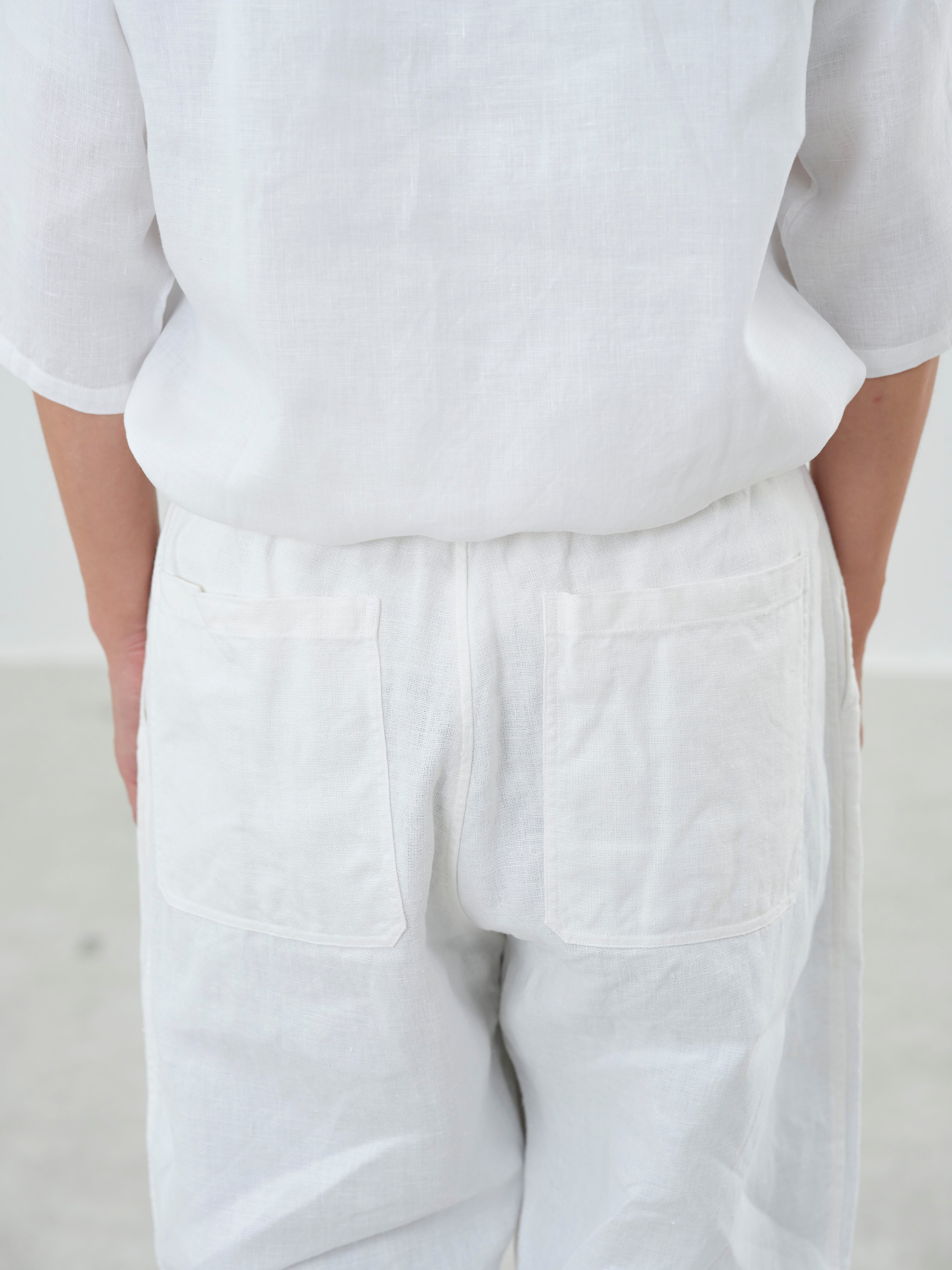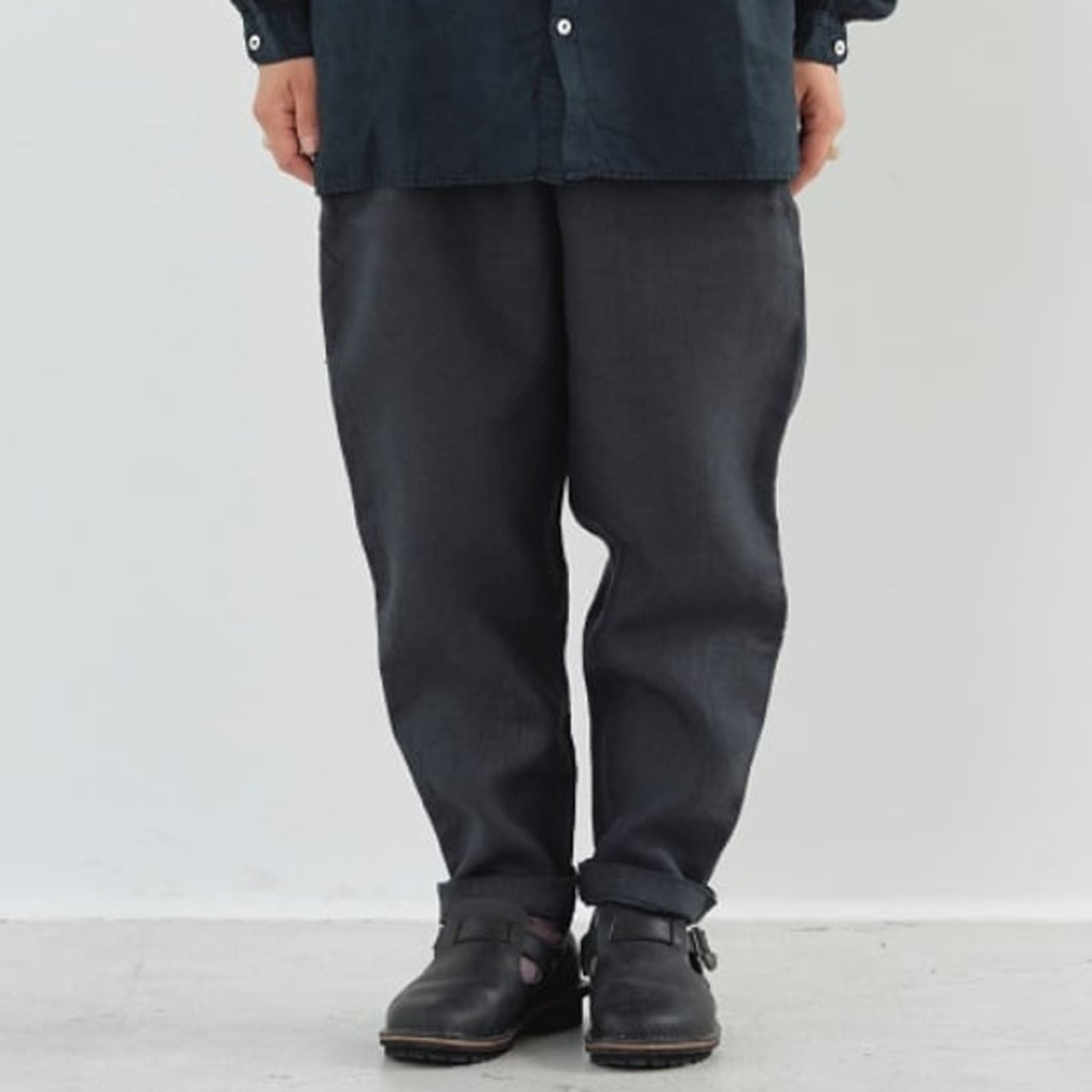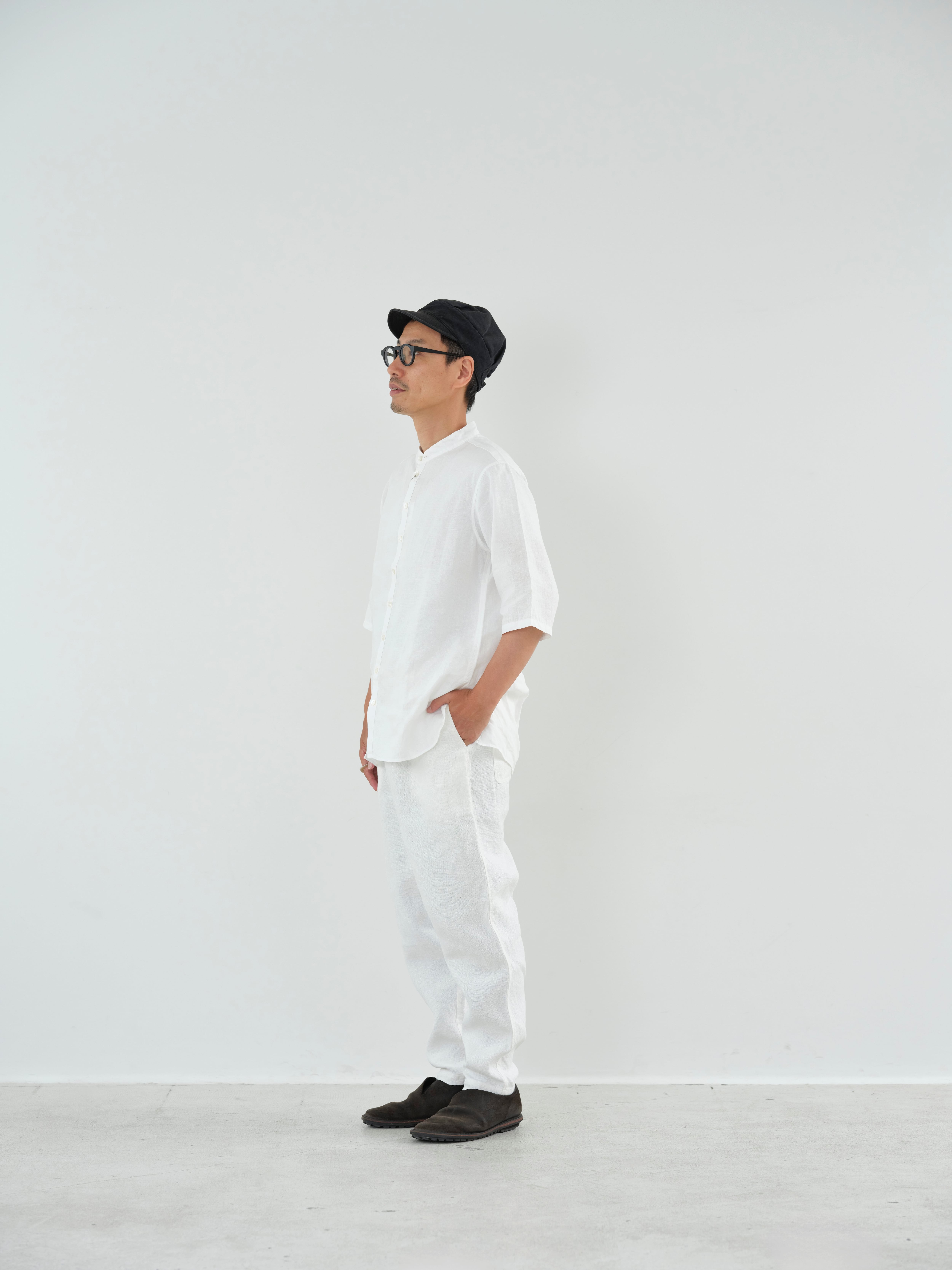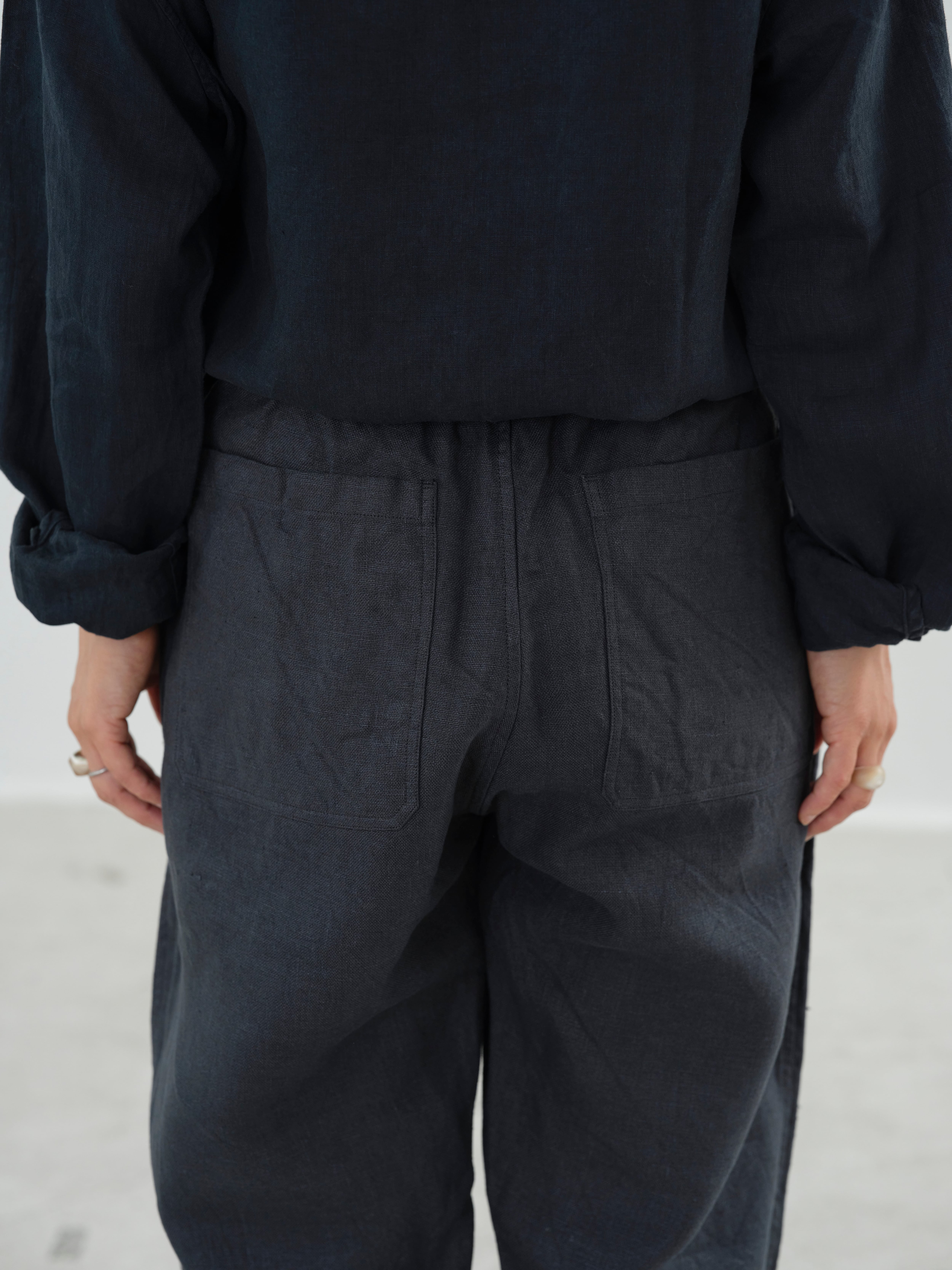大麻100%の糸を経糸、緯糸に使用しています。通常使用している大麻生地よりも太い番手の為、しっかりとした厚手の生地になります。大麻は強靭な繊維ですが、経年変化で肌に徐々に馴染んでゆき、麻から綿のような質感の変化が楽しめます。大麻の特性であるひんやりとした触感は洗濯を繰り返しても継続し、真夏でも快適に着用が可能です。大麻布の歴史については近世麻布研究所所長 吉田真一郎氏の記事に、大麻・苧麻・亜麻の違いはボーケンさんの記事に詳しいので参照ください。もんぺを参考にした、広いワタリからかなりきつめのテーパードを入れたシルエットが特徴で、股下にマチを入れることで運動量を確保しています。他のパンツに比べて、深いフロントポケットとバックポケットが特徴で、ウエストの紐にはオーガニックコットンを使用しています。