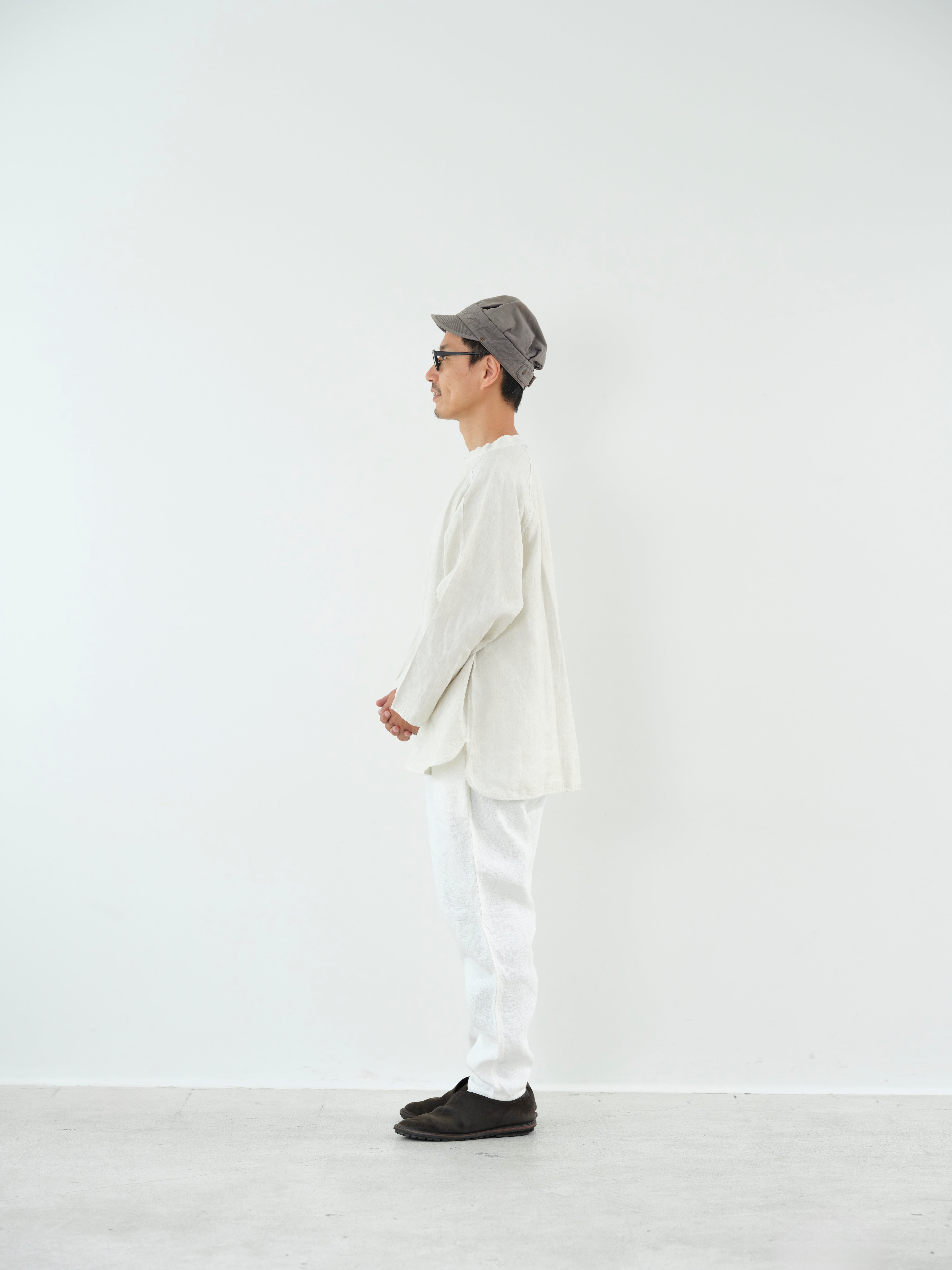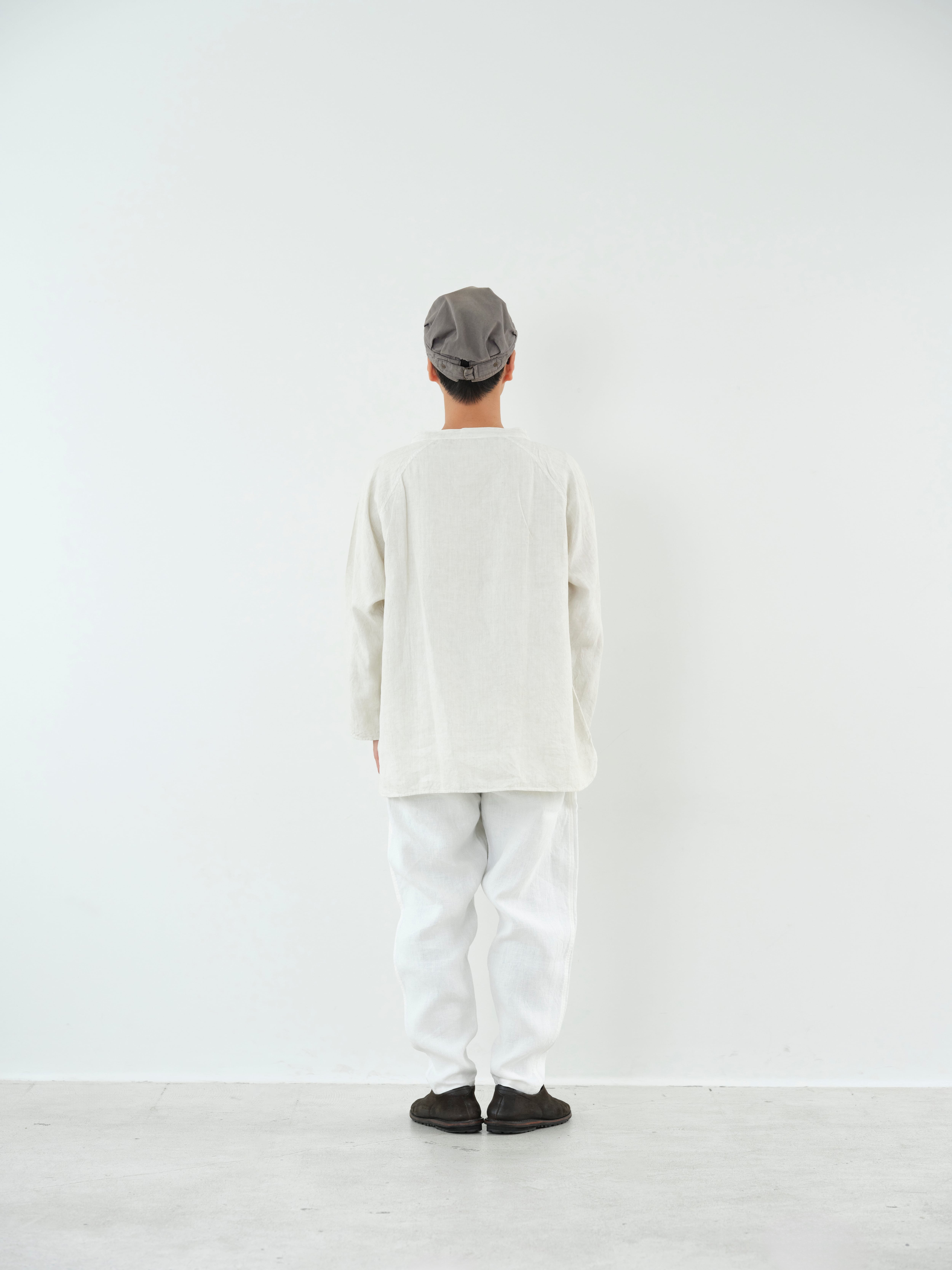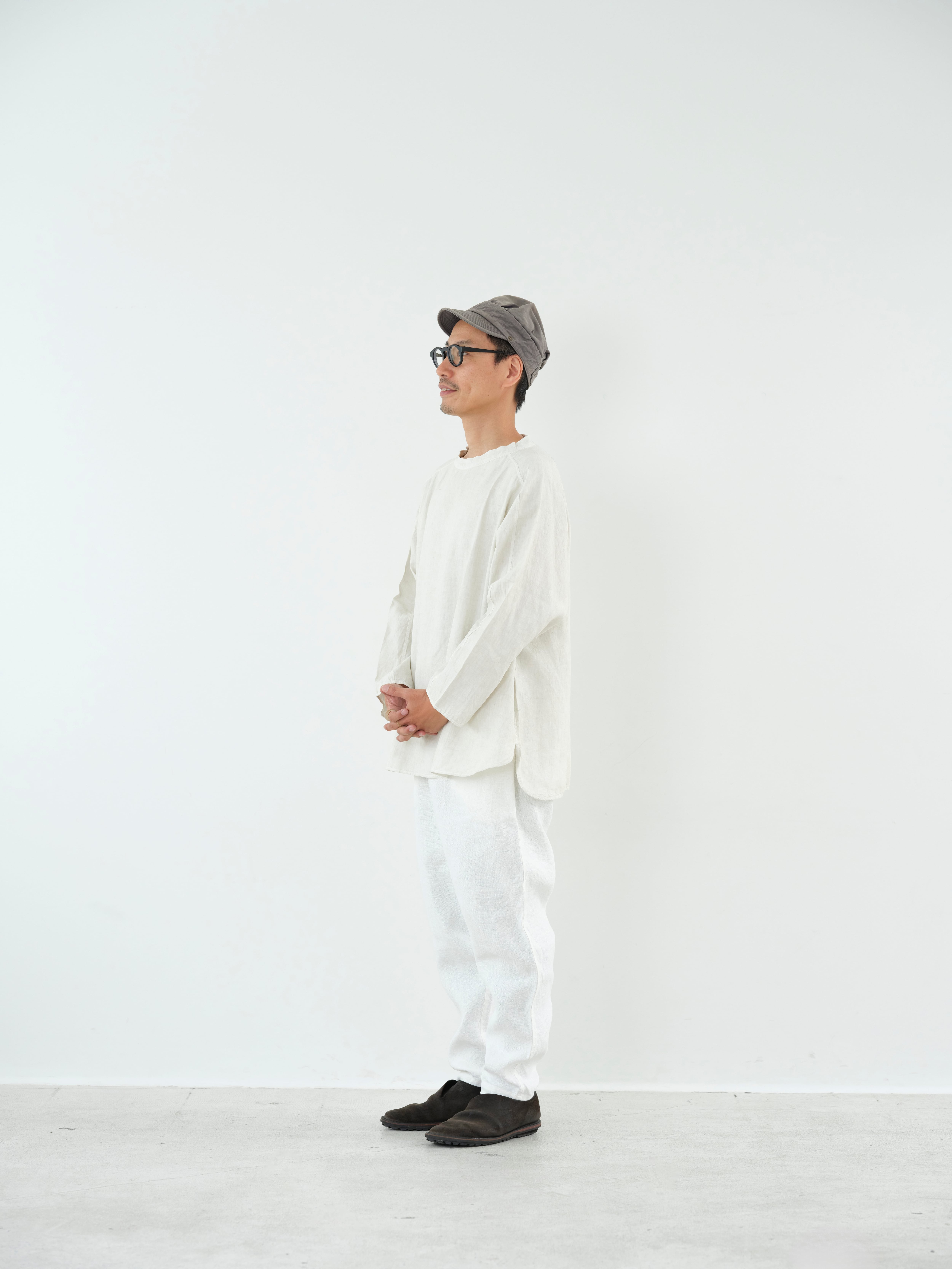 大麻100%の糸を経糸、緯糸に使用しています。通常使用しているの大麻生地よりも細い番手の為、織密度があり、より上質な表情となっています。大麻は強靭な繊維ですが、経年変化で肌に徐々に馴染んでゆき、麻から綿のような質感の変化が楽しめます。大麻の特性であるひんやりとした触感は洗濯を繰り返しても継続し、真夏でも快適に着用が可能です。大麻布の歴史については近世麻布研究所所長 吉田真一郎氏の記事に、大麻・苧麻・亜麻の違いはボーケンさんの記事に詳しいので参照ください。オーバーサイズのプルオーバーで、身体と生地の空間を多くとることで着ていないかのような解放感があります。スプリットラグランスリーブによって程よい運動量が確保されていて、洗濯を繰り返しても綺麗に立つ衿元がTシャツよりもきちんとした印象を与えています。