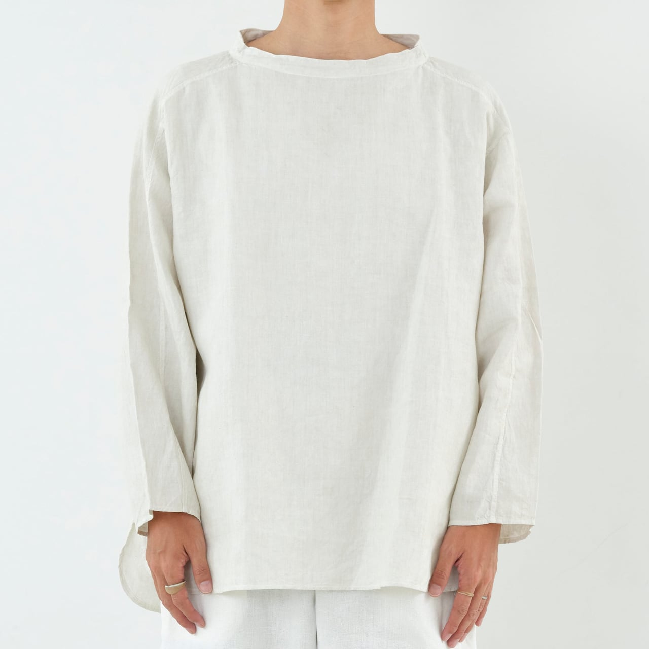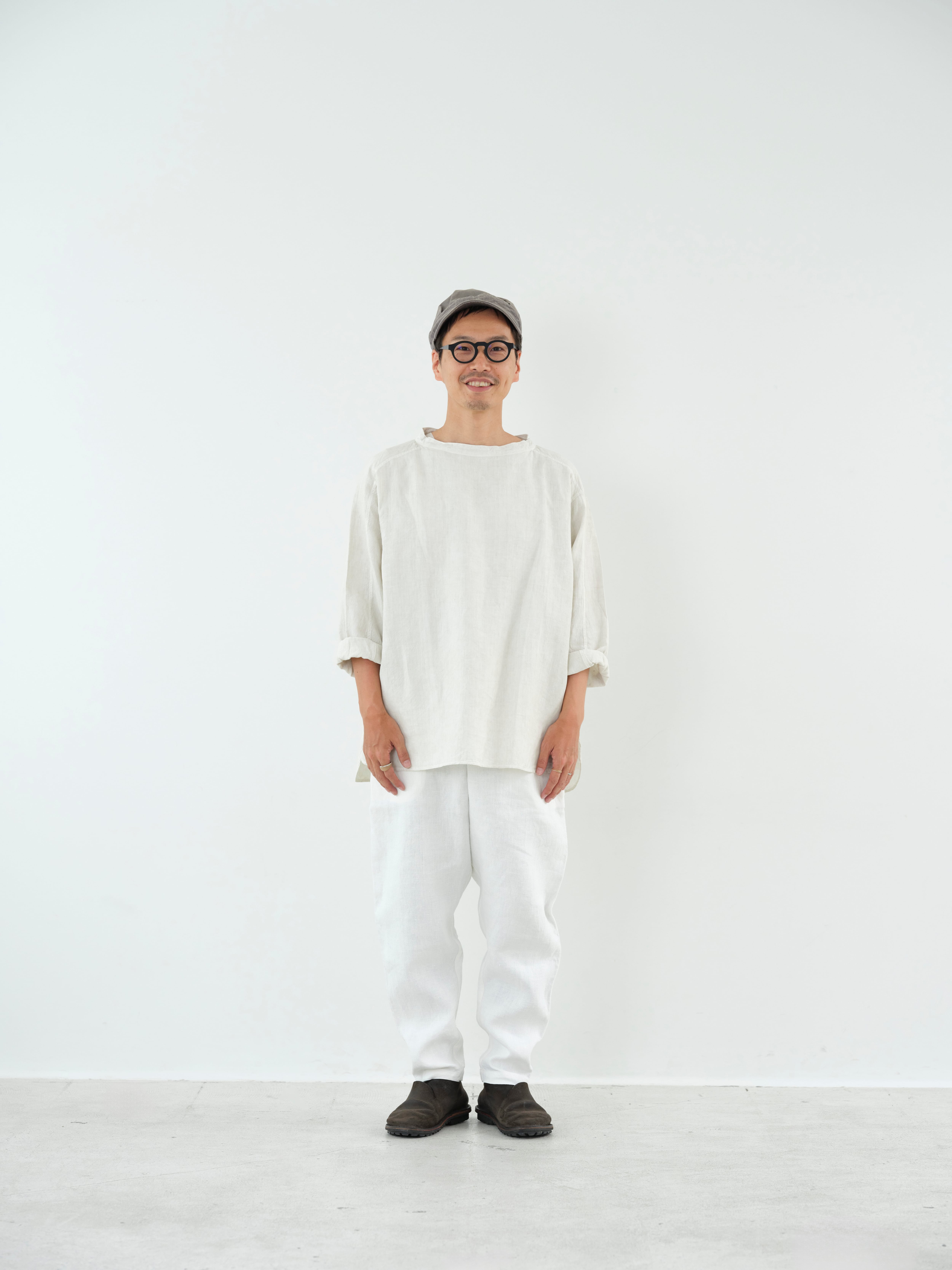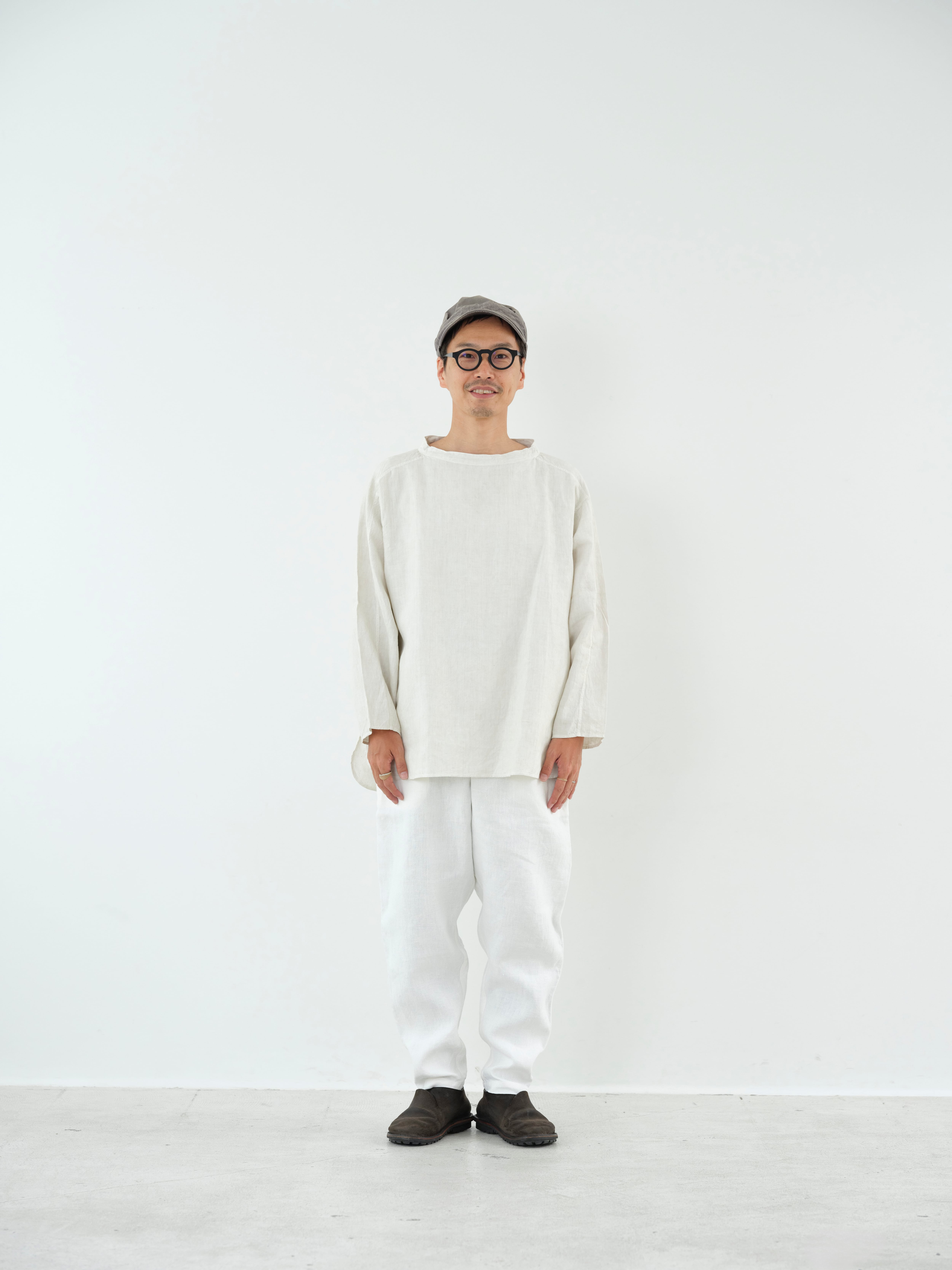 大麻100%の糸を経糸、緯糸に使用しています。通常使用しているの大麻生地よりも細い番手の為、織密度があり、より上質な表情となっています。大麻は強靭な繊維ですが、経年変化で肌に徐々に馴染んでゆき、麻から綿のような質感の変化が楽しめます。大麻の特性であるひんやりとした触感は洗濯を繰り返しても継続し、真夏でも快適に着用が可能です。大麻布の歴史については近世麻布研究所所長 吉田真一郎氏の記事に、大麻・苧麻・亜麻の違いはボーケンさんの記事に詳しいので参照ください。オーバーサイズのプルオーバーで、身体と生地の空間を多くとることで着ていないかのような解放感があります。スプリットラグランスリーブによって程よい運動量が確保されていて、洗濯を繰り返しても綺麗に立つ衿元がTシャツよりもきちんとした印象を与えています。