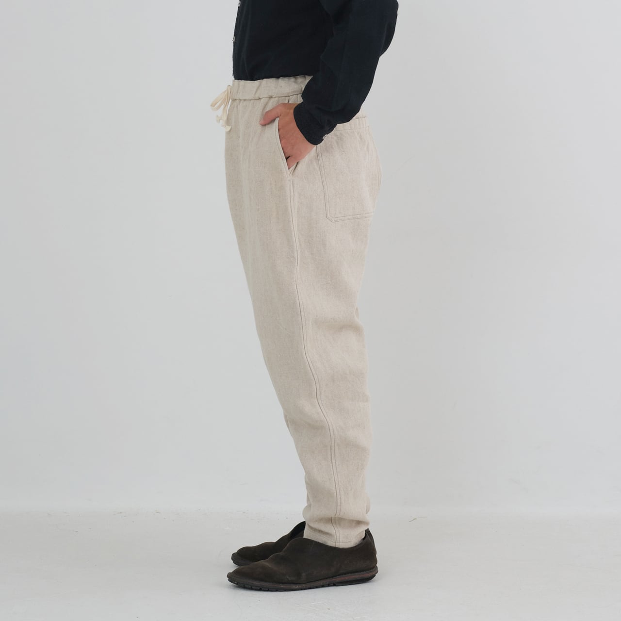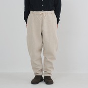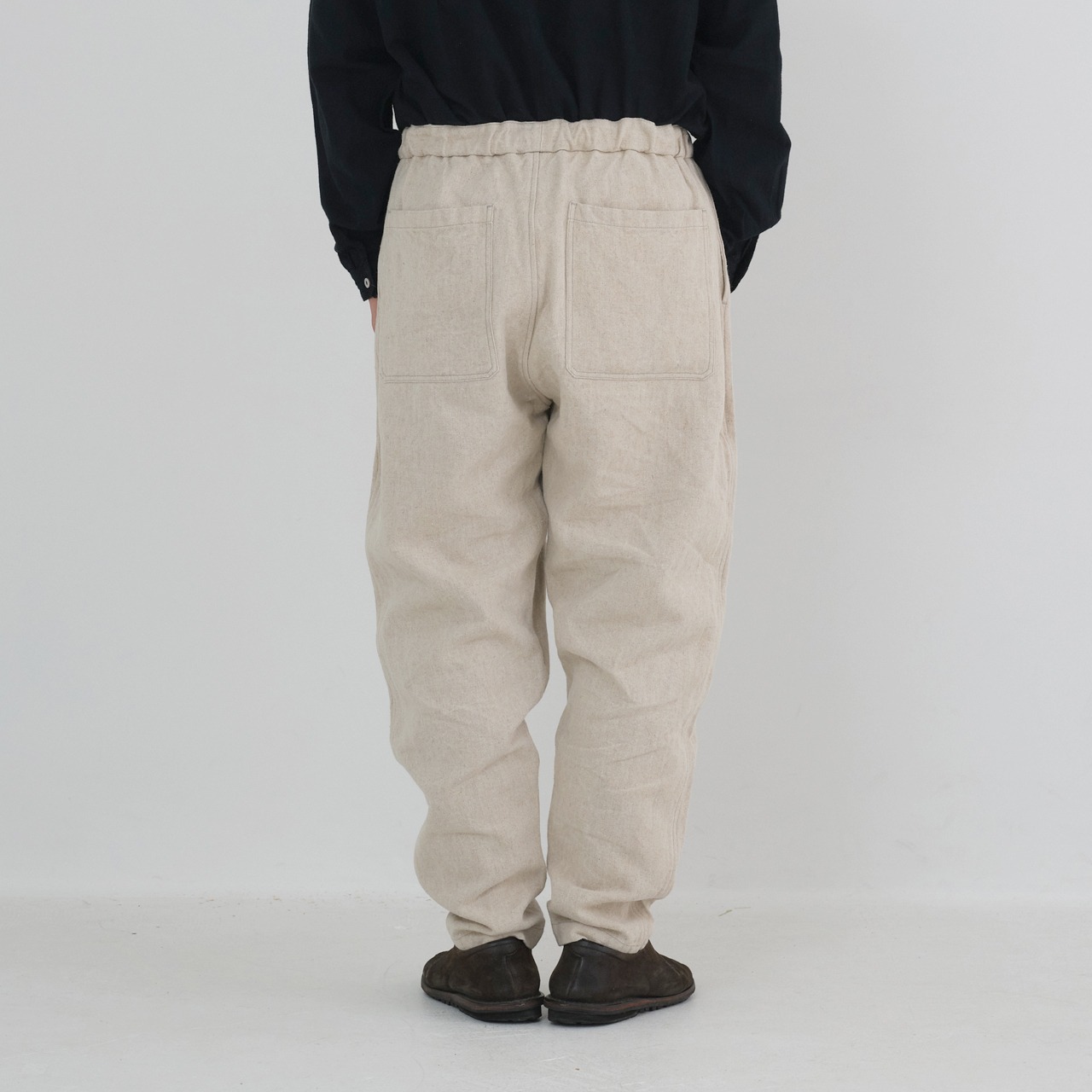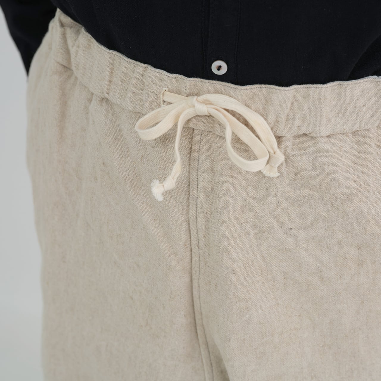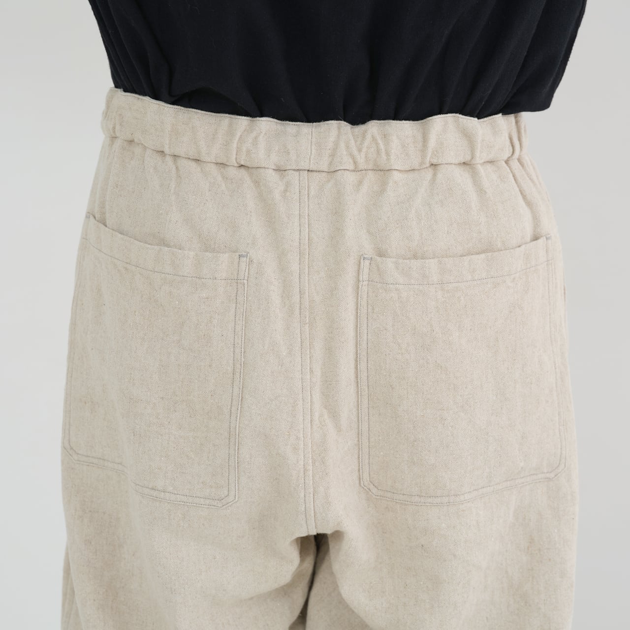 もんぺを参考にした、広いワタリからかなりきつめのテーパードを入れたシルエットが特徴で、股下にマチを入れることで運動量を確保しています。他のパンツに比べて、深いフロントポケットとバックポケットが特徴で、ウエストの紐にはオーガニックコットンを使用しています。ロールアップでの調整も可能で、インナーを調整する事で一年中着用が可能です。