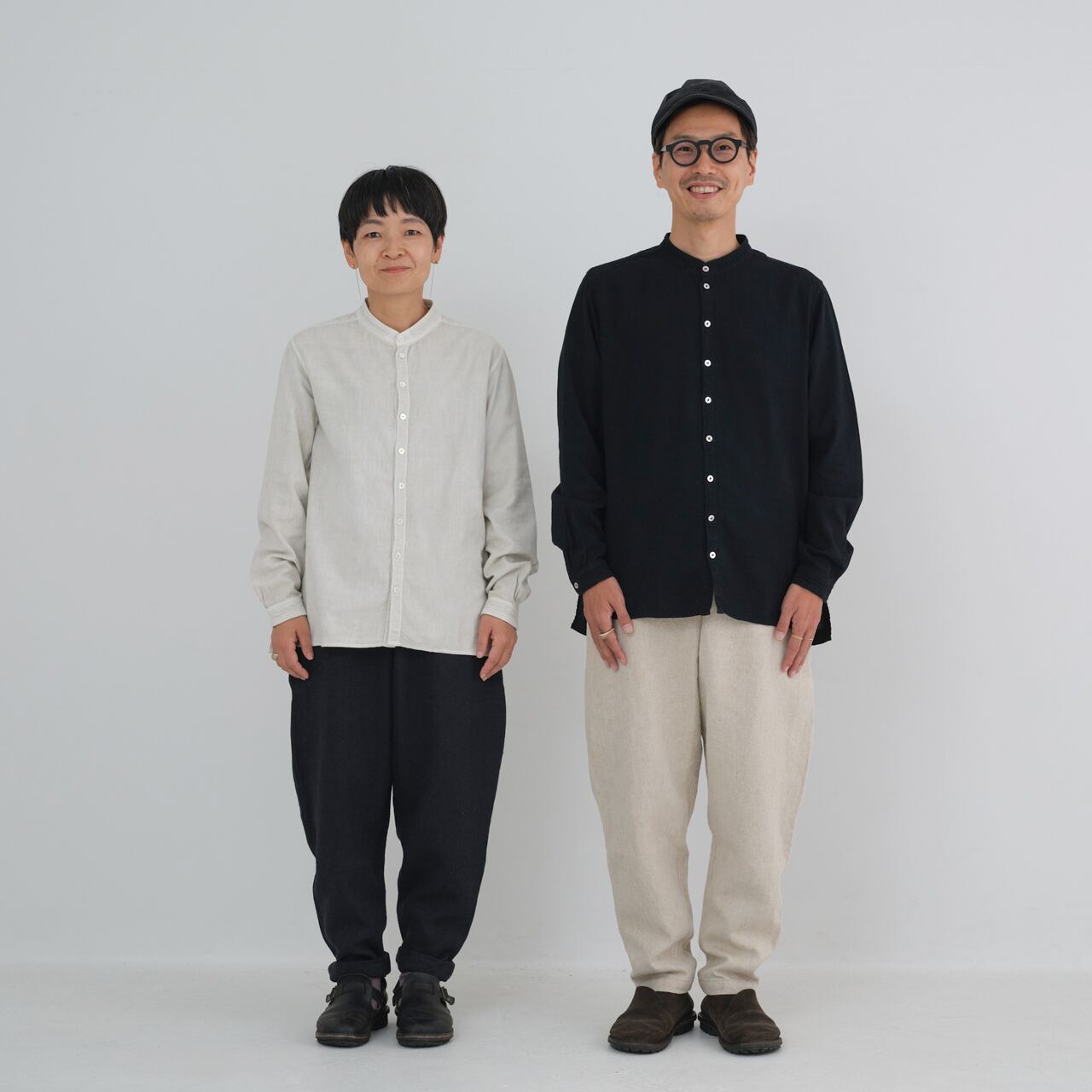 過去に廃盤になったものの、本企画の為に再び生産した生地を使用しています。二種類の麻、亜麻(リネン)と苧麻(ラミー)の国内紡績の混紡糸を経糸と緯糸に使用することでハリ感と適度な厚みが表現されています。また、亜麻独特のたわみ感が苧麻と混紡されることで軽減されています。着用を繰り返すことでまるで古布のような風合いになります。
