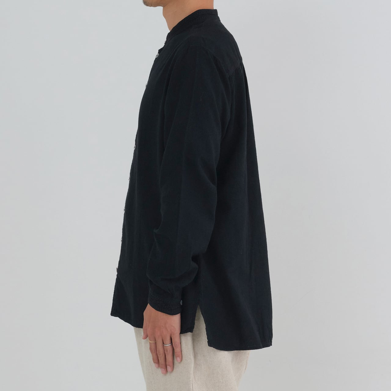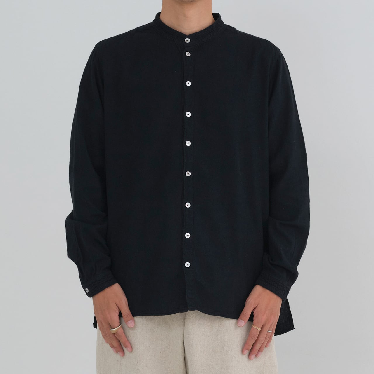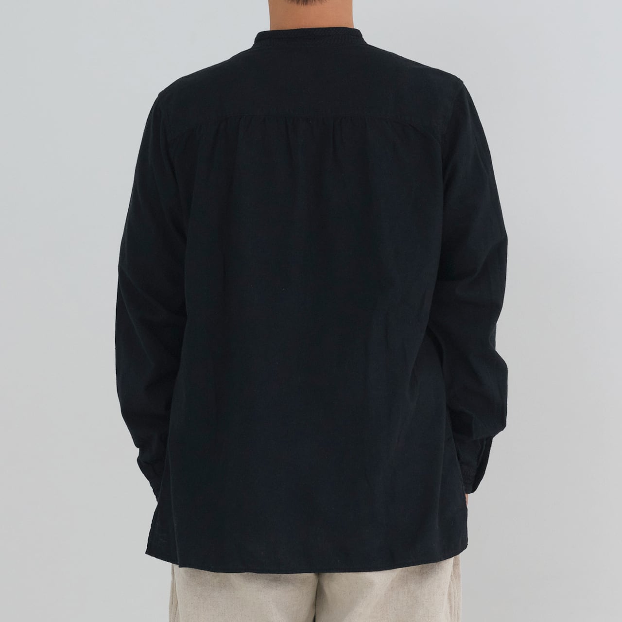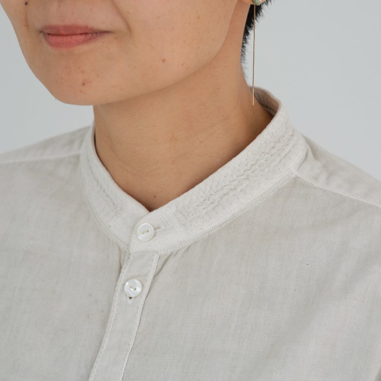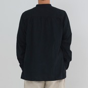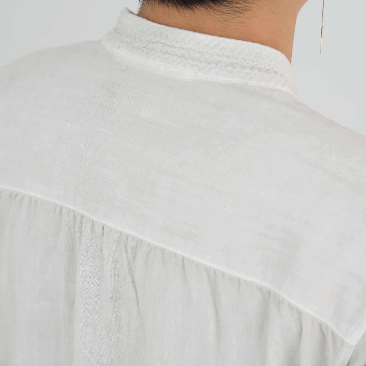 シャツは現代の民族服を構成する洋服としての提案になります。構成は洋服のルールに則りながら、極力デザインを削ぎ落とし、機能性に基づいたパターンメイクとしています。具体的には袖山をいせ込み、袖底を高めに設定することで腕周りの運動量を、背中のヨークにタックやギャザーではなく、いせを入れることで背中の運動量を確保しています。ボタンには貝ボタンを使用しています。