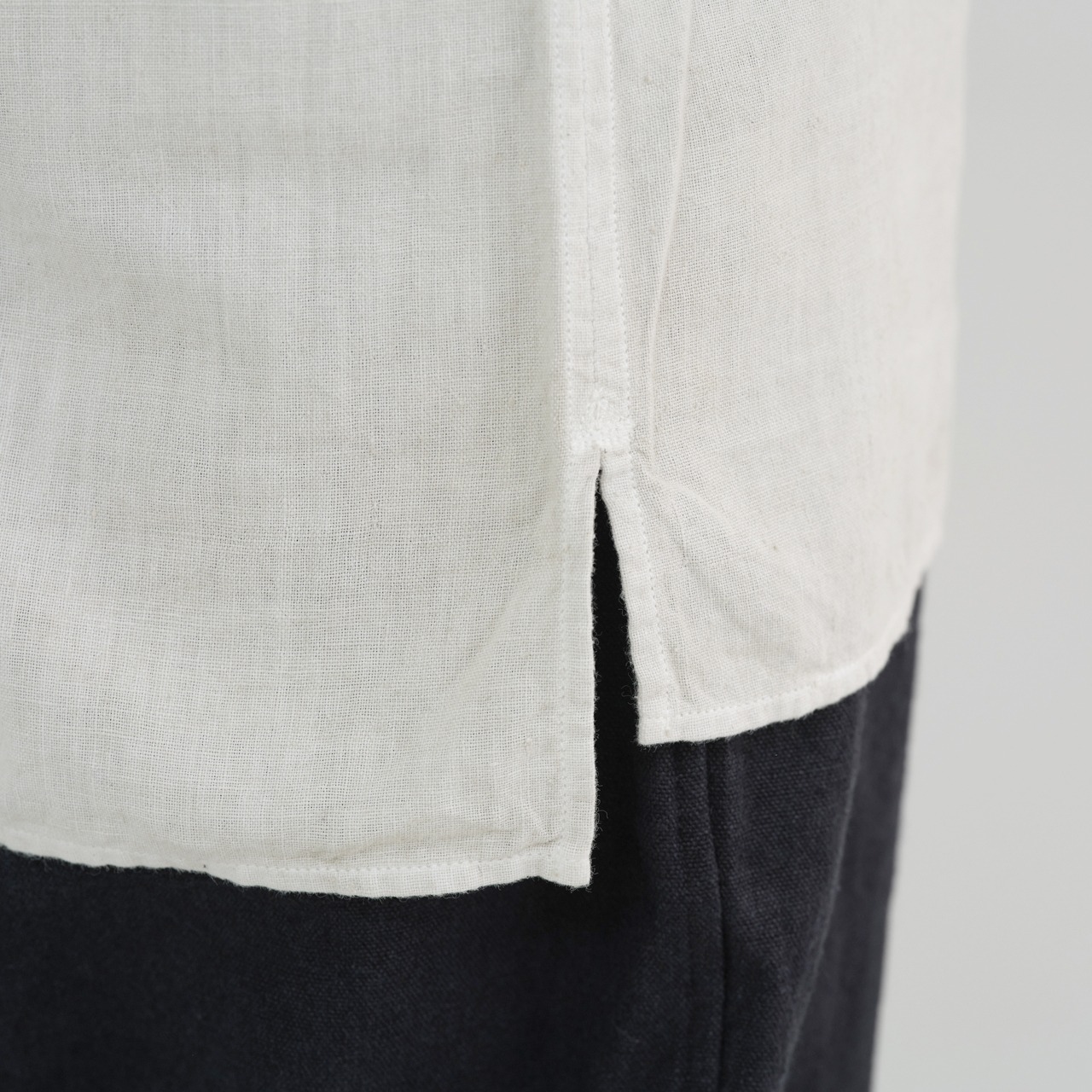 インド・西ベンガルで経糸緯糸共に手紡ぎ、手織りで作られたカディを使用しています。比較的短繊維のデシコットンを手紡ぎ手織りにすることで生まれる不均一性は、もうひとつの肌のような質感で、光に透かしても美しいのが特徴です。時折ランダムに見られるボーダーは、手仕事による細かな糸のロットの変化によって生まれ、それも特徴の一つとなっています。