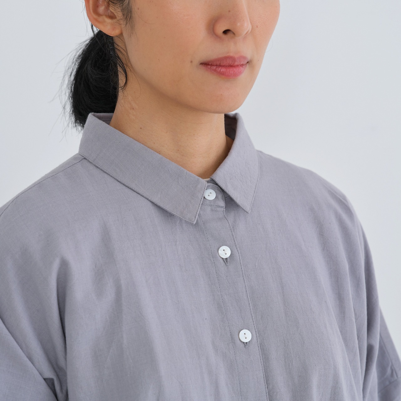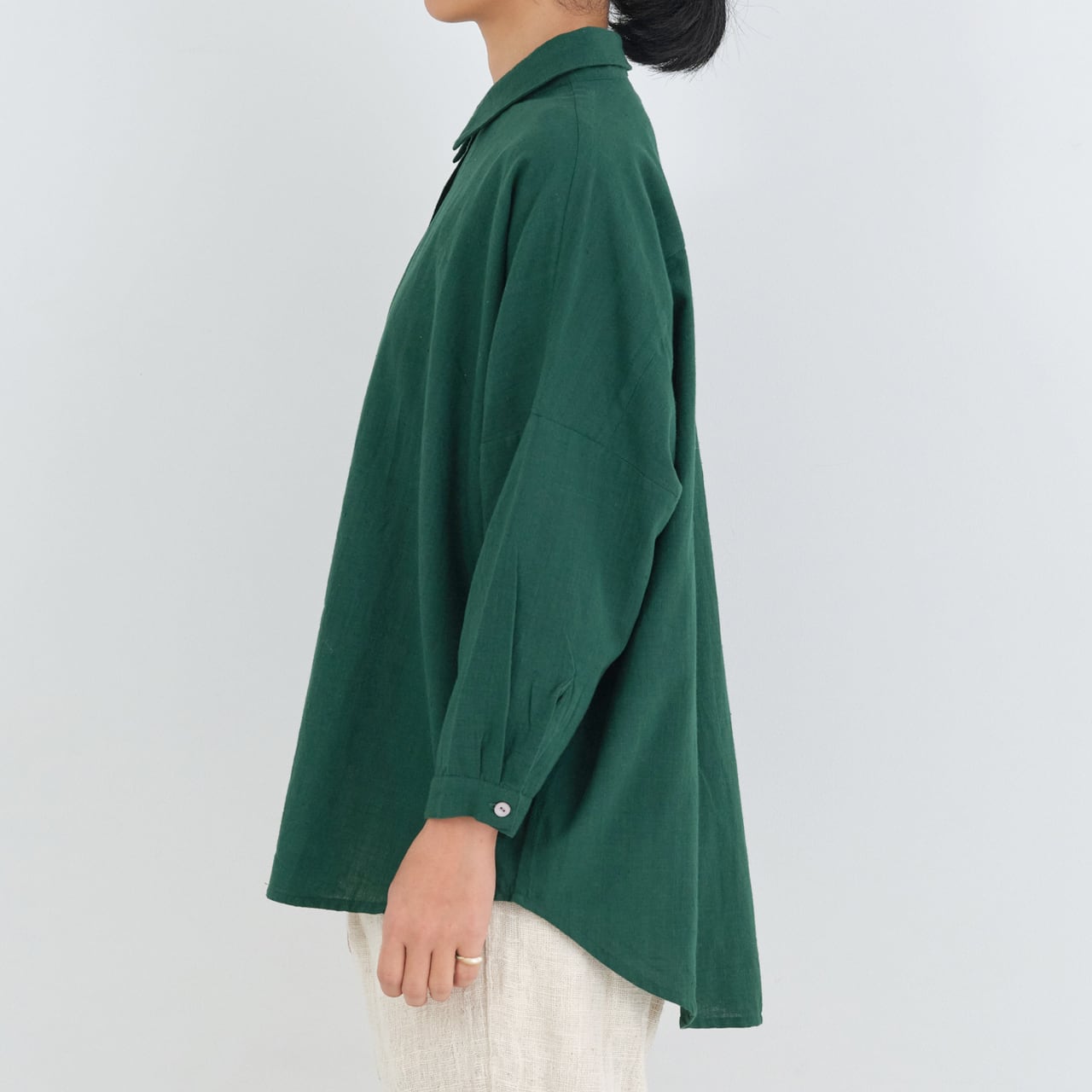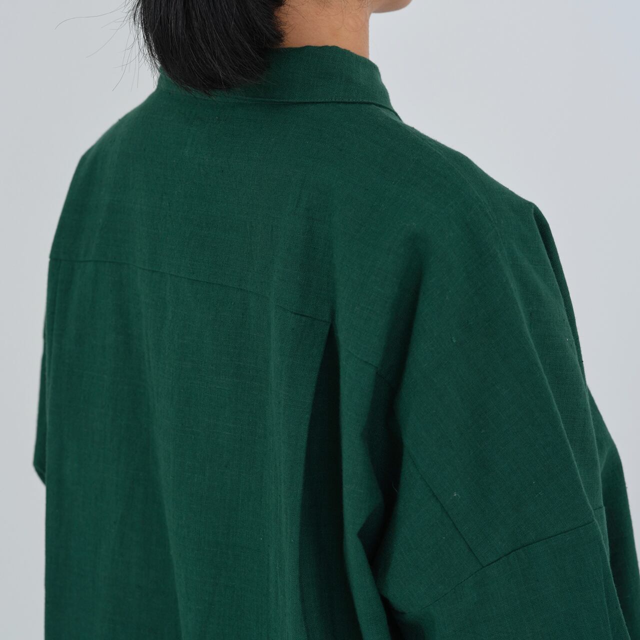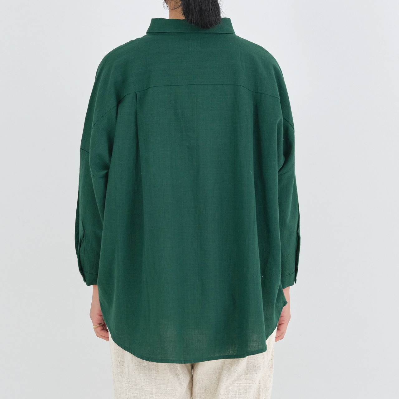 後ろ身頃はやや長めのライン。背中にタックを入れることで、動きやすいつくりになっています。肩や腰回りもゆったりと仕立てられており、華奢な方から大柄の方まで、幅広くおすすめするブラウスです。