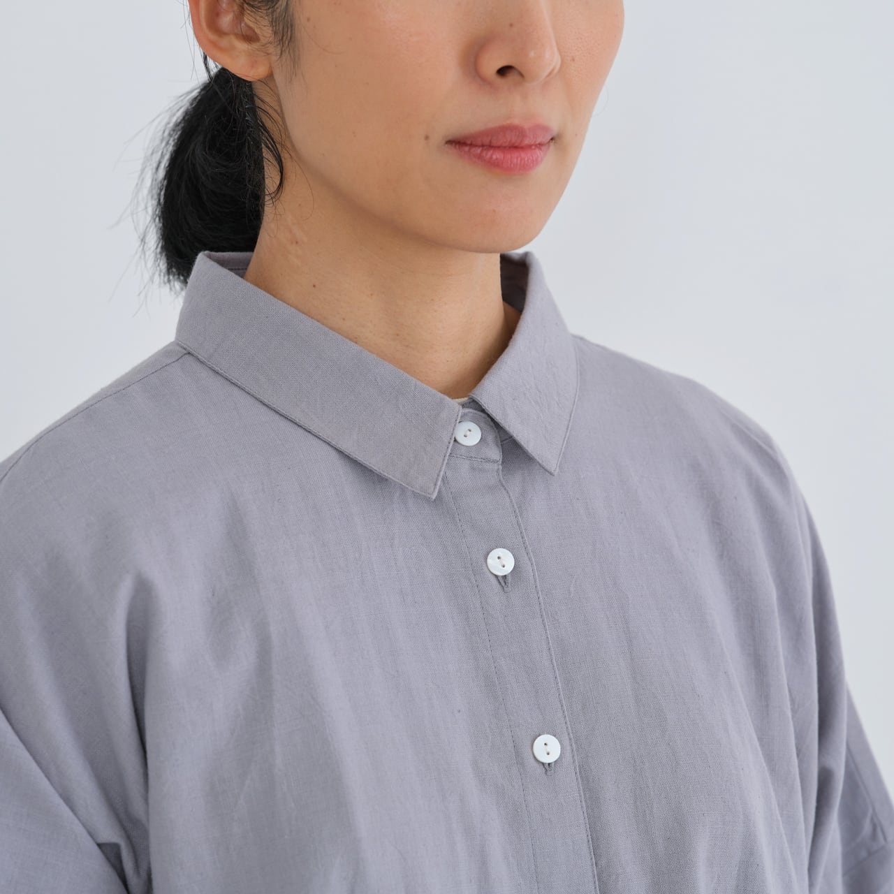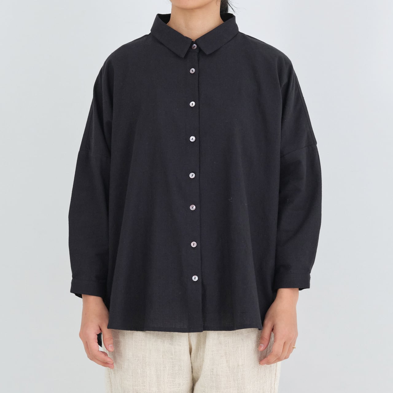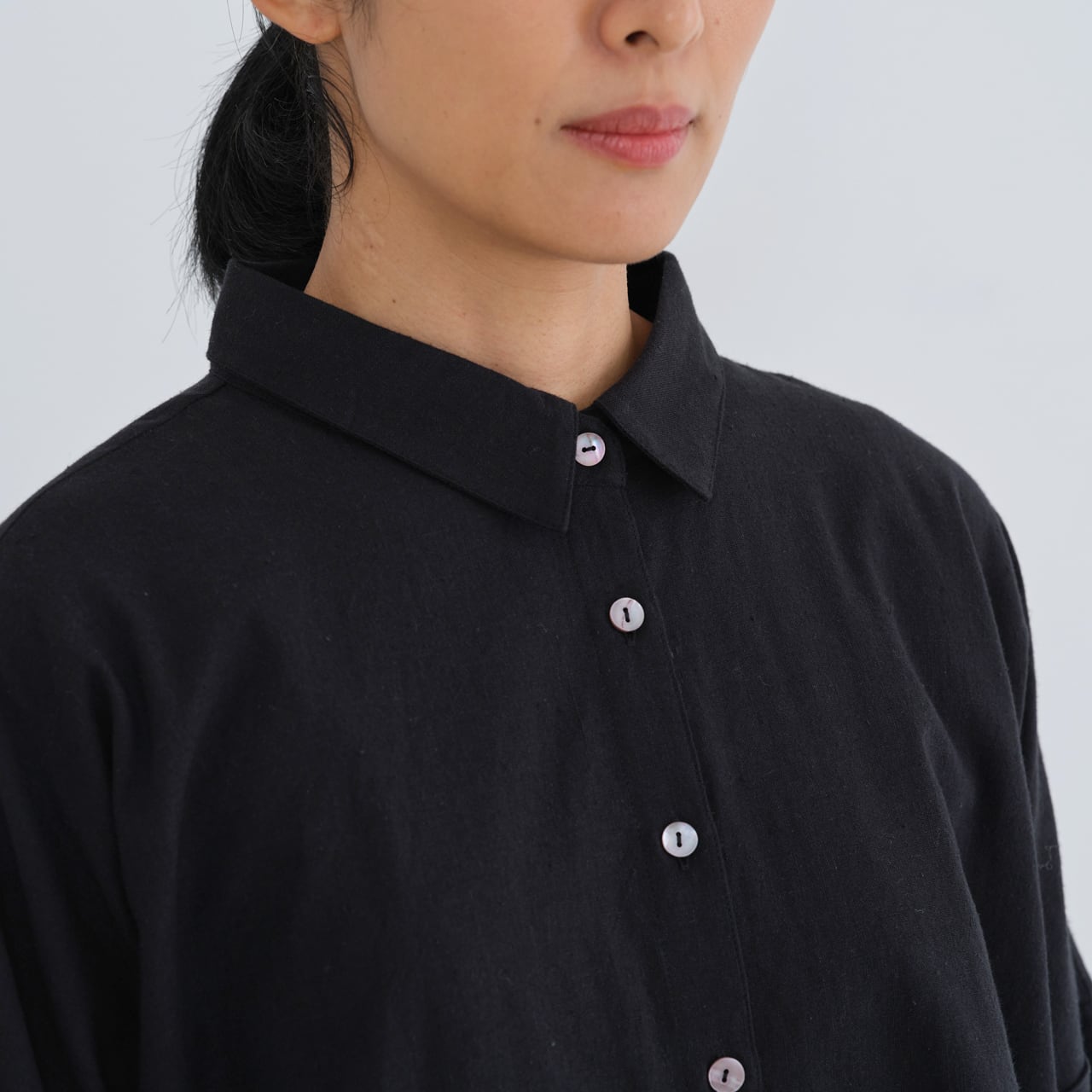 後ろ身頃はやや長めのライン。背中にタックを入れることで、動きやすいつくりになっています。肩や腰回りもゆったりと仕立てられており、華奢な方から大柄の方まで、幅広くおすすめするブラウスです。