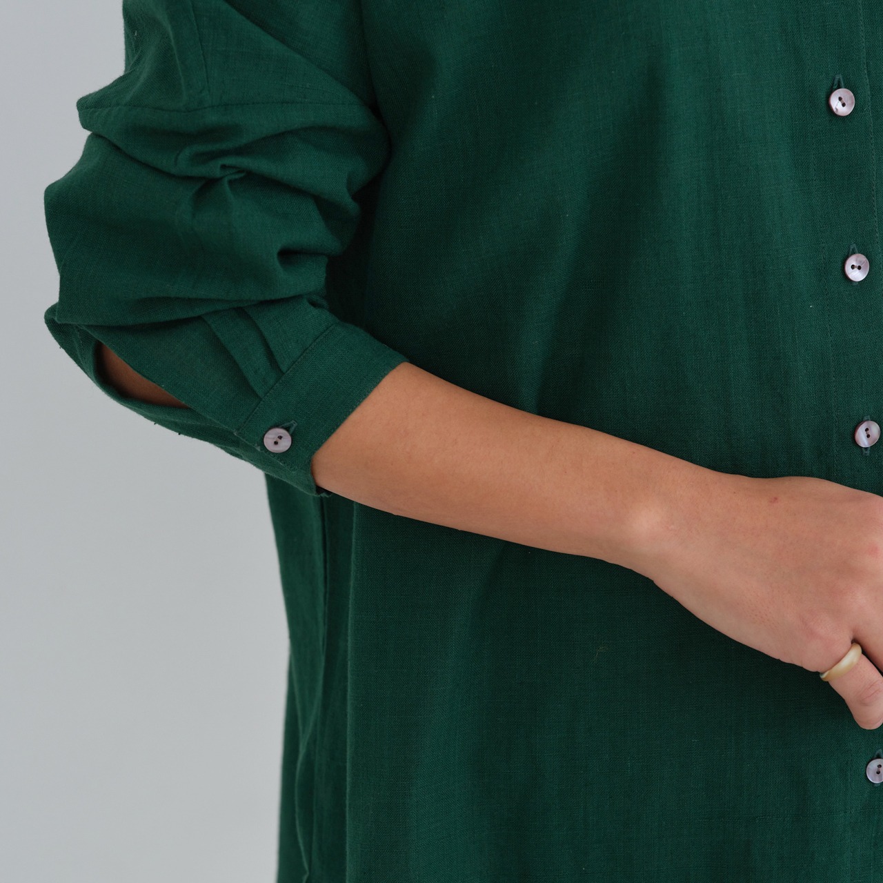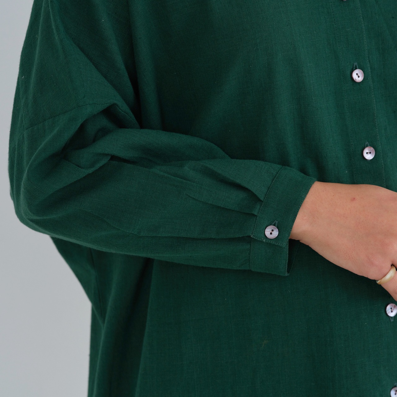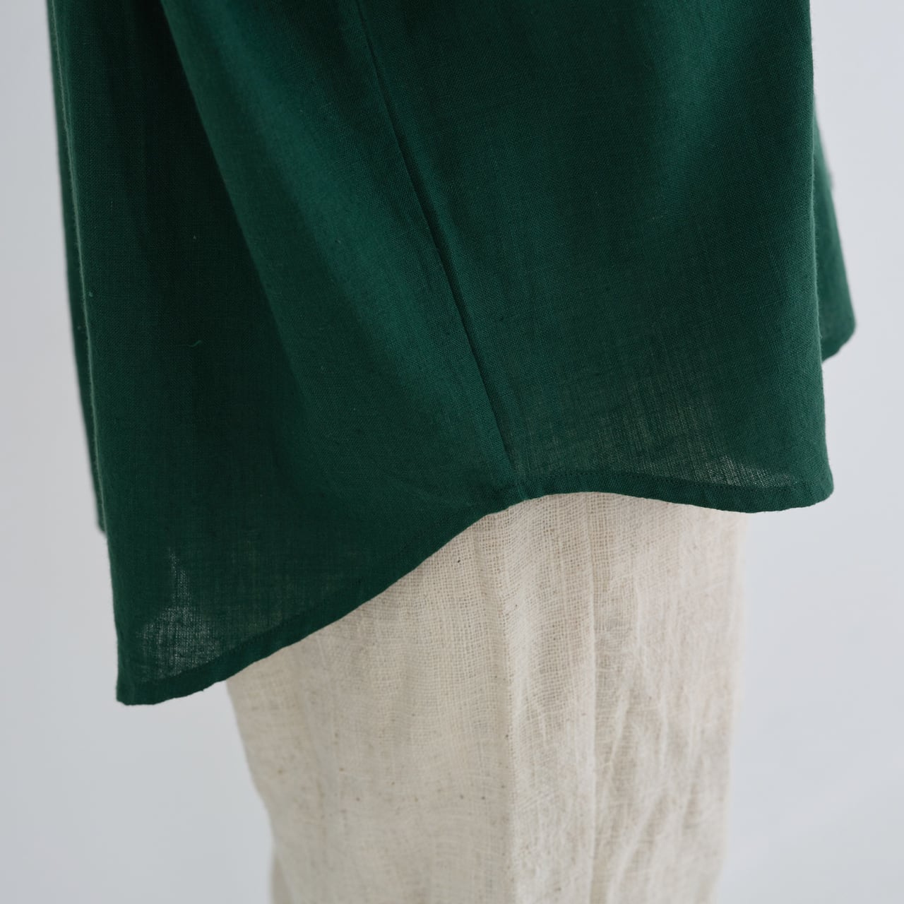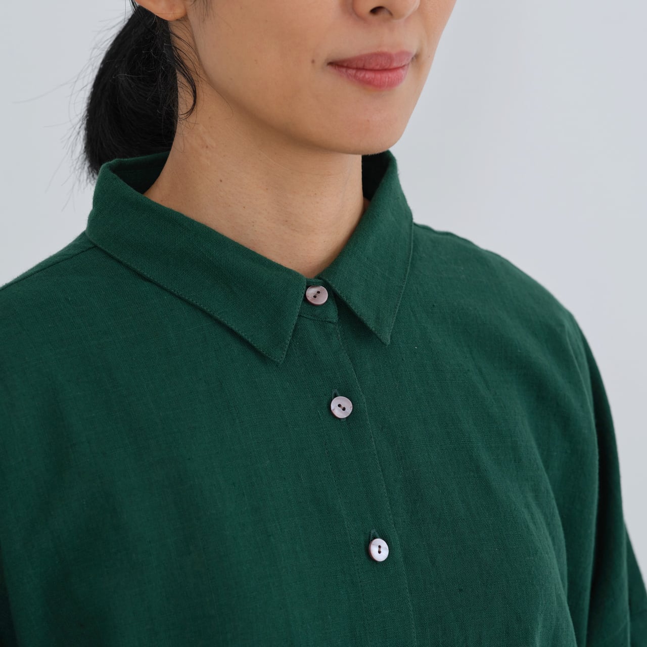 後ろ身頃はやや長めのライン。背中にタックを入れることで、動きやすいつくりになっています。肩や腰回りもゆったりと仕立てられており、華奢な方から大柄の方まで、幅広くおすすめするブラウスです。
