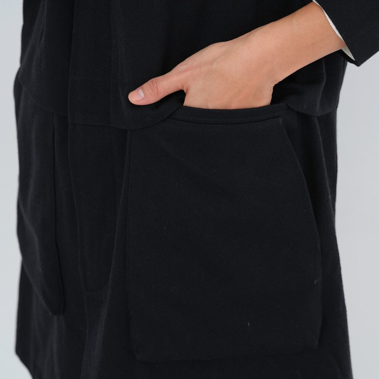 袖を前方に振ったパターンにより腕周りの可動域を確保し、広めの身幅でゆとりあるシルエットを実現しています。二層構造のポケットは、雨蓋付き縦向きポケットと斜めアクセスのハンドウォーマーポケットに分かれ、小物収納と保温機能を独立設計。首元のボタンと衿のループで衿を立てられるため、気温やシーンに応じた着こなしが可能です。表地の緯糸と同じく、裏地にもオーガニックコットン100%の生地を採用しています。