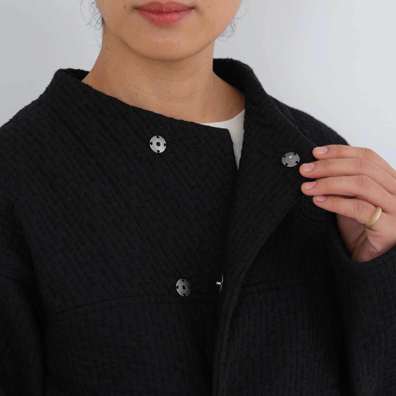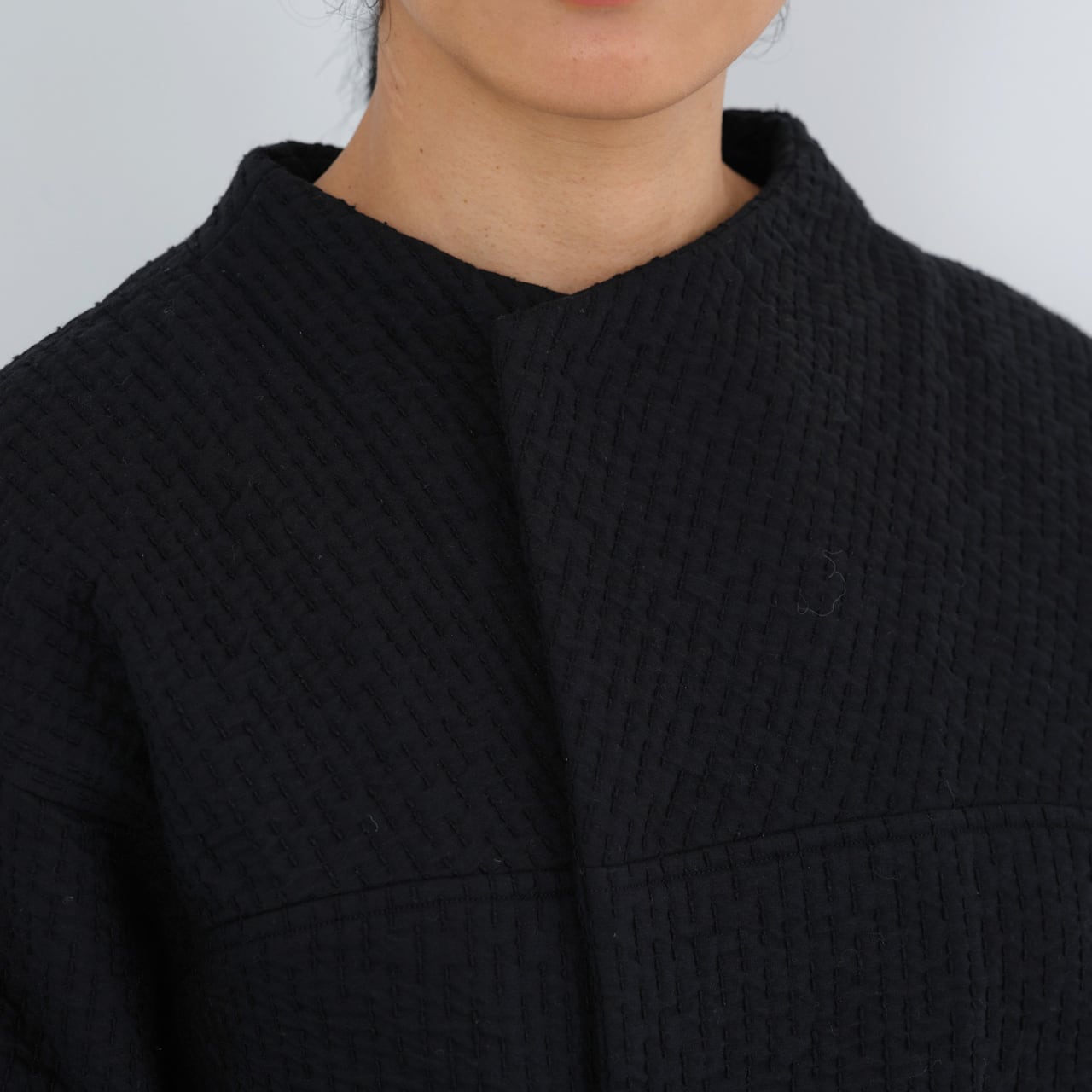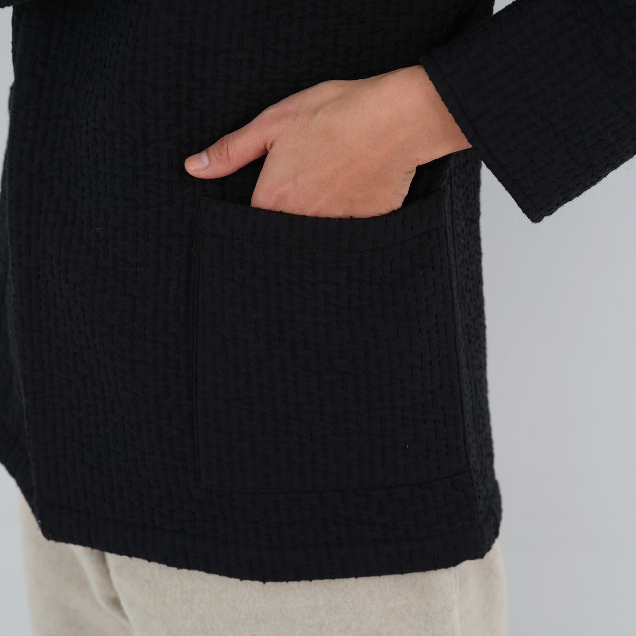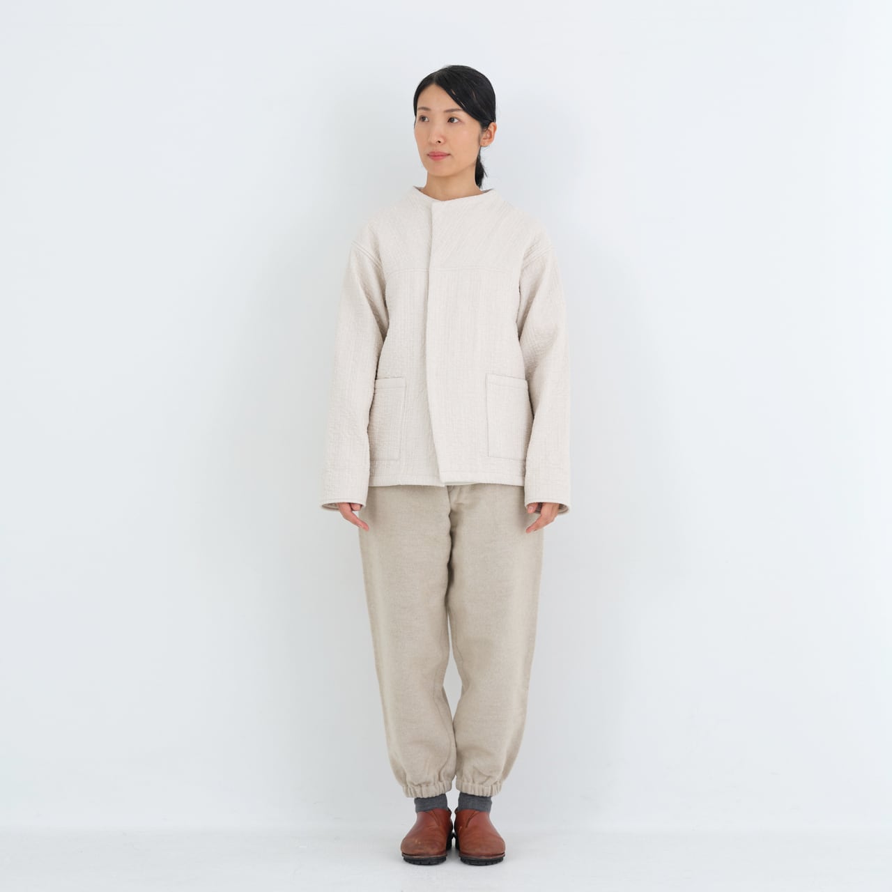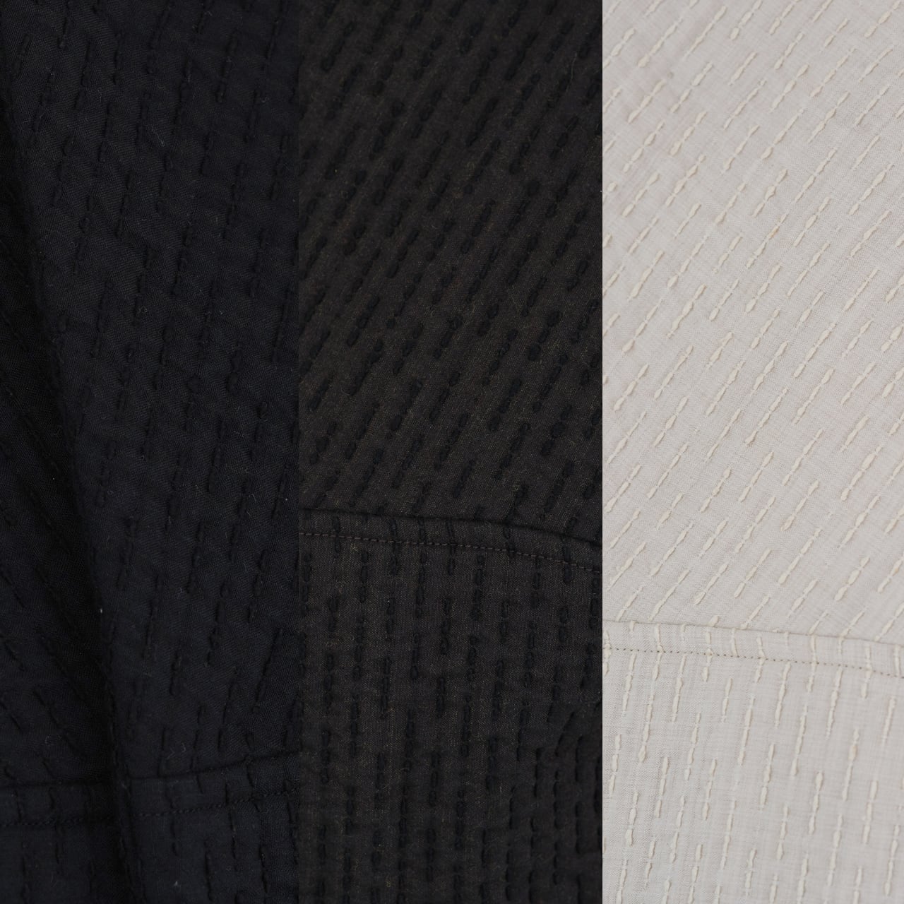 経糸にコットンを使用し、表面、中面、裏面にはそれぞれ異なる緯糸を打ち込んだ、3重構造のオリジナルの生地を使用しています。表面のウールは細く密度を上げて織ることで風の侵入を防ぎ、裏面のシルクの絹紡紬糸はしっかりと吸湿をしながら柔からな肌当たりとなっています。中面にスポンディッシュウールの単糸を経糸と組織せずそのまま飛ばす事で、糸の膨らみが十分に生き、中わたの役目をするようになっています。天然繊維のみで、化繊の中わた生地に引けを取らないくらいの防寒性・快適性を目指した企画となっています。また、表から見える刺し子の部分は織りで表現されていますが、こちらの糸には表情が生まれるよう絹紡紬糸を使用しています。