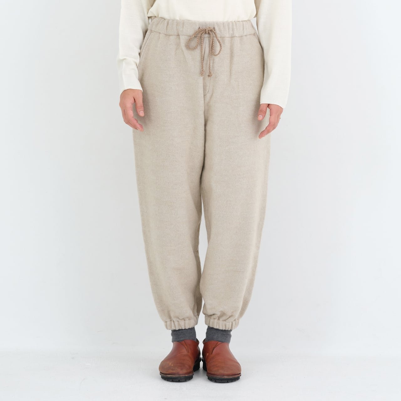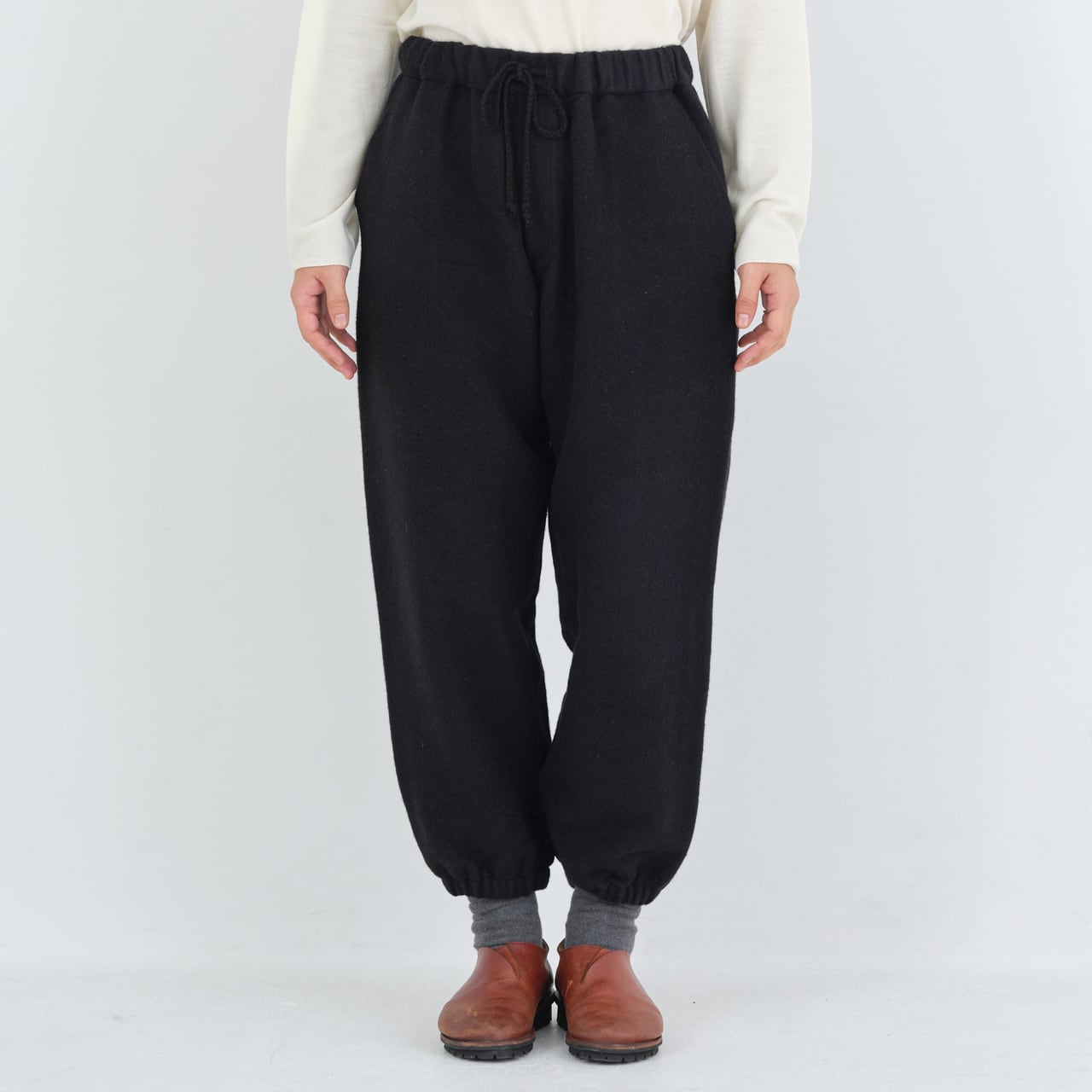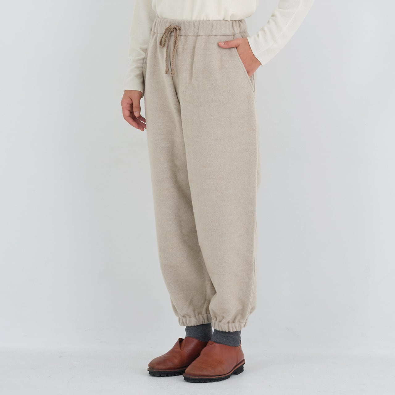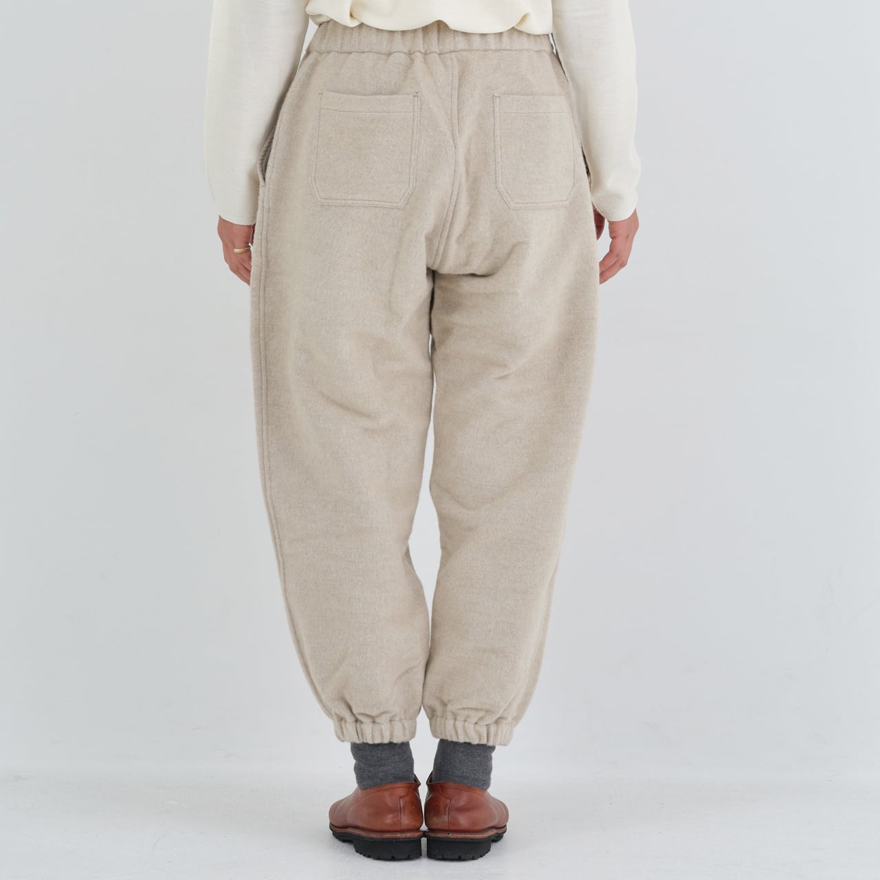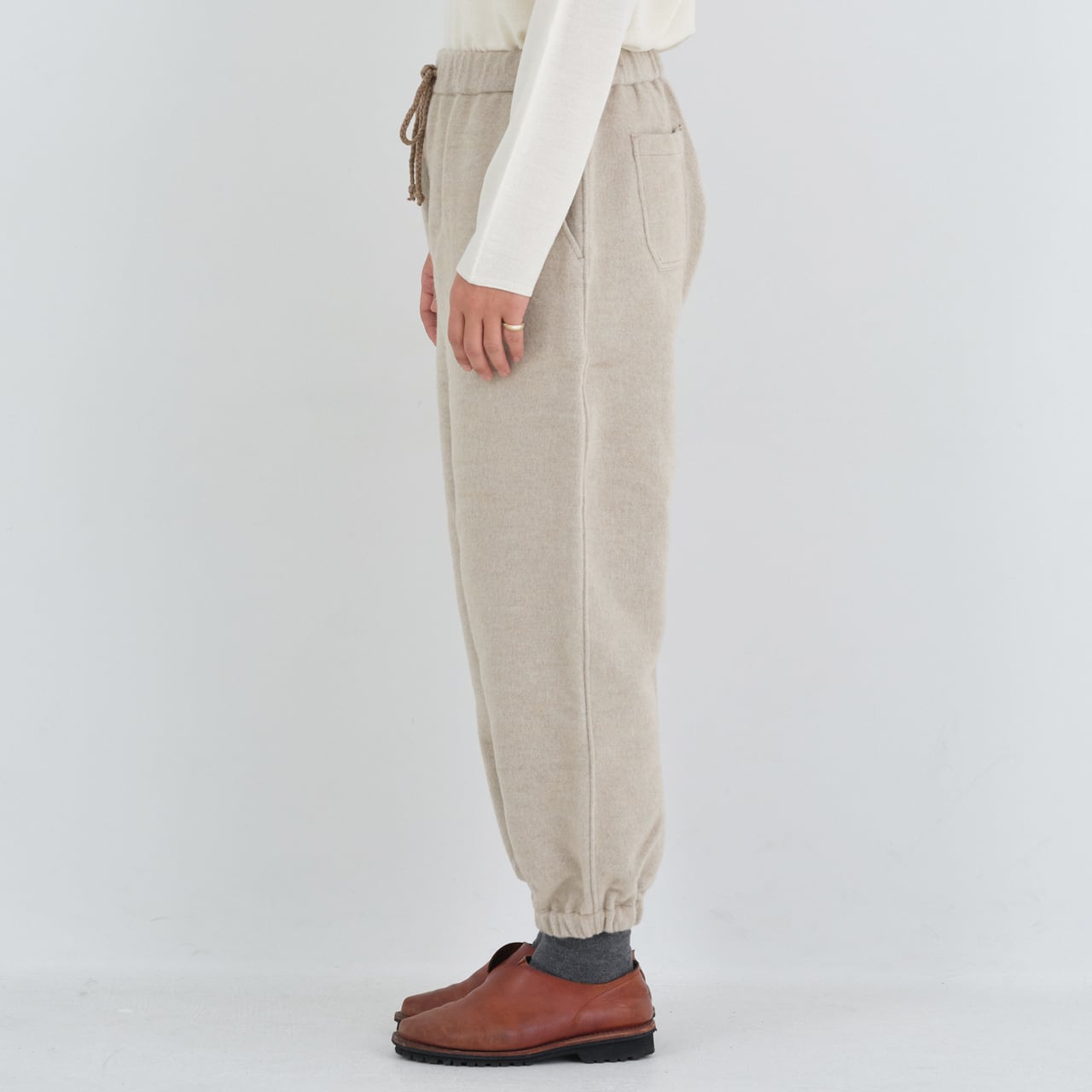 わたり幅を広く設け、裾に向かってテーパードが入るもんぺのようなデザインです。全体的に程よくゆったりとしたシルエットですが、裾のゴムが印象を引き締めています。これにより、足さばきを妨げることなく、快適に動くことができます。また、ベルト裏、ポケット布にはウール100%の生地を使用しています。