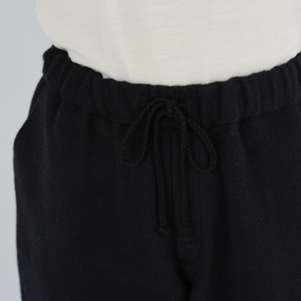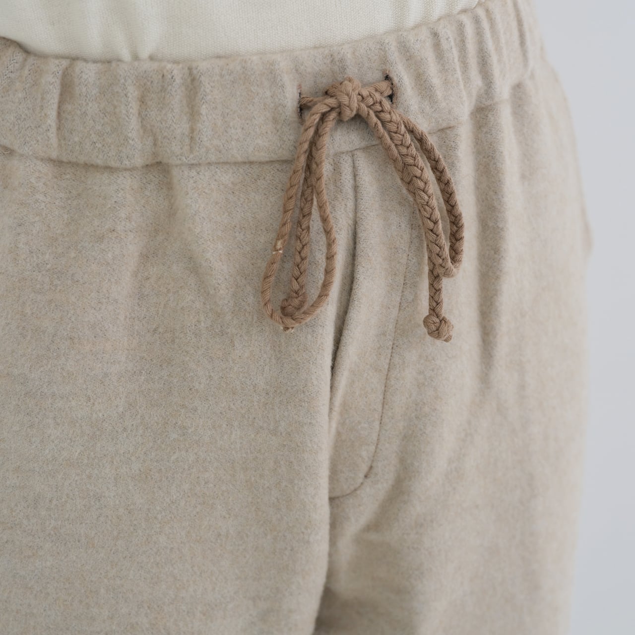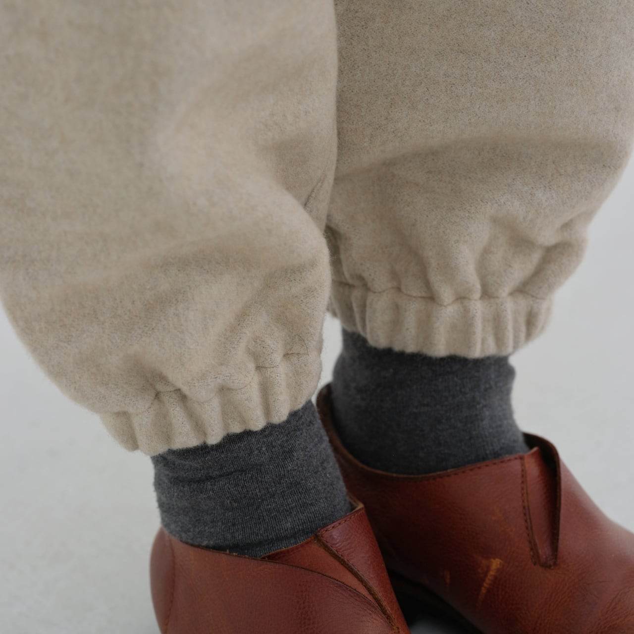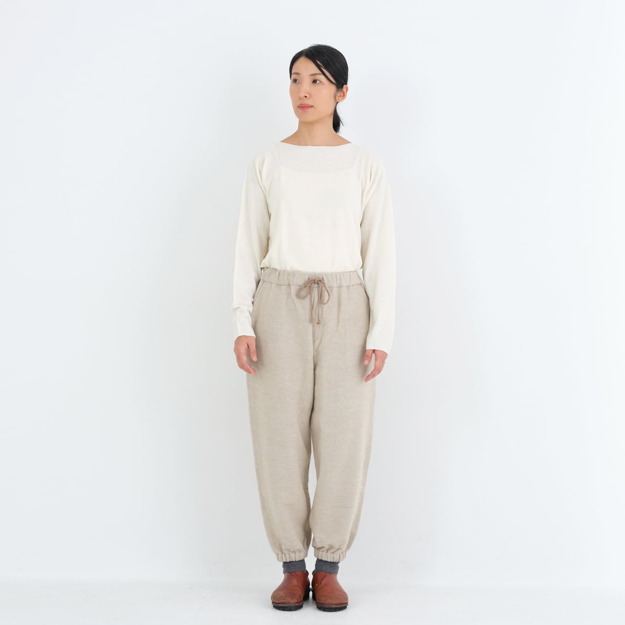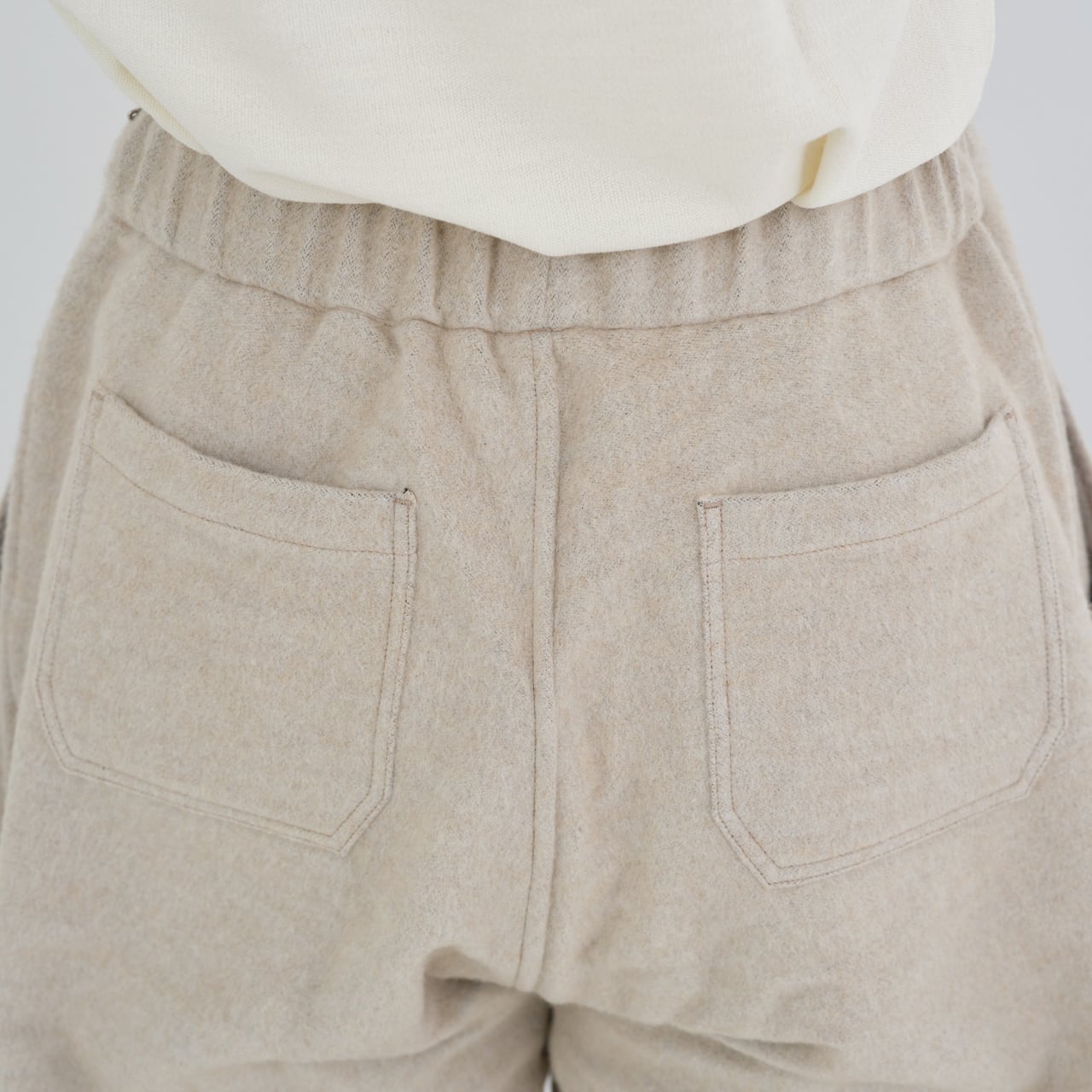 わたり幅を広く設け、裾に向かってテーパードが入るもんぺのようなデザインです。全体的に程よくゆったりとしたシルエットですが、裾のゴムが印象を引き締めています。これにより、足さばきを妨げることなく、快適に動くことができます。また、ベルト裏、ポケット布にはウール100%の生地を使用しています。